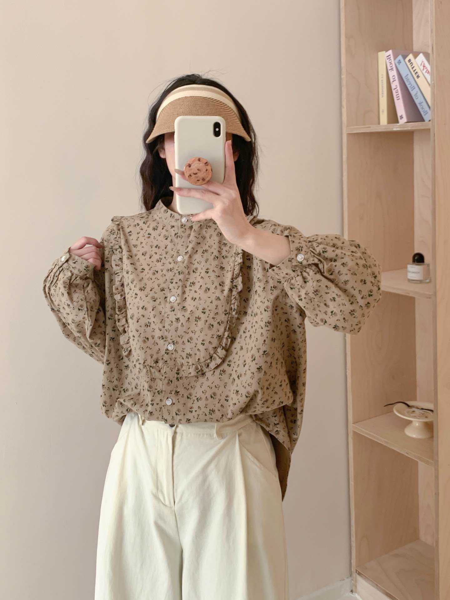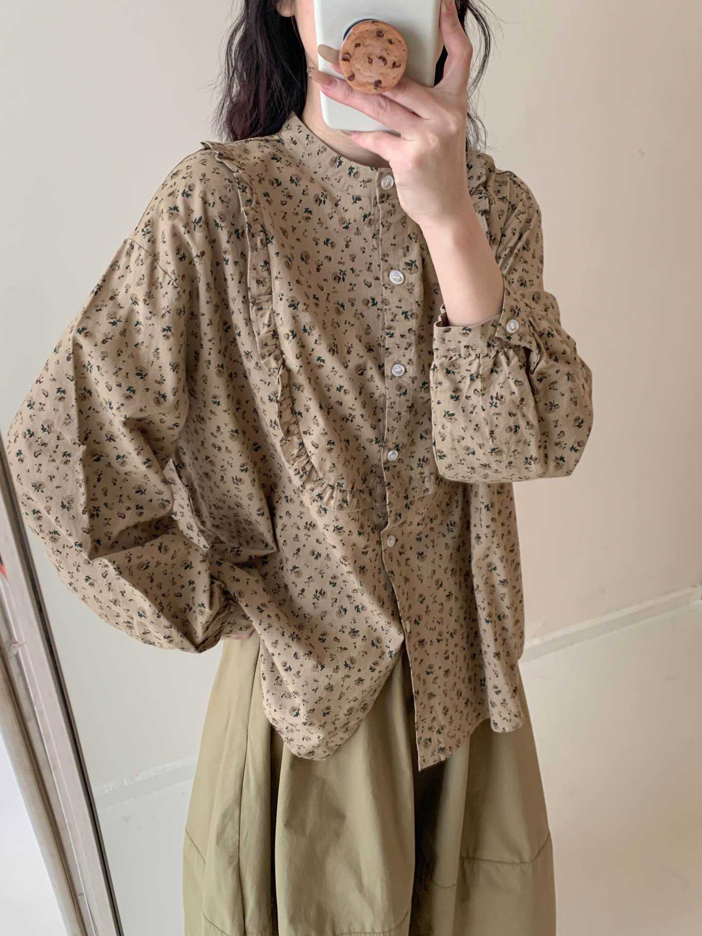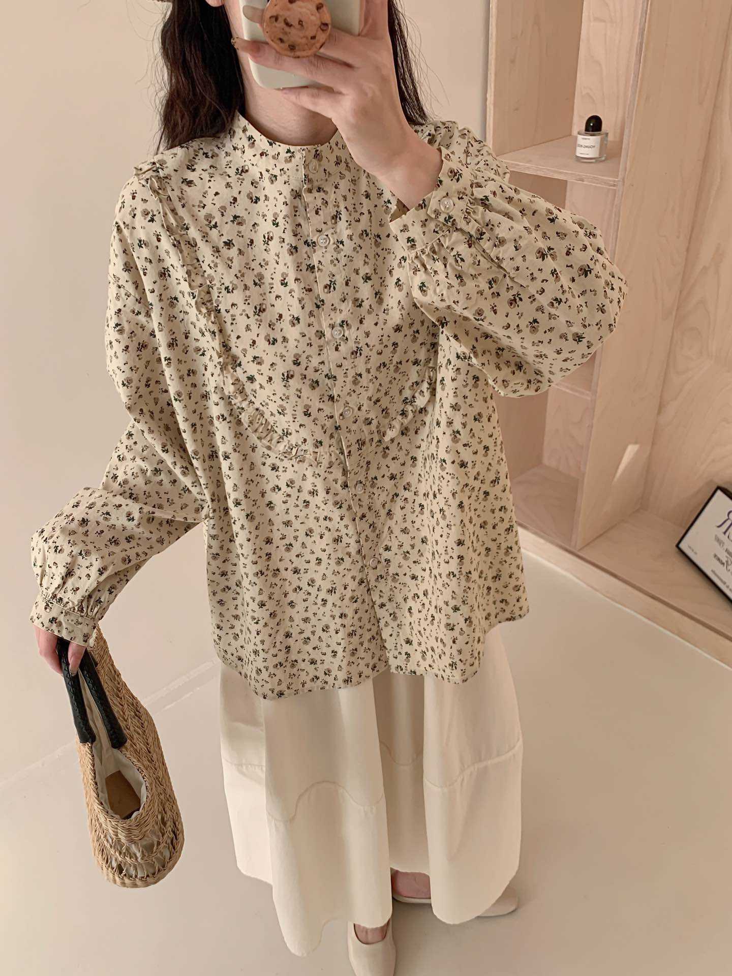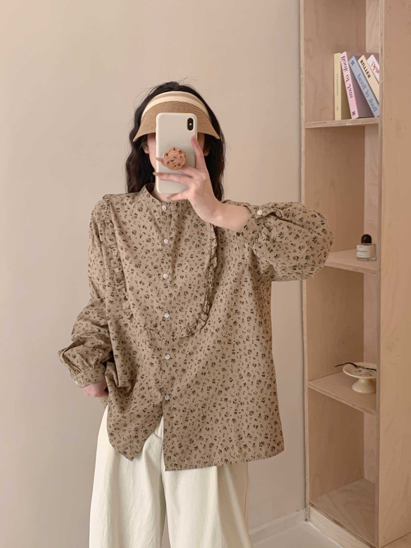 뉴 모리 스타일 스위트 스몰 칼라 싱글 브레스트 올 매치 에이지 감소 플로랄 롱 슬리브 디자인 올 매치 셔츠 탑 트렌디스토어 가기