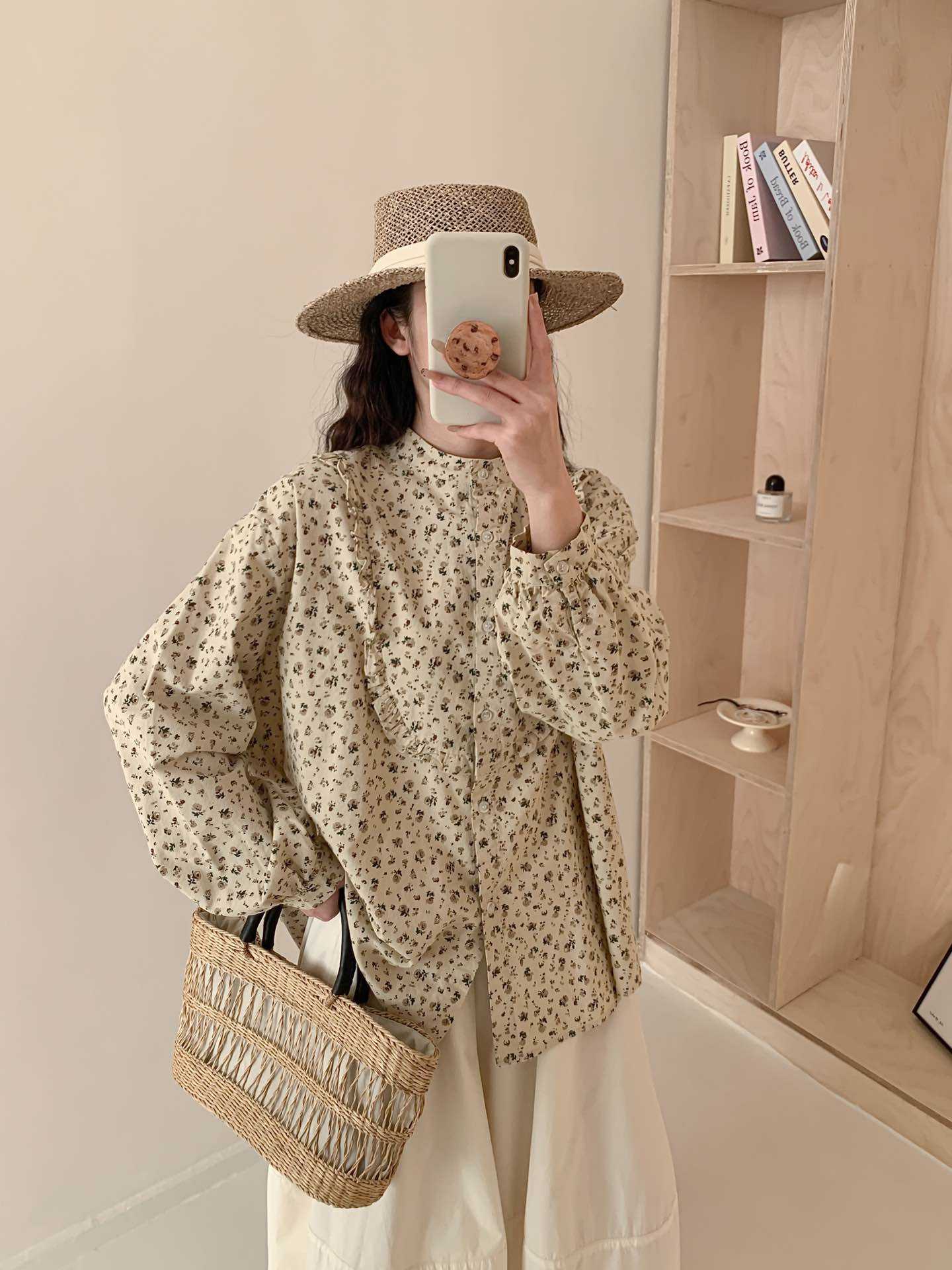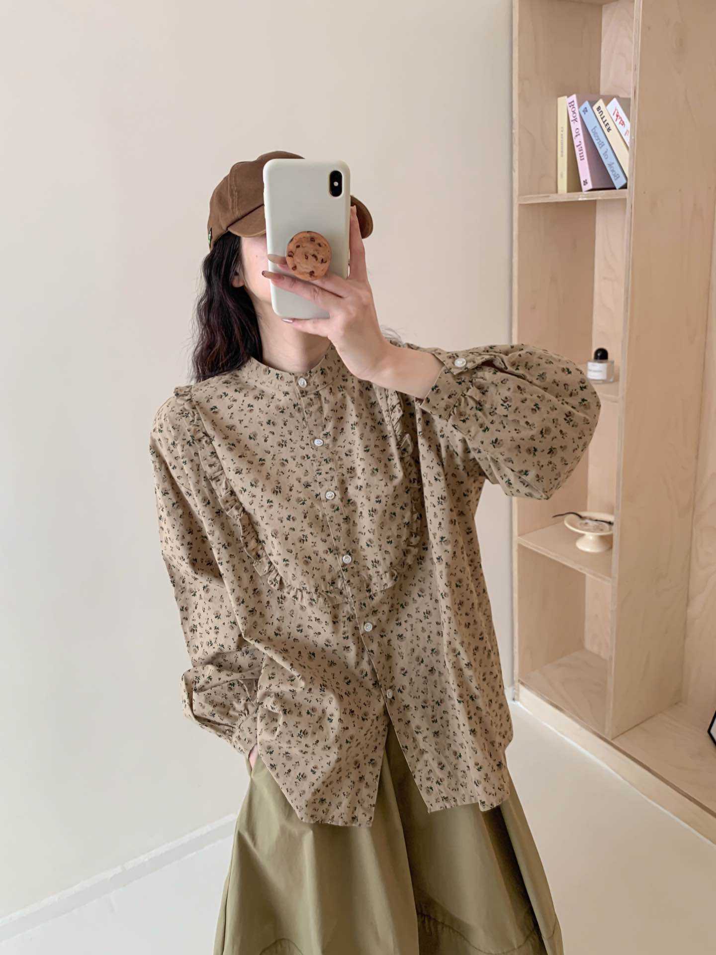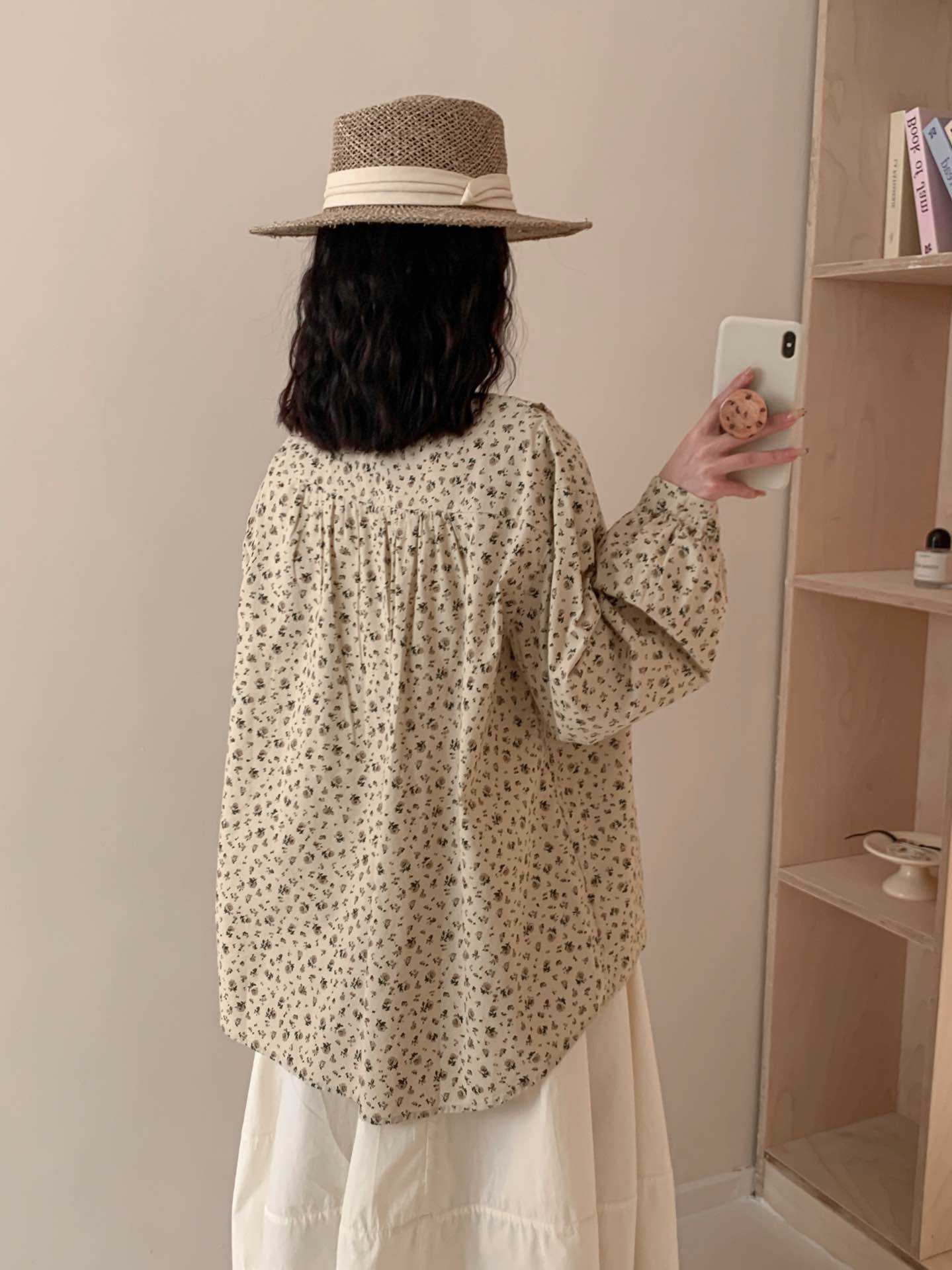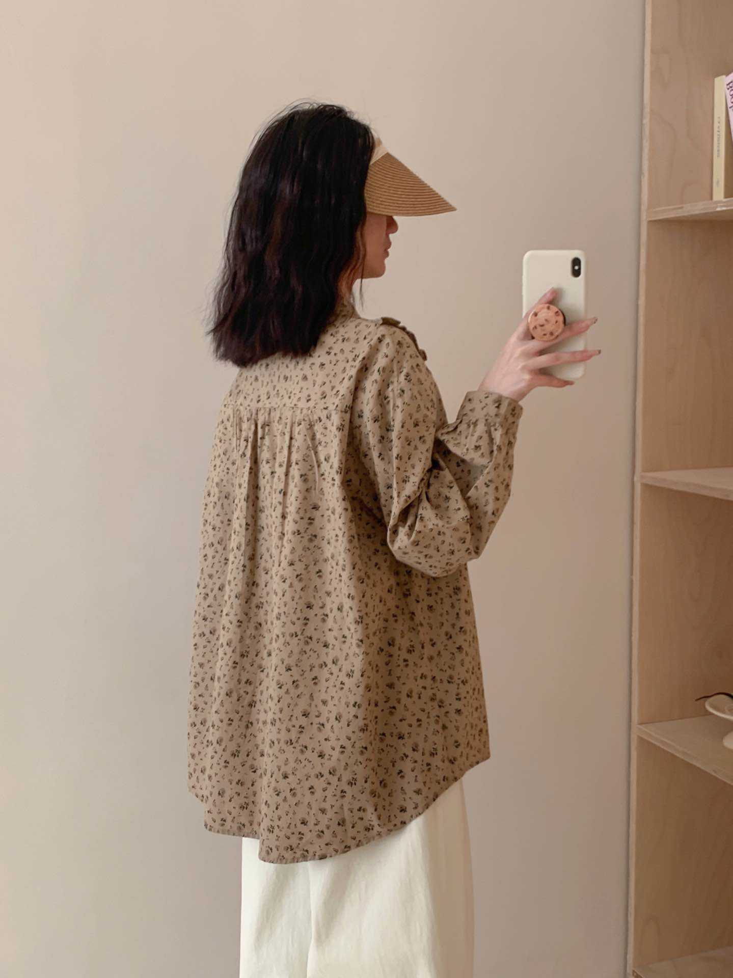 뉴 모리 스타일 스위트 스몰 칼라 싱글 브레스트 올 매치 에이지 감소 플로랄 롱 슬리브 디자인 올 매치 셔츠 탑 트렌디스토어 가기