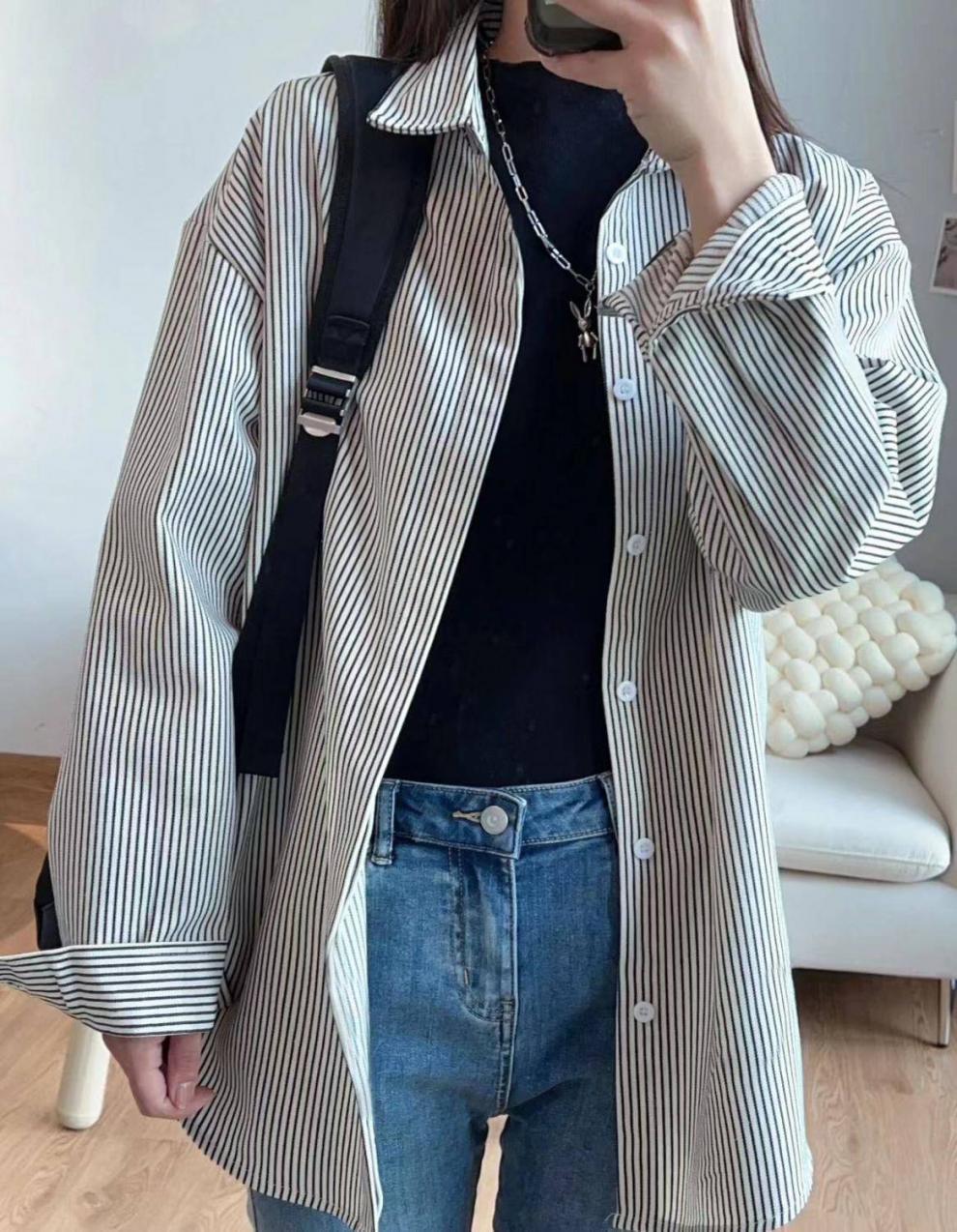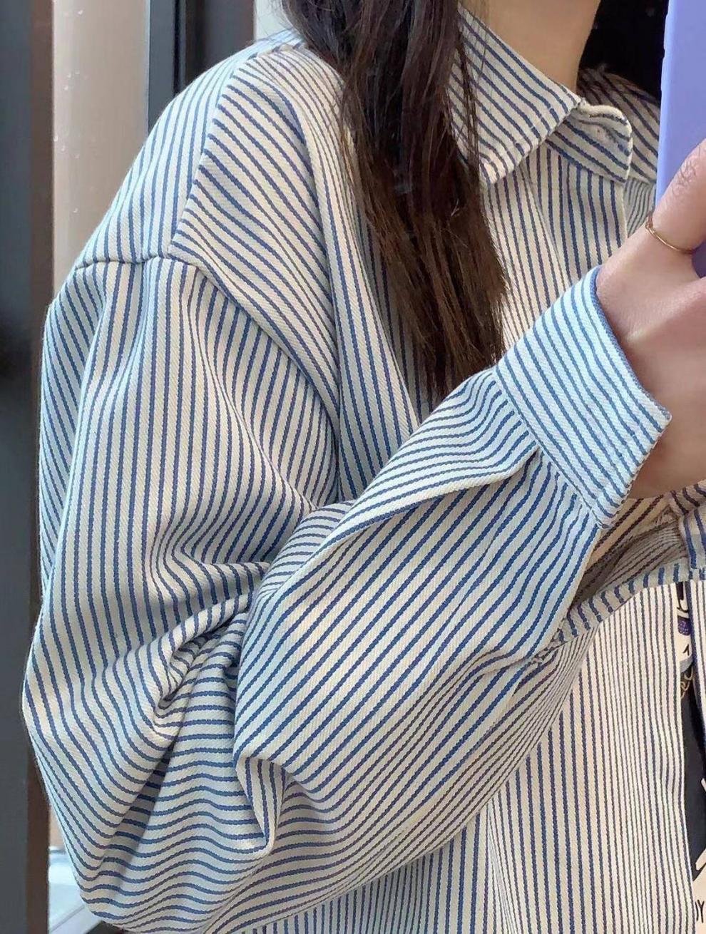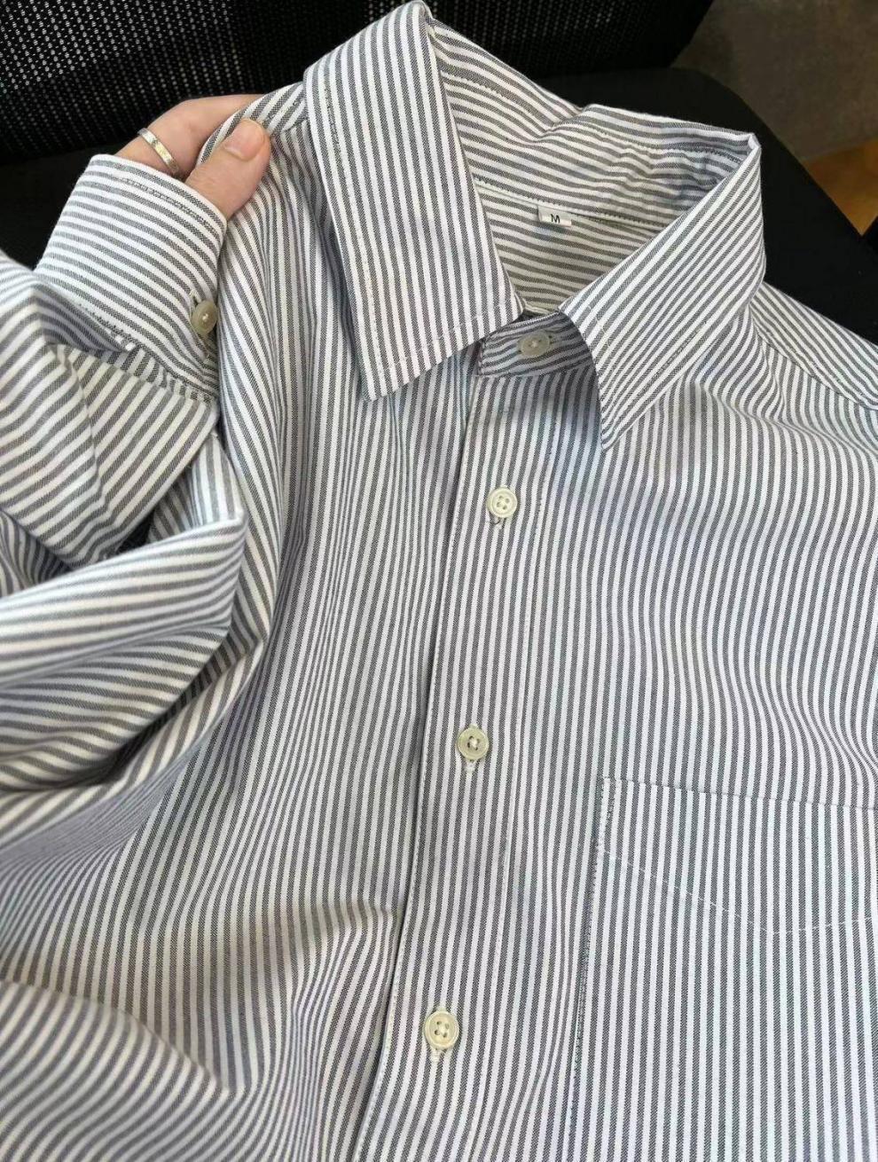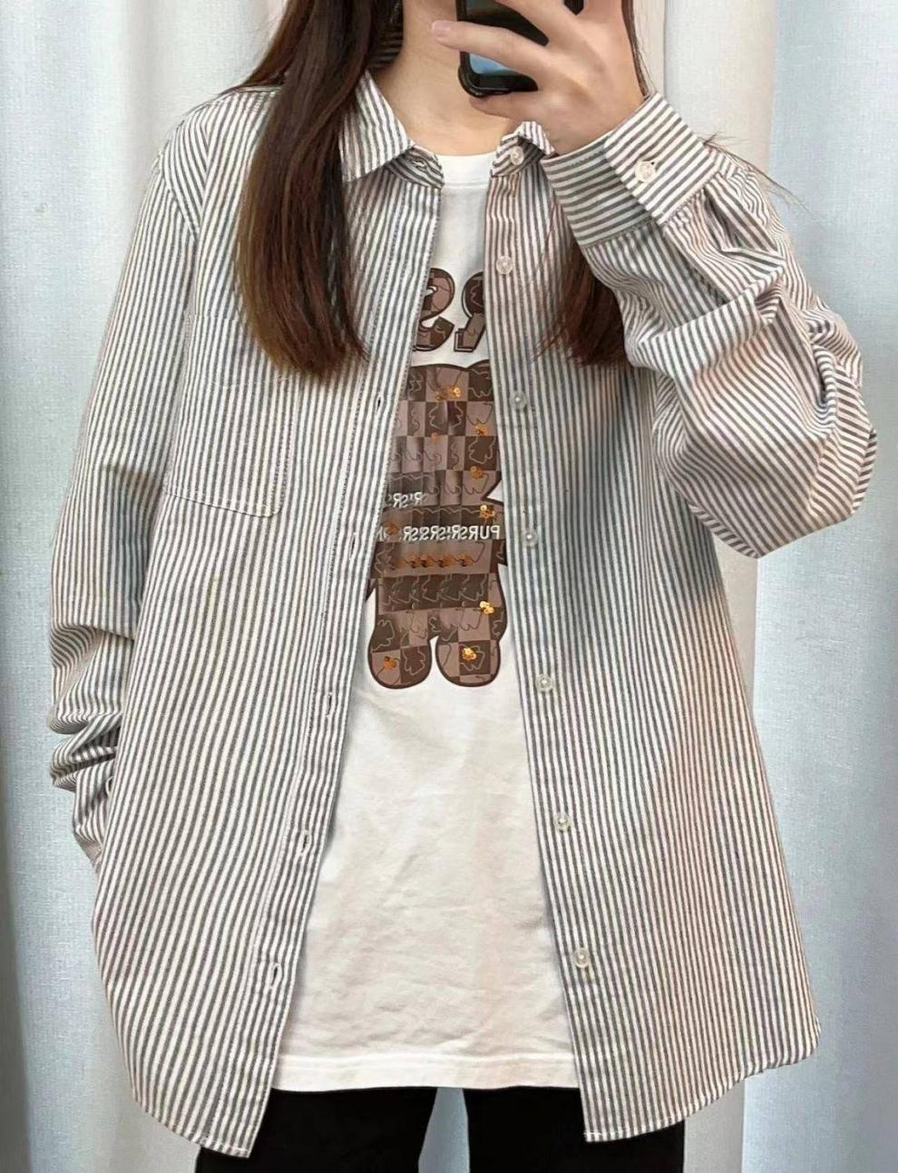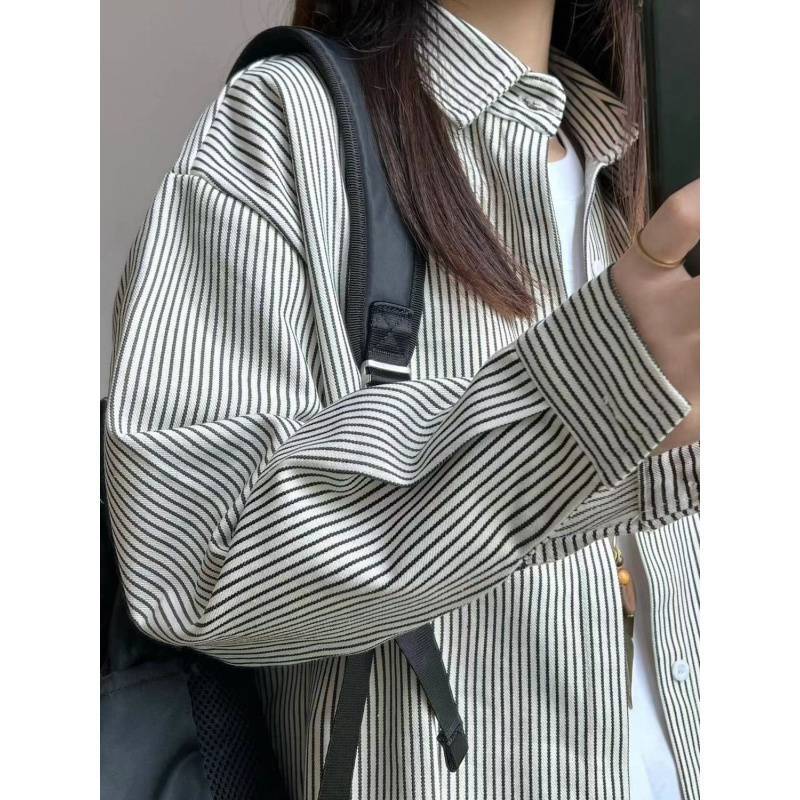 가벼운 럭셔리 레트로 스타일 코튼 그레이 스트라이프 셔츠 여성용 내부 쌓인 느슨한 올매치 슬림핏 긴소매 아우터 셔츠스토어 가기
