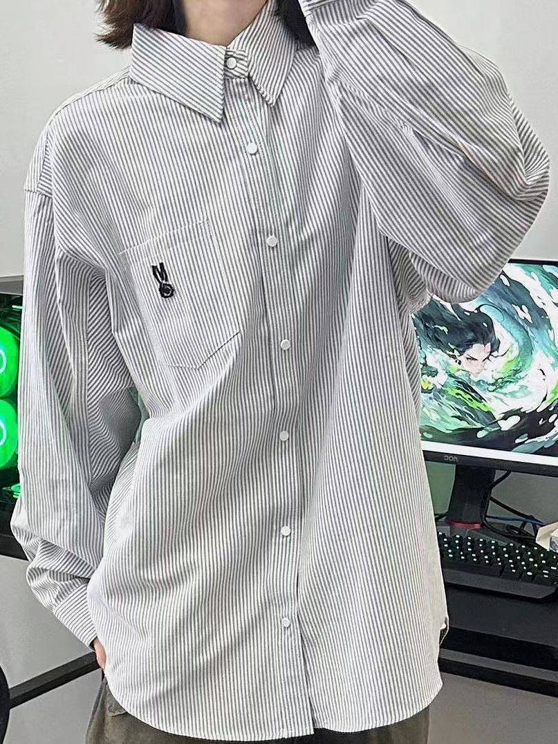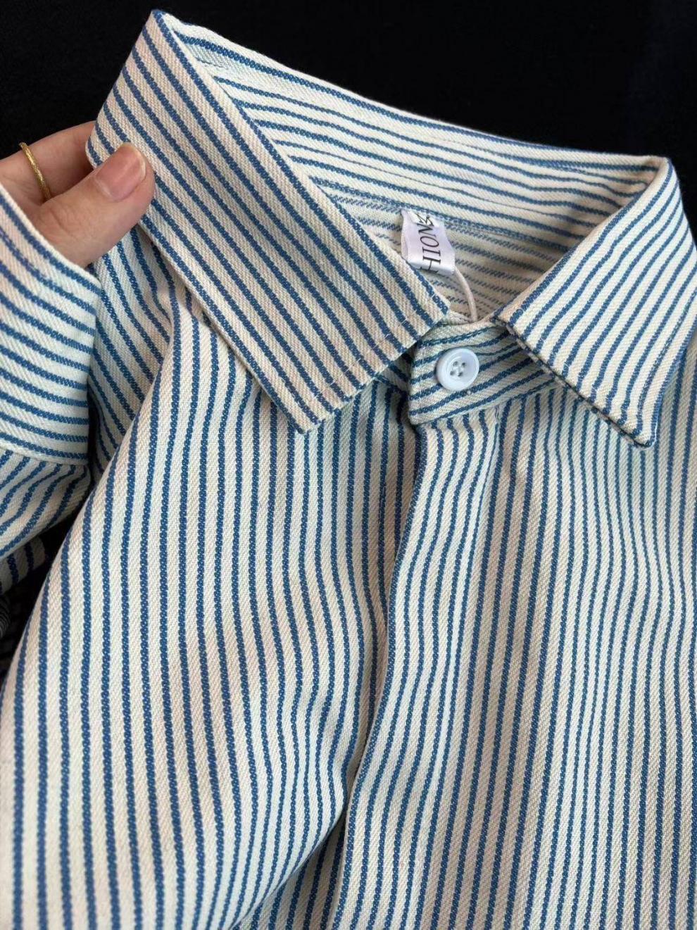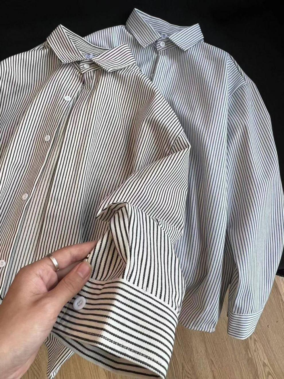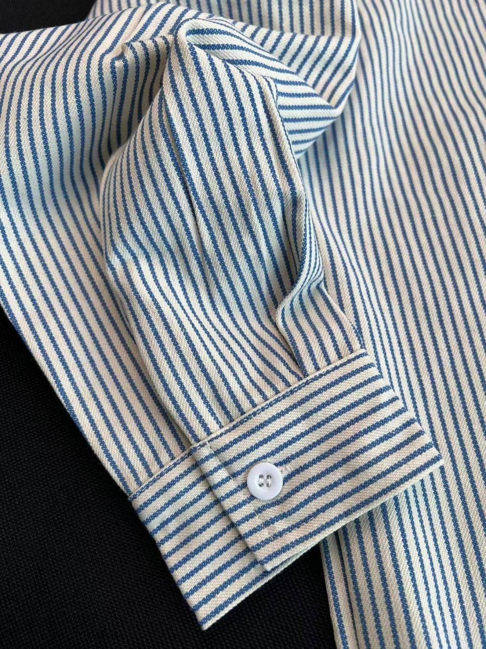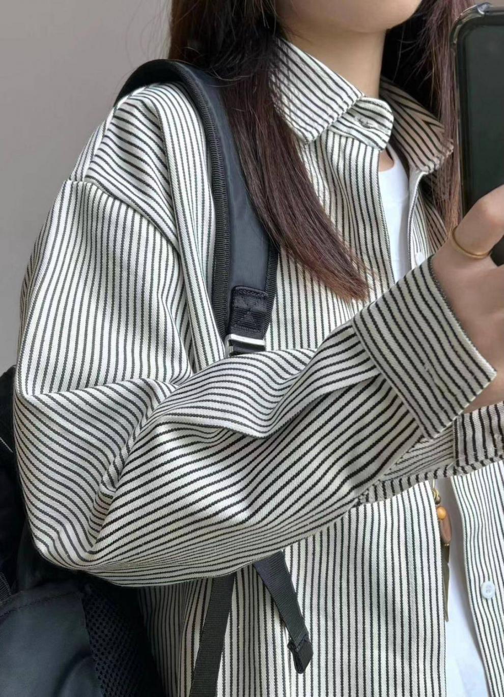 가벼운 럭셔리 레트로 스타일 코튼 그레이 스트라이프 셔츠 여성용 내부 쌓인 느슨한 올매치 슬림핏 긴소매 아우터 셔츠스토어 가기