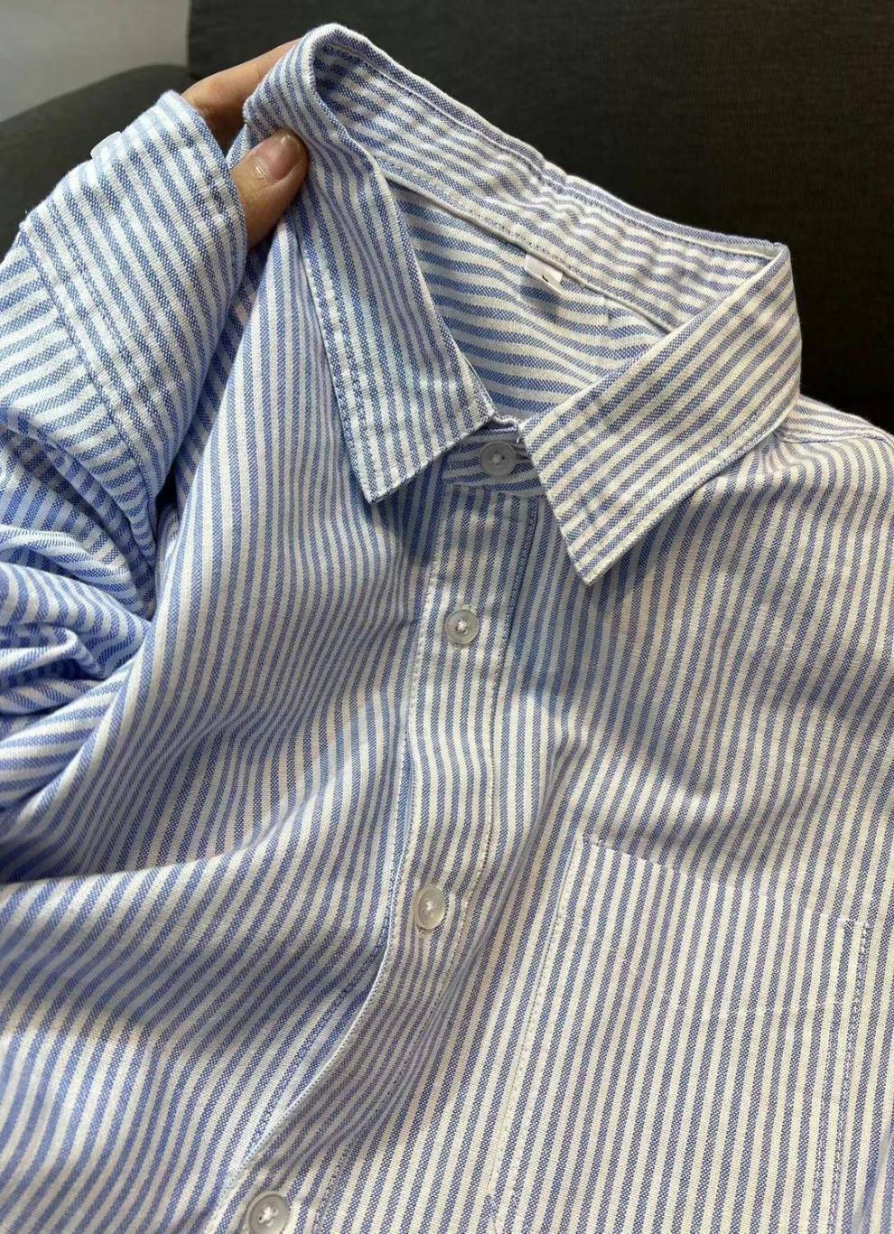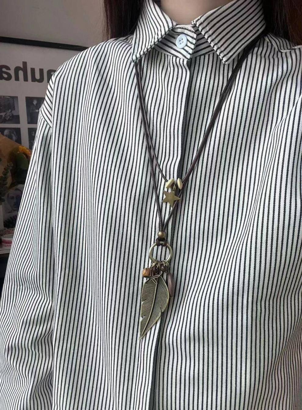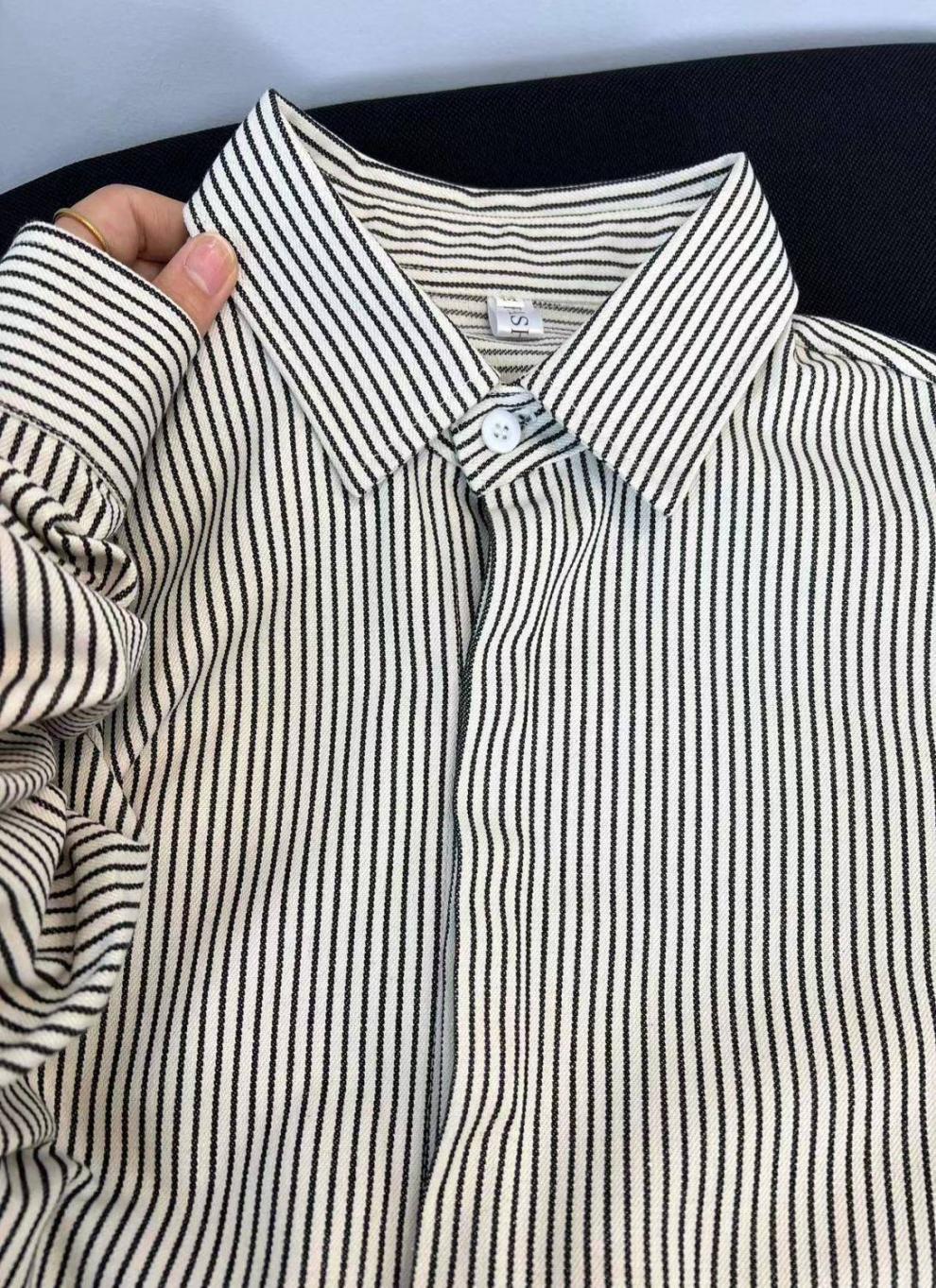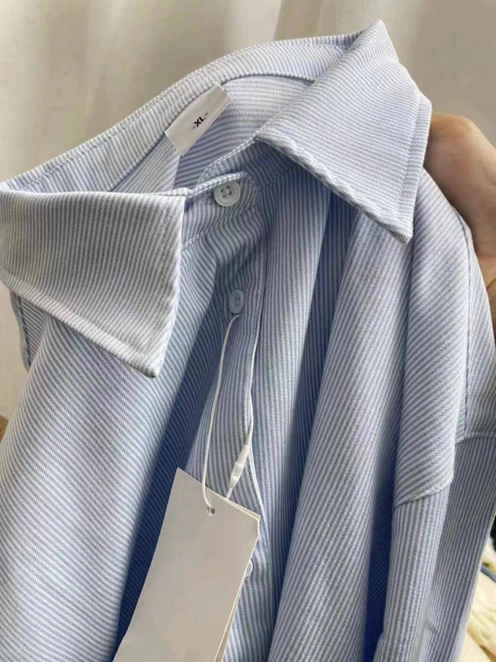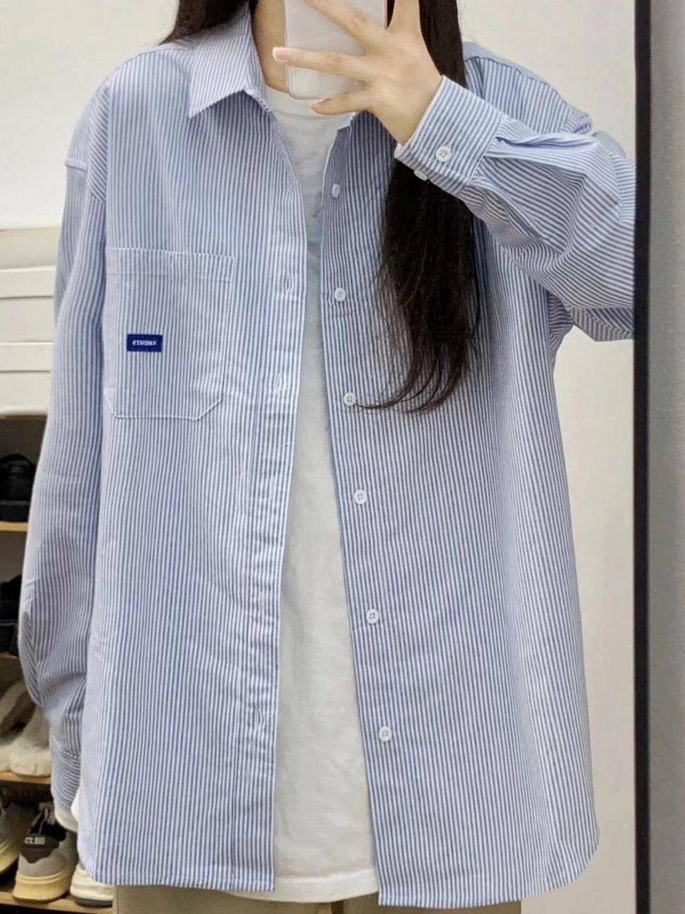 가벼운 럭셔리 레트로 스타일 코튼 그레이 스트라이프 셔츠 여성용 내부 쌓인 느슨한 올매치 슬림핏 긴소매 아우터 셔츠스토어 가기