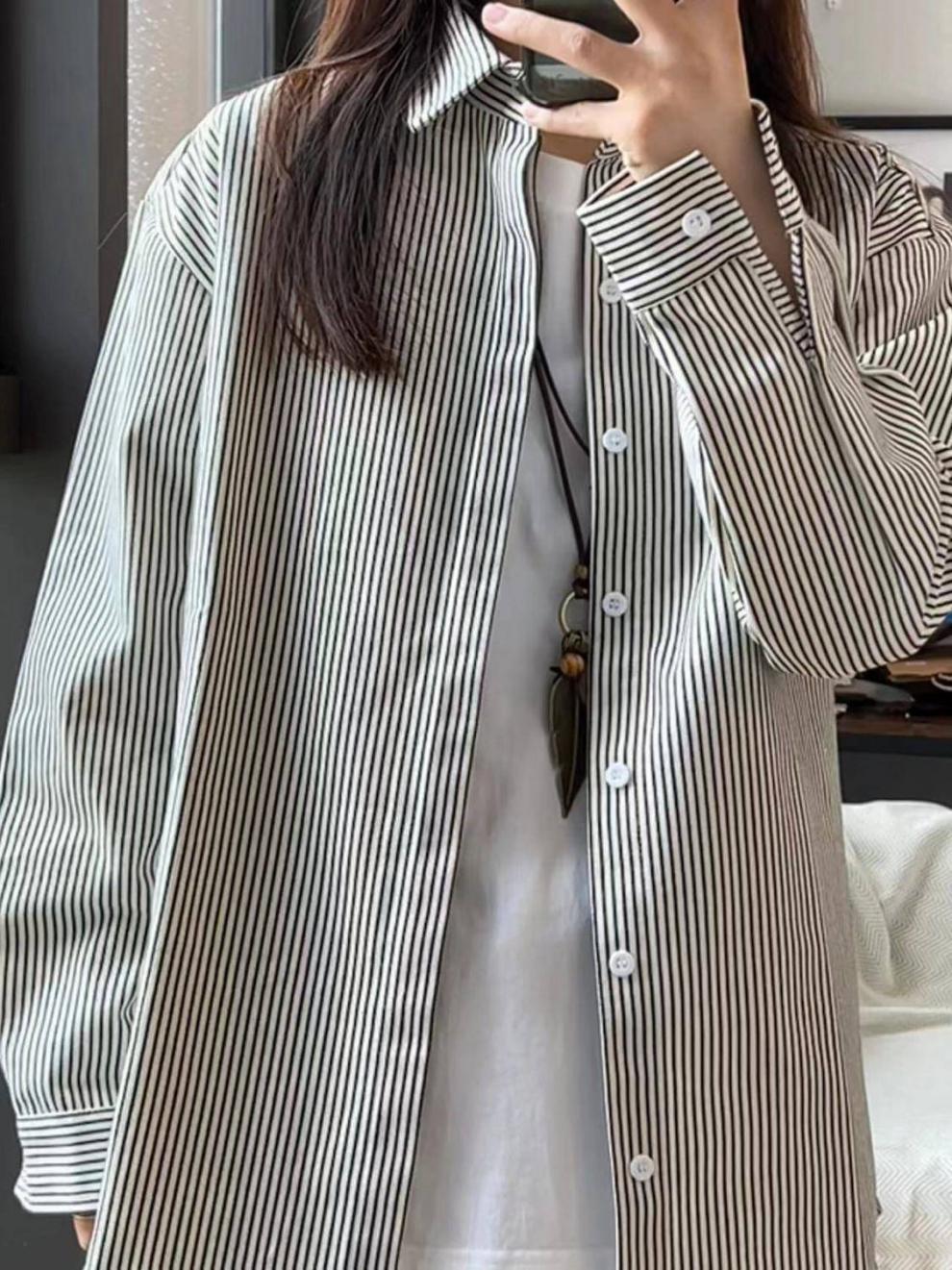 가벼운 럭셔리 레트로 스타일 코튼 그레이 스트라이프 셔츠 여성용 내부 쌓인 느슨한 올매치 슬림핏 긴소매 아우터 셔츠