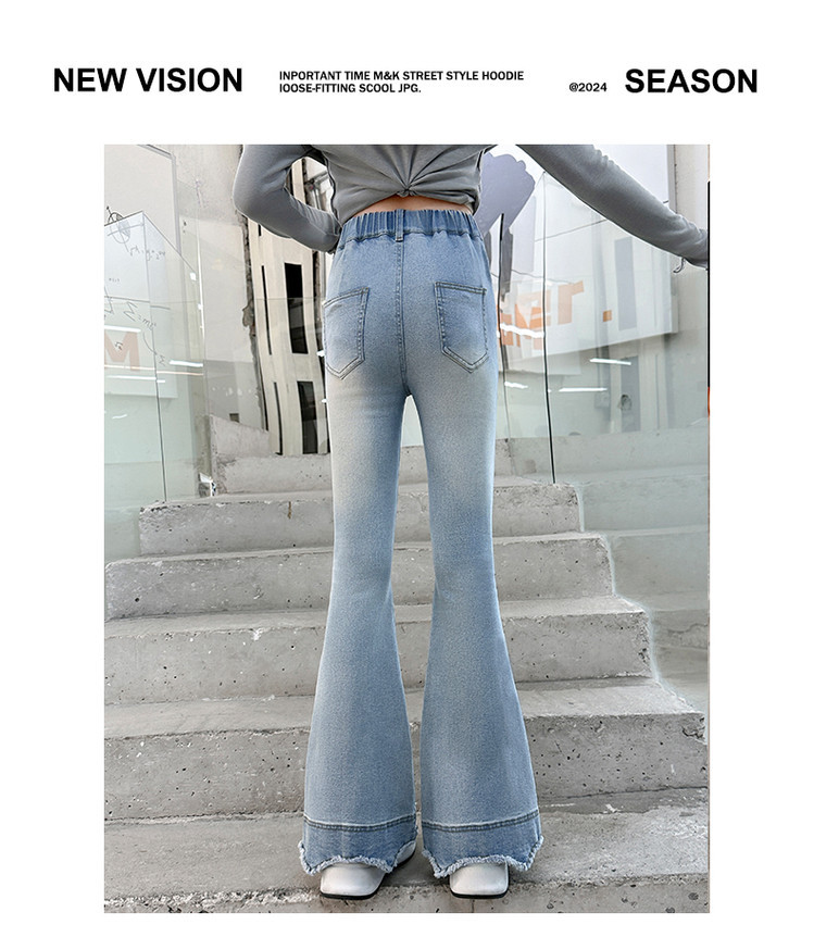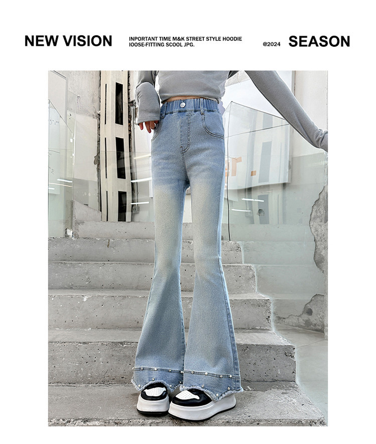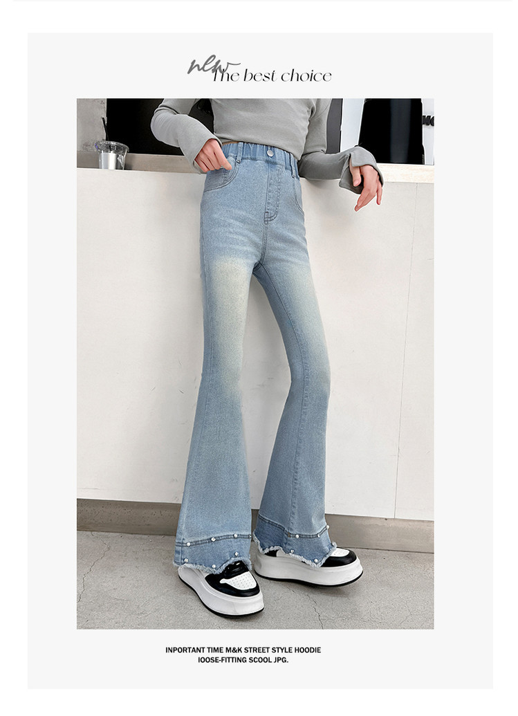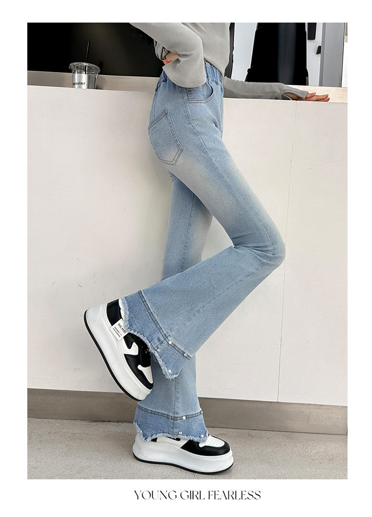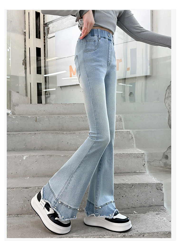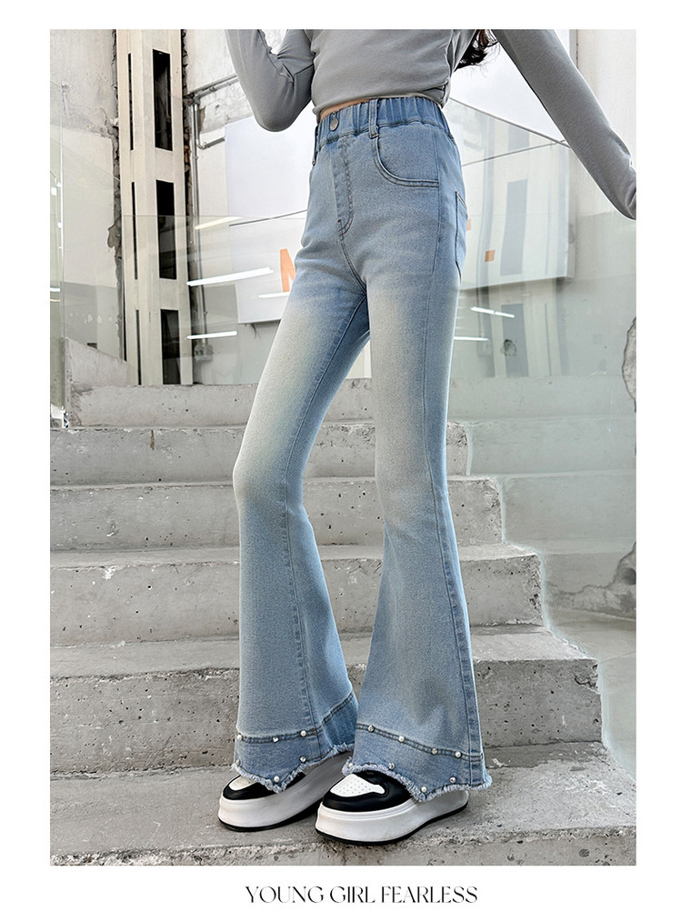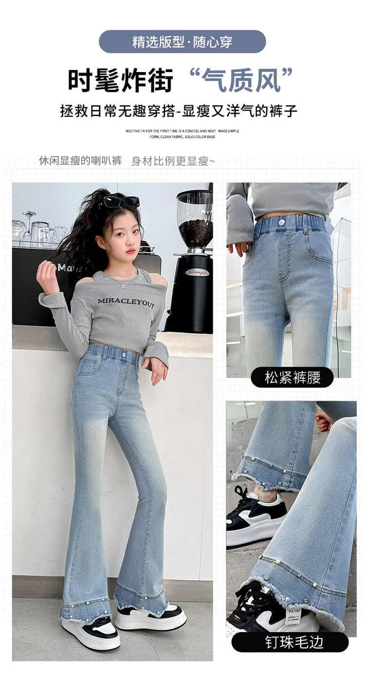 소녀의 봄과 가을 청바지 2025 새로운 어린이 슬림 핏 봄웨어 걸스 대형 어린이 곡선 모피 가장자리 경적 바지스토어 가기
