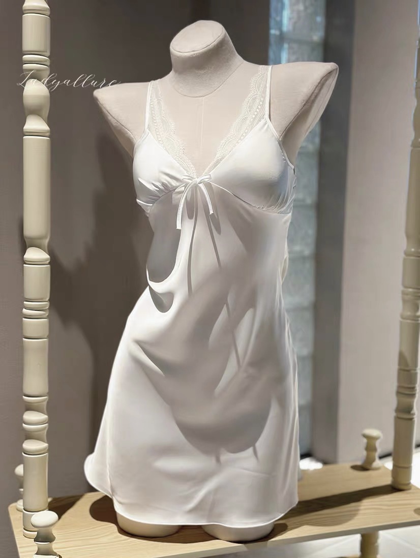 섹시한 잠옷 여성의 여름 얇은 새틴 아이스 실크 슬링 나이트 가운 순수한 욕망 바람 벨트 가슴 패드 홈 옷