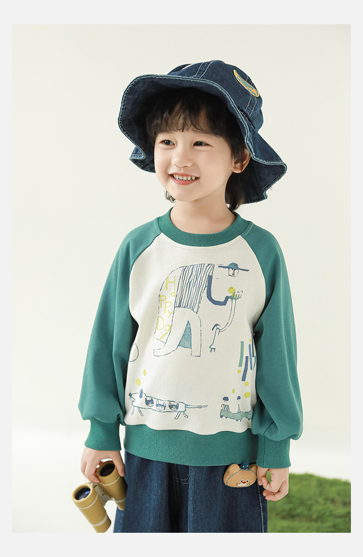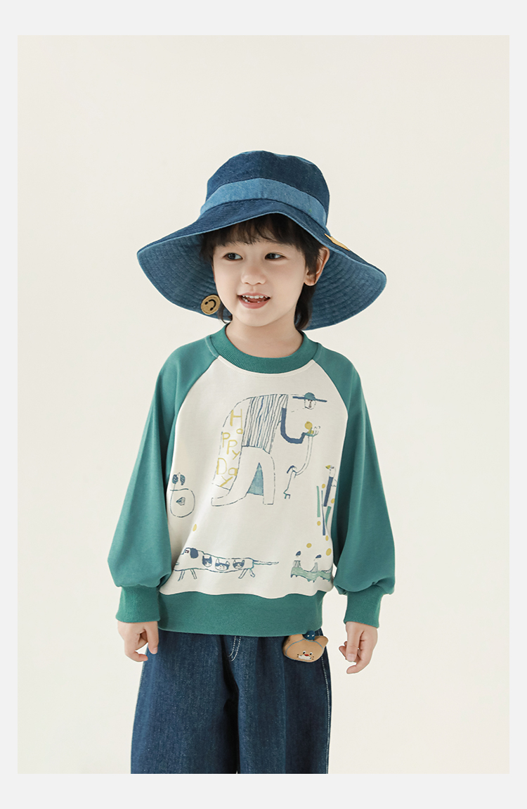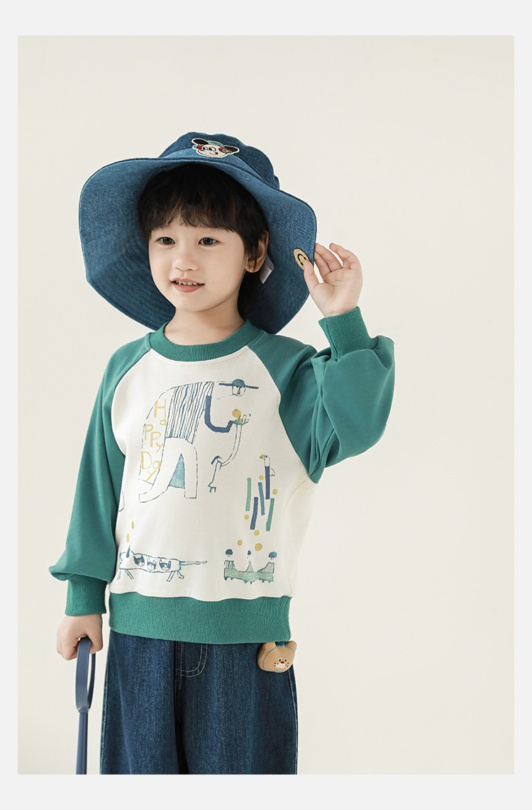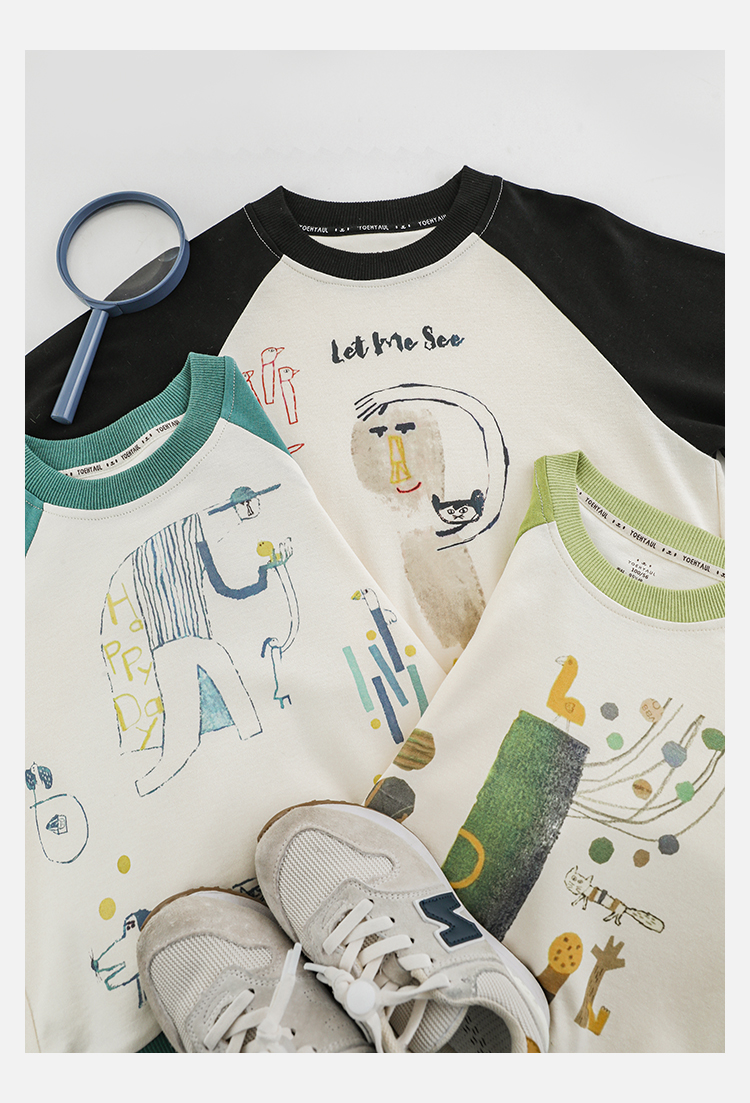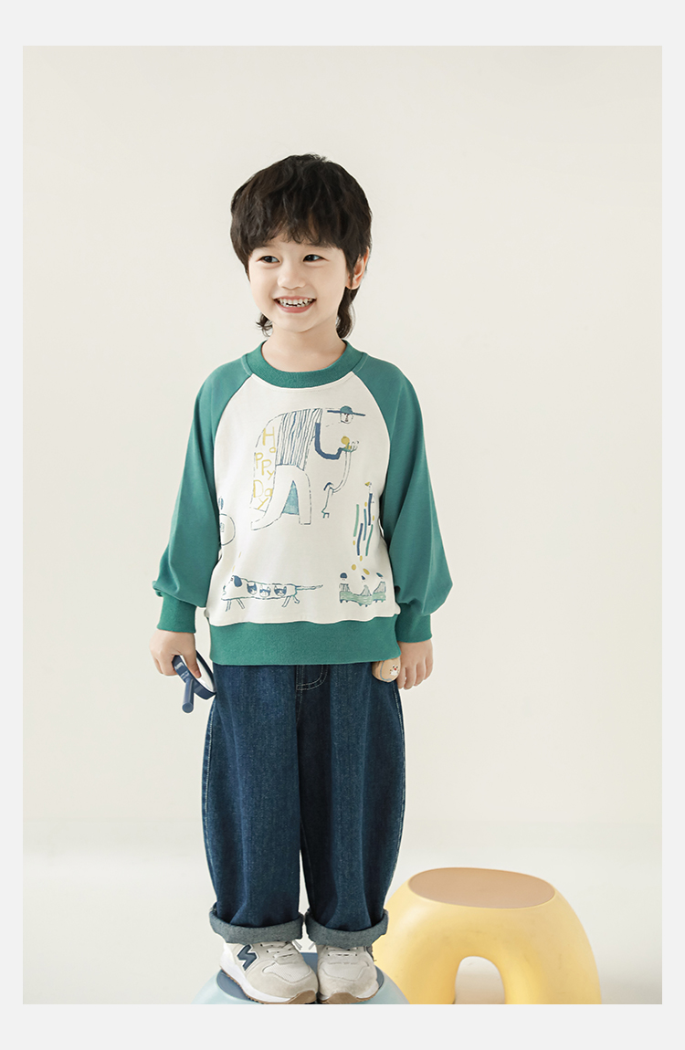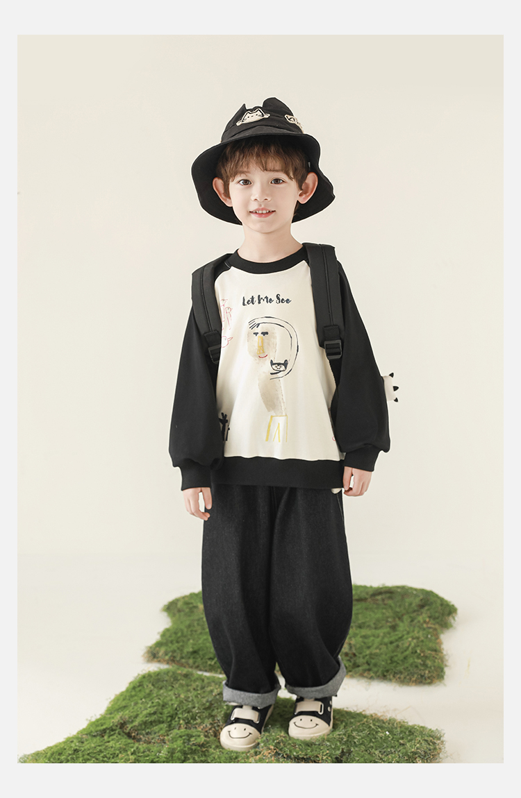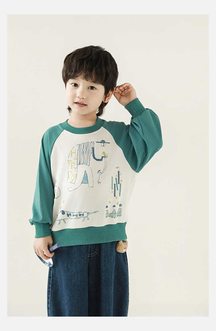 Wurib Boys 봄 새로운 인쇄 된 대조적 인 긴팔 둥근 목 땀 어린이 캐주얼 루즈 트렌디 쿨 탑스토어 가기