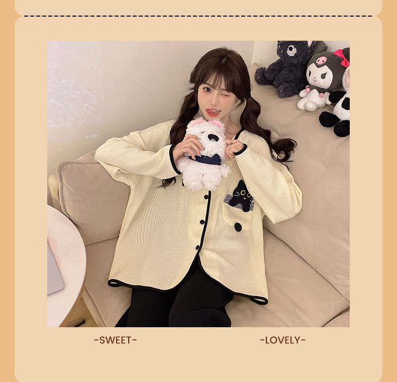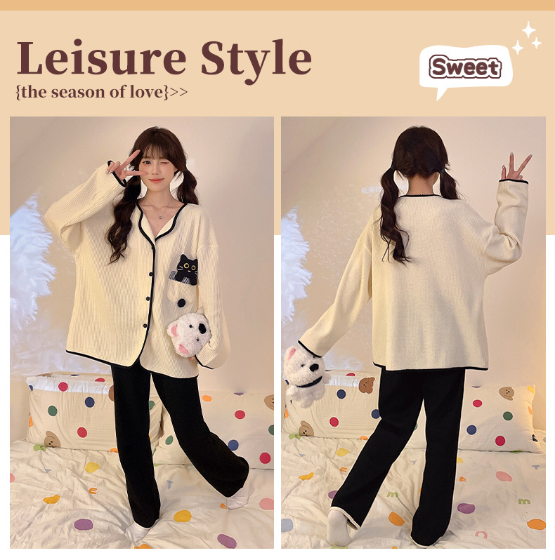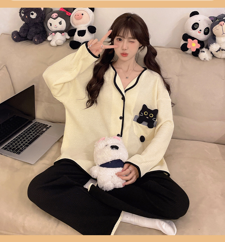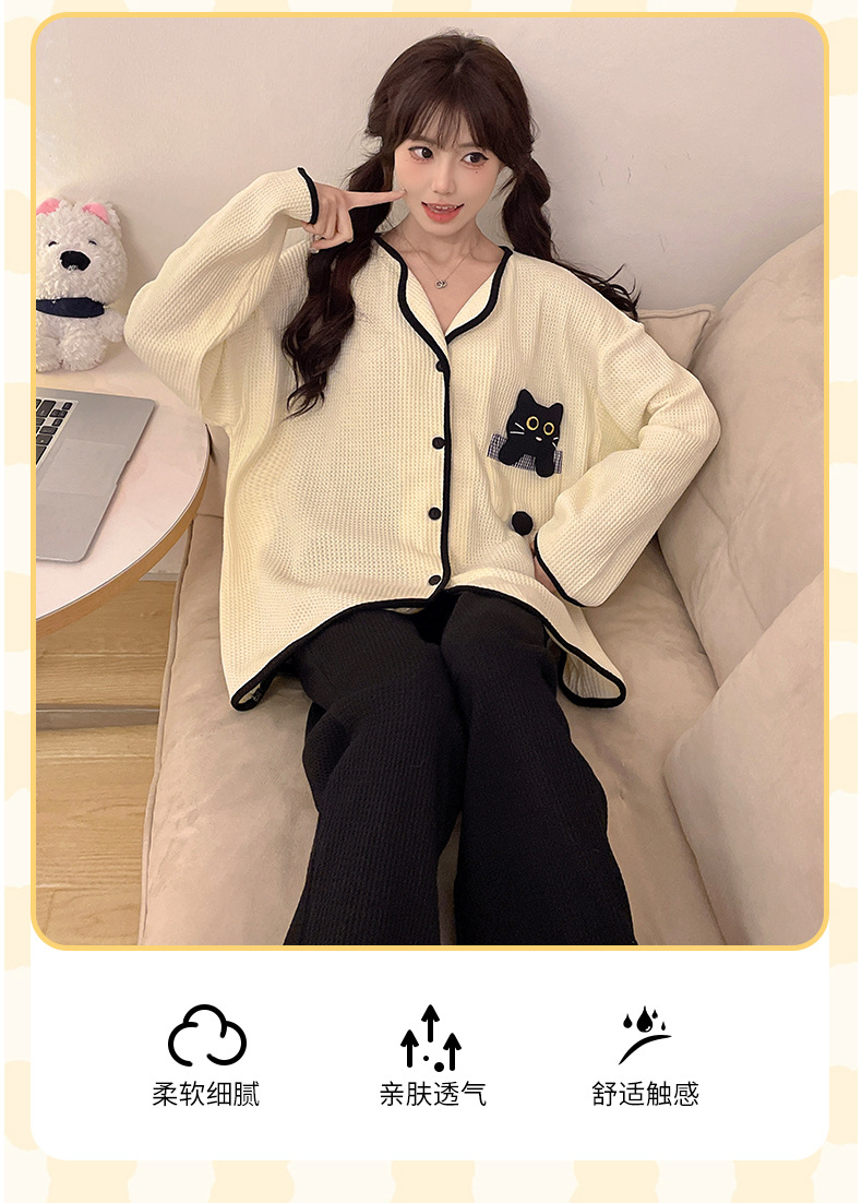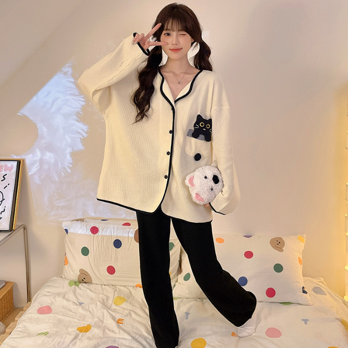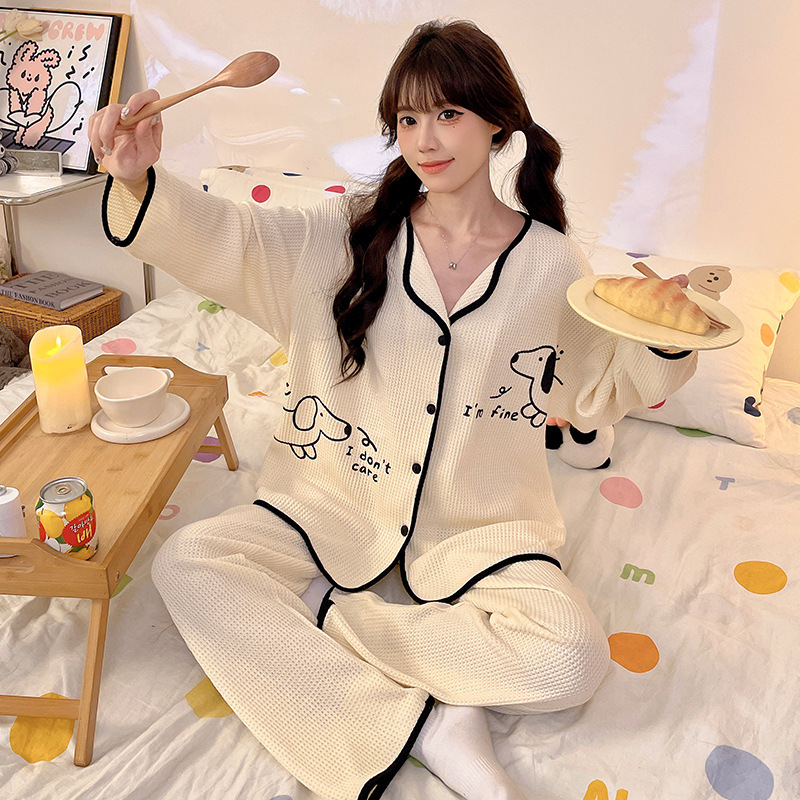 대외 무역 도매 봄 새로운 모조 면화 와플 카디건 긴 소매 바지 세트 잠옷 여성 홈 의류 세대스토어 가기