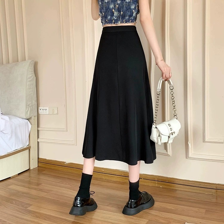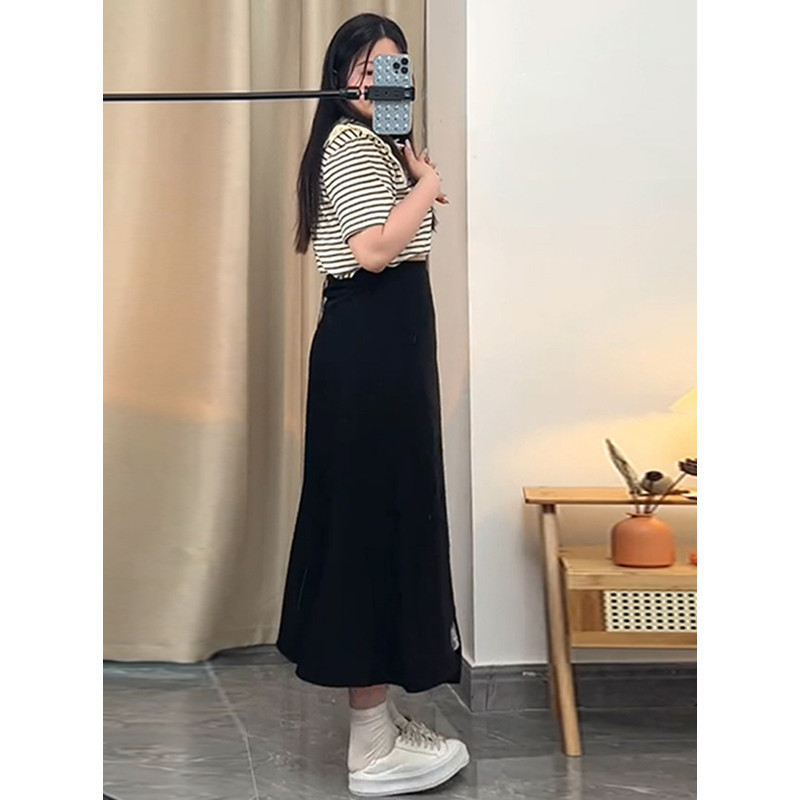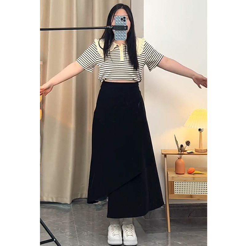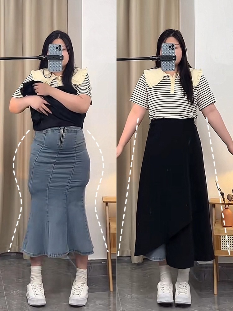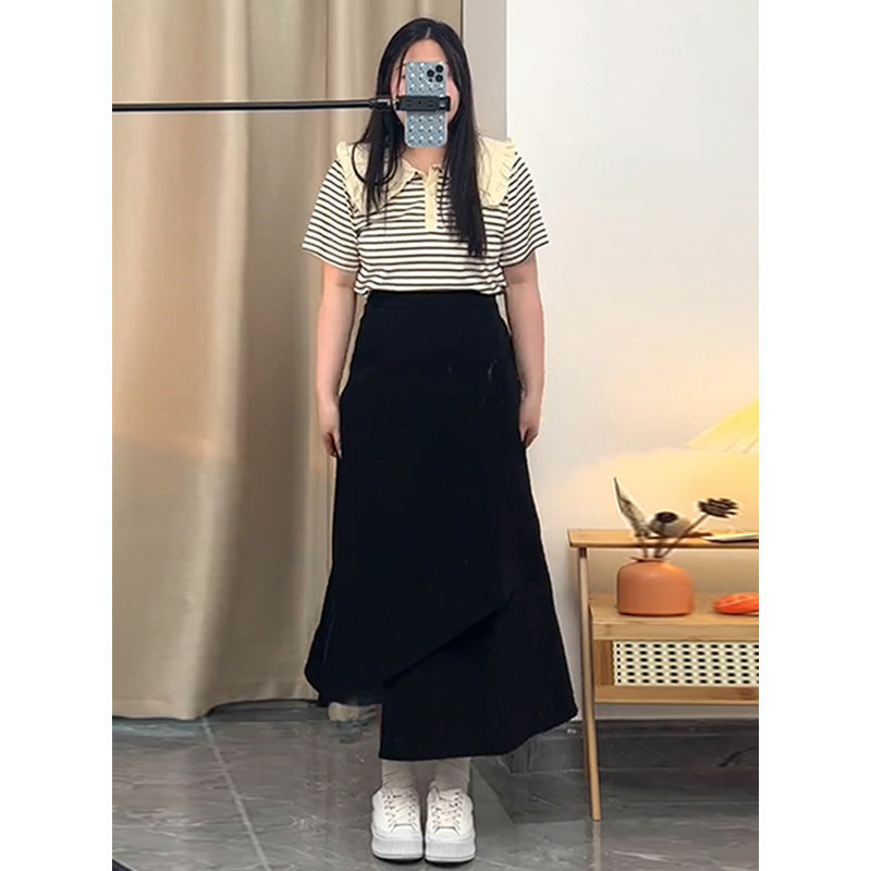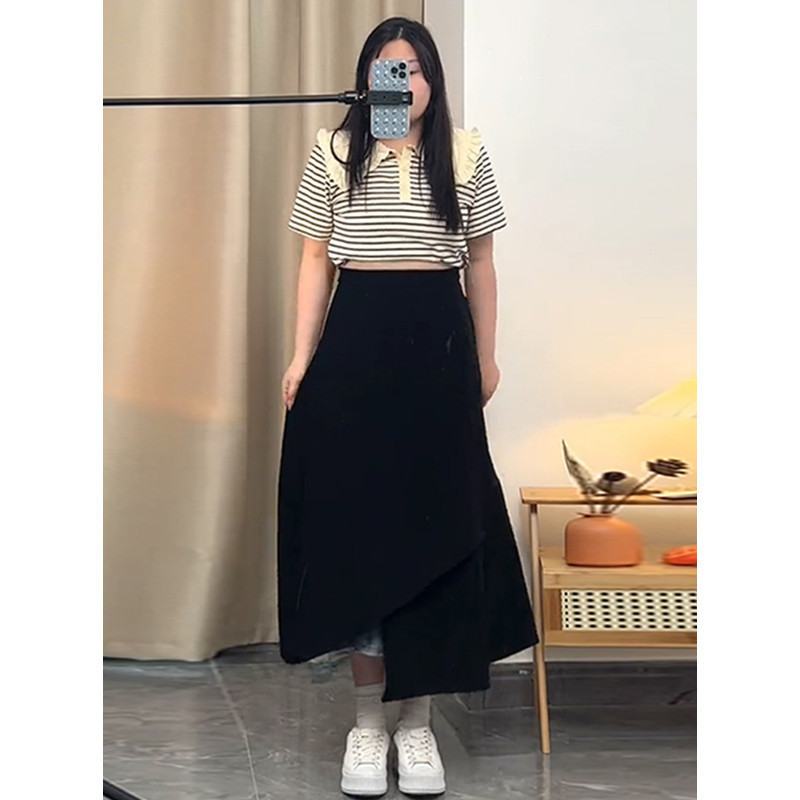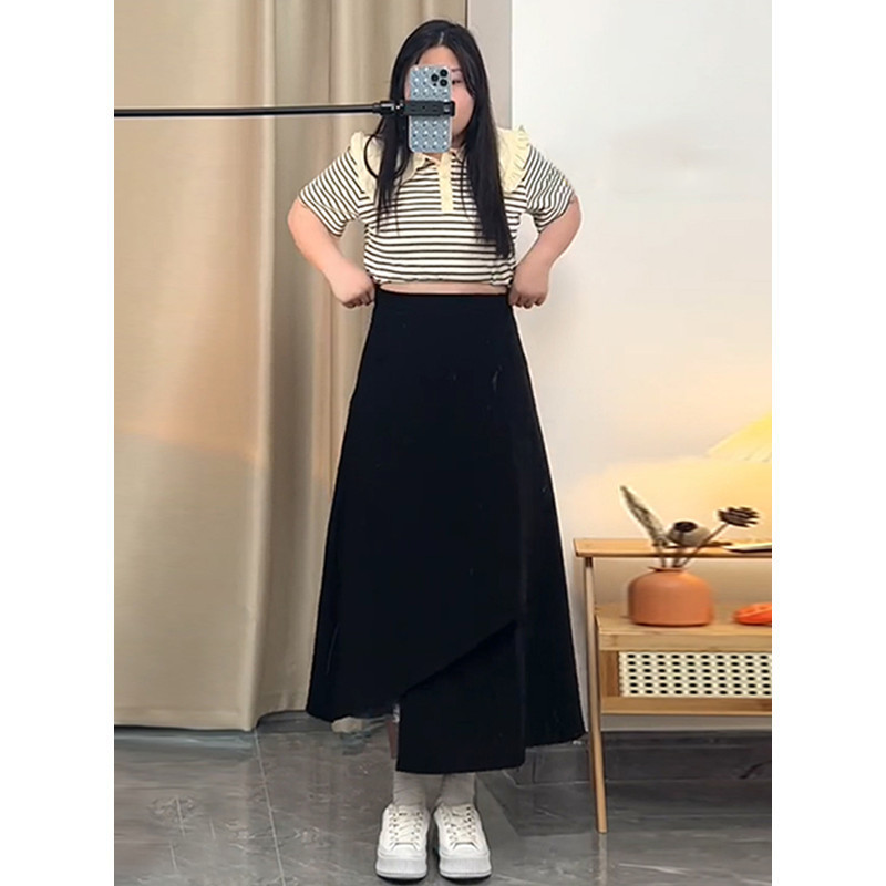 통통녀 불규칙한 검은 색 세트 절반 길이 치마 봄과 여름 새로운 도착 플러스 사이즈 느슨한 배 모양 슬리밍 육체 커버 A-라인 스커트스토어 가기