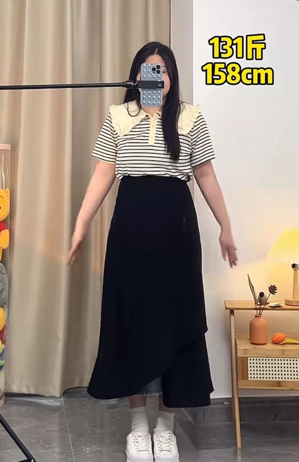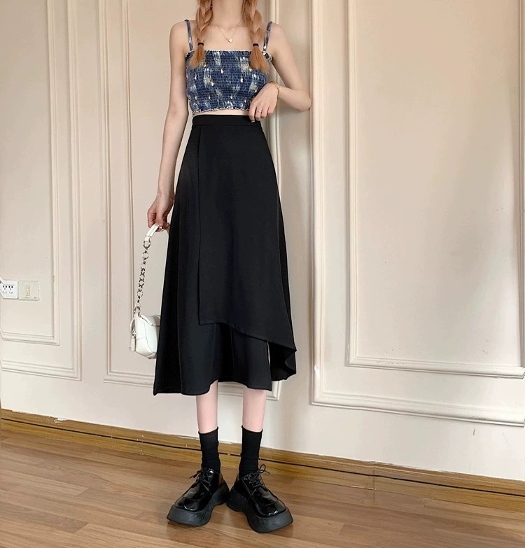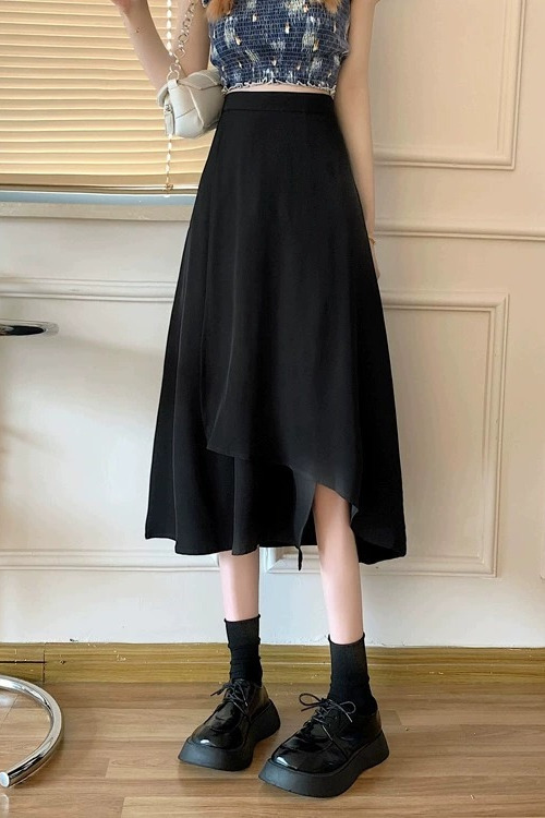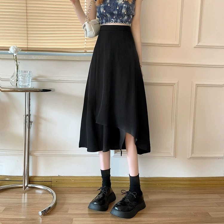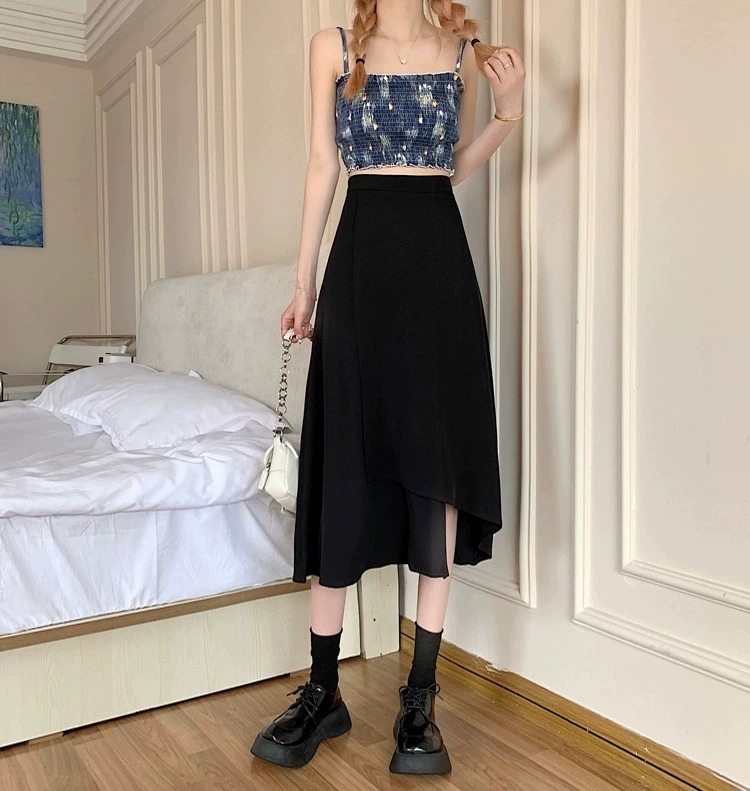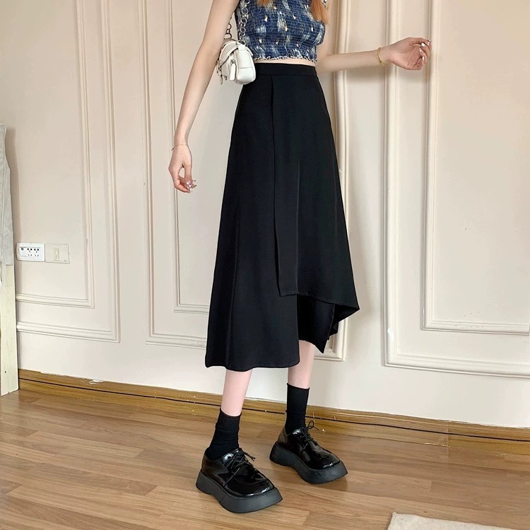 통통녀 불규칙한 검은 색 세트 절반 길이 치마 봄과 여름 새로운 도착 플러스 사이즈 느슨한 배 모양 슬리밍 육체 커버 A-라인 스커트