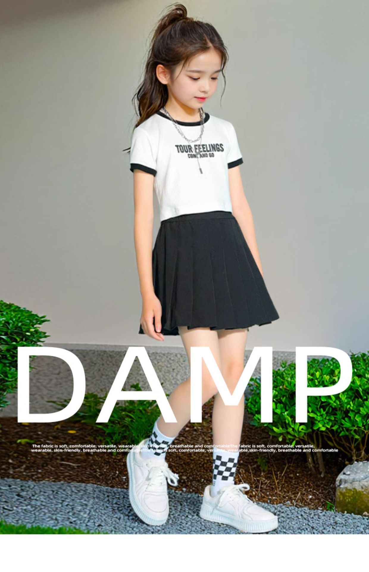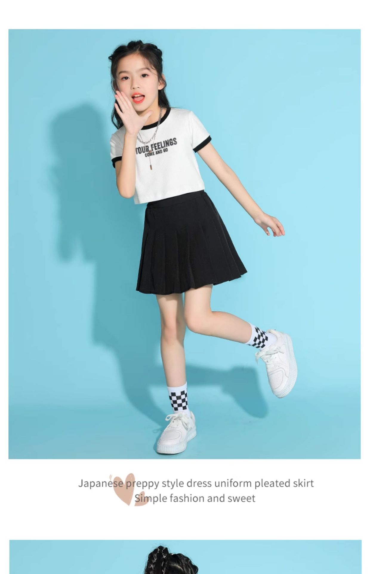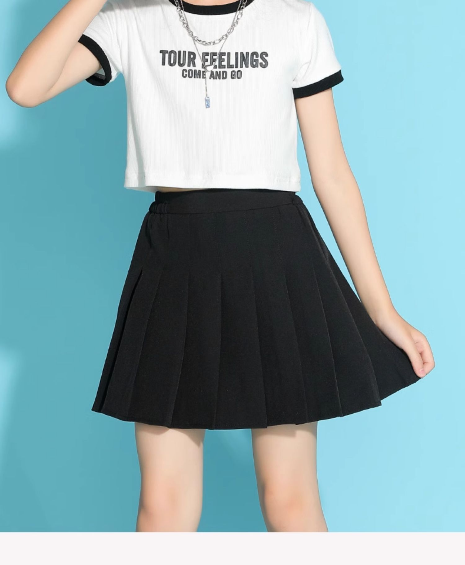 여자 코튼 티셔츠 2024 여름 새로운 문자 색상 일치 짧은 소매 상단 주름 치마 모양 치마 조수