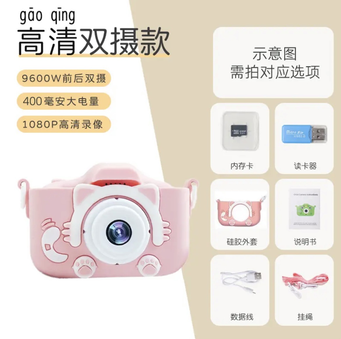 • (핑크캣) HD 듀얼 카메라 9600W+128G 메모리 카드