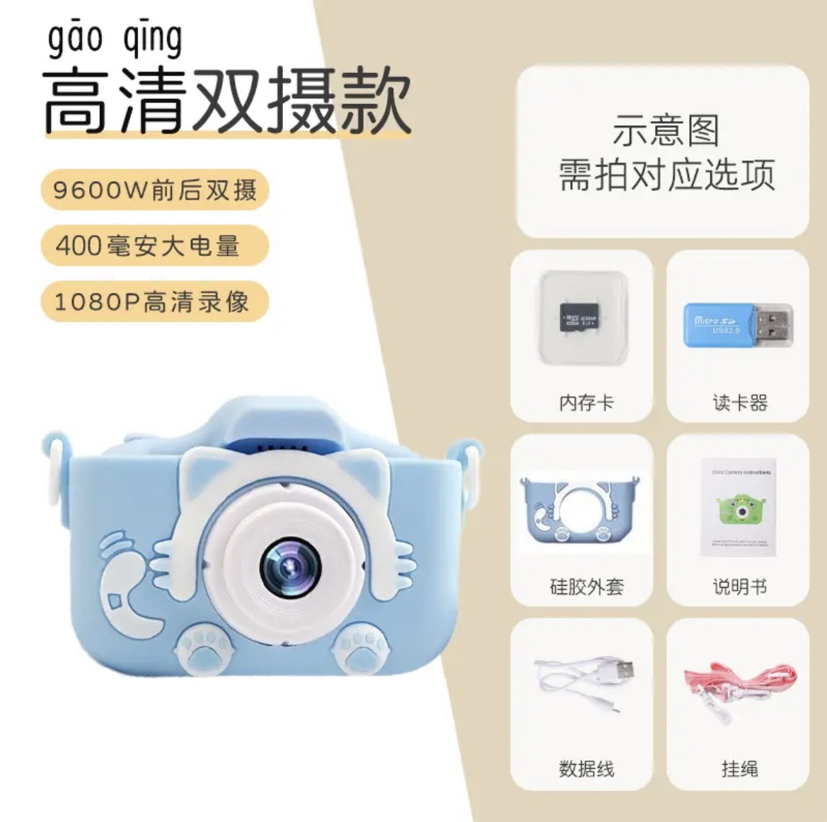 • (파란 고양이) HD 듀얼 카메라 9600W+ 메모리 카드 없음