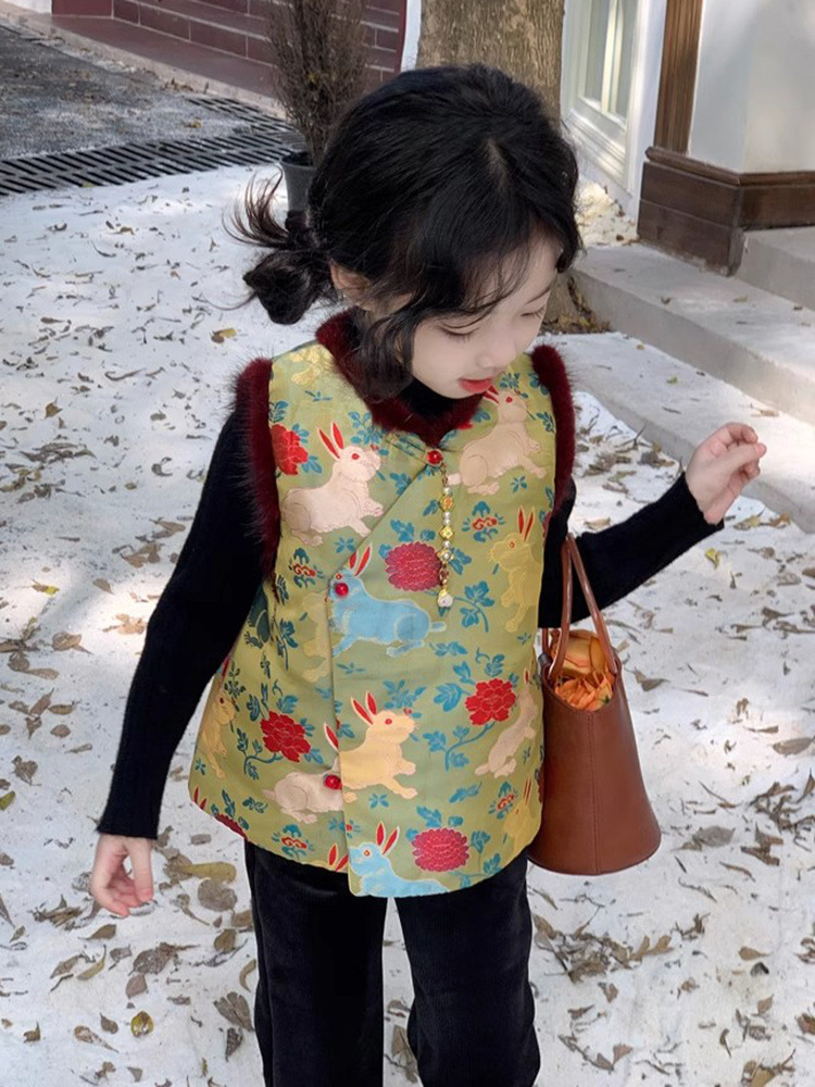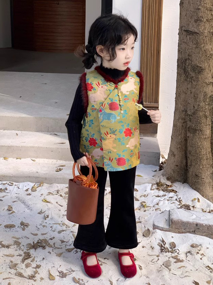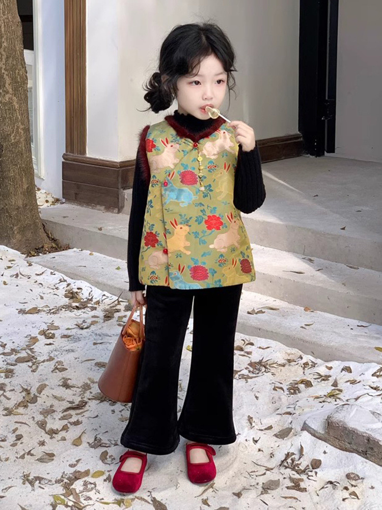 새로운 중국 아동복 2025 봄 새 도착 토끼 자카드 노래 브로케이드 청삼 조끼 소녀 블랙 탑 벨 바지