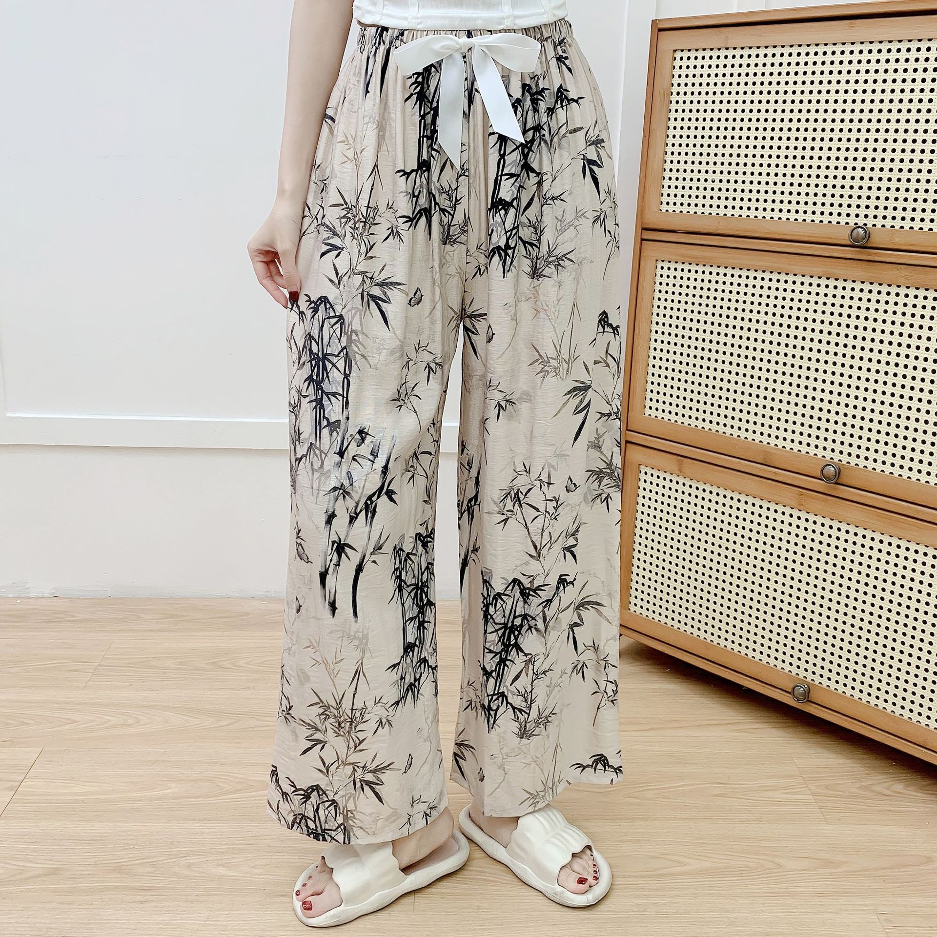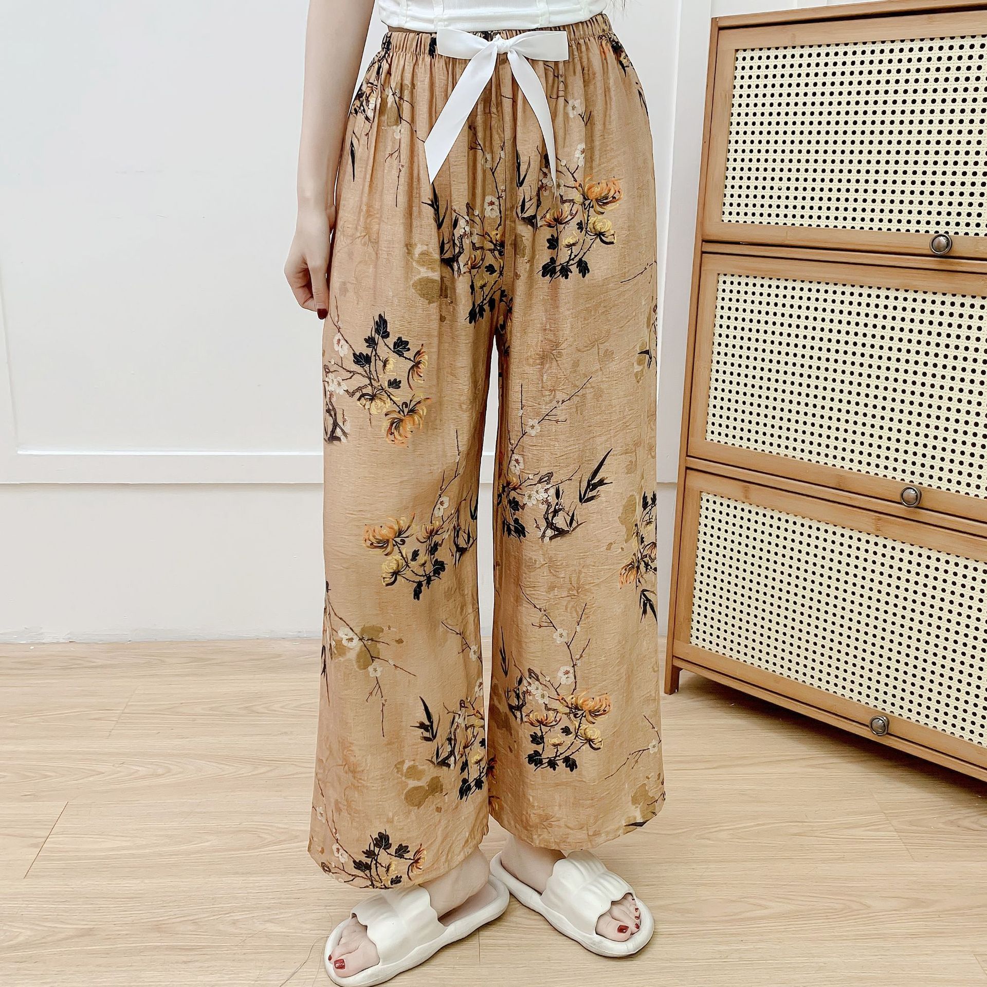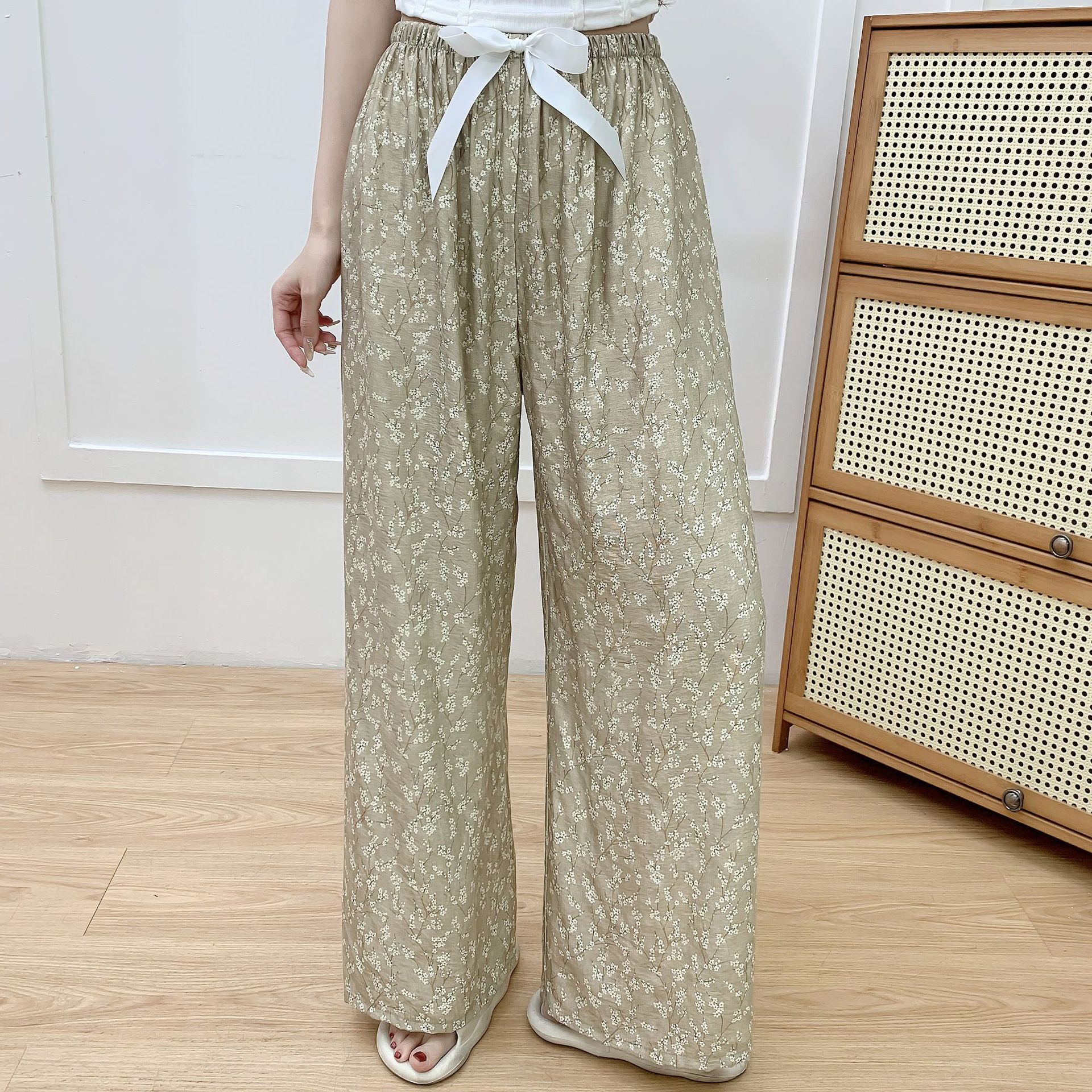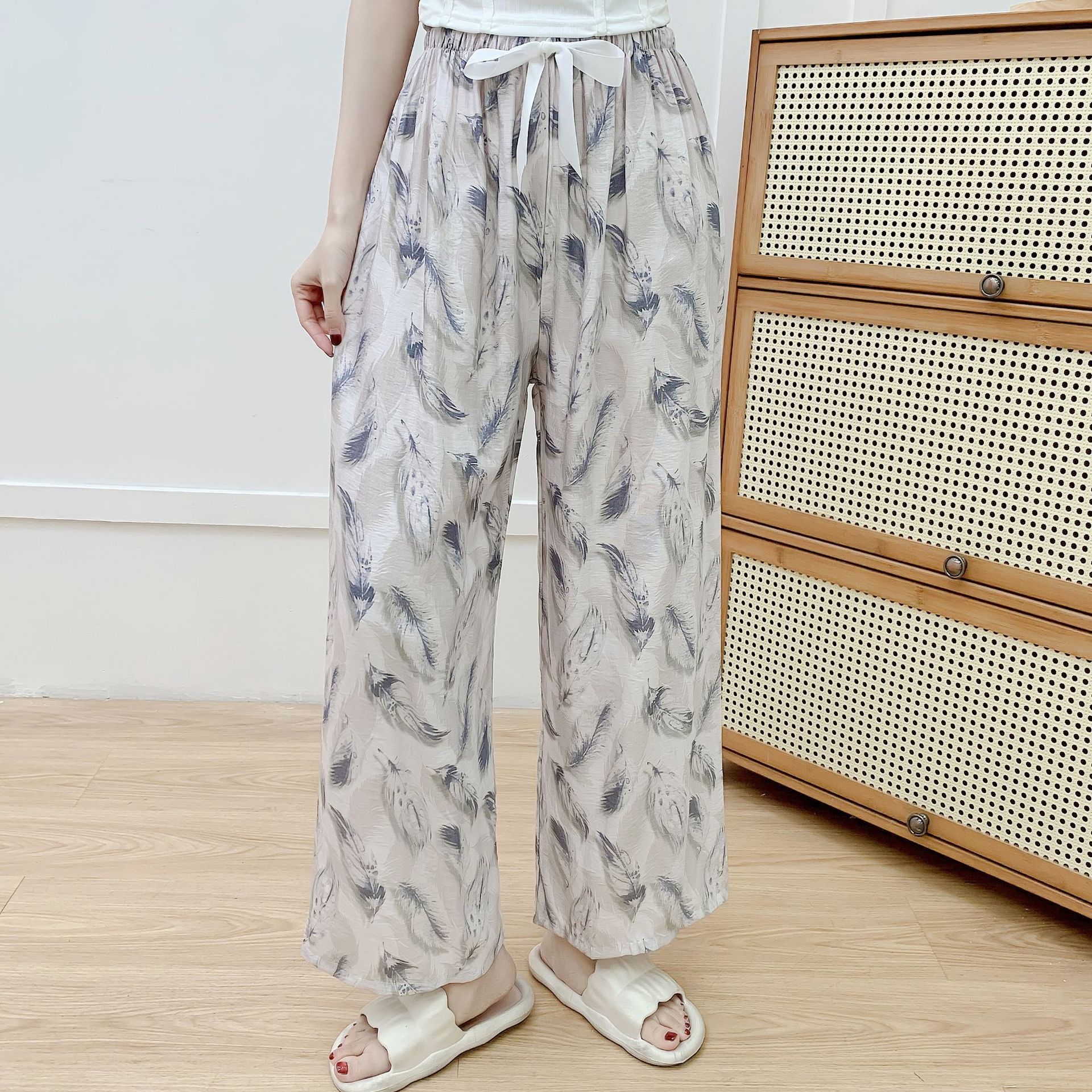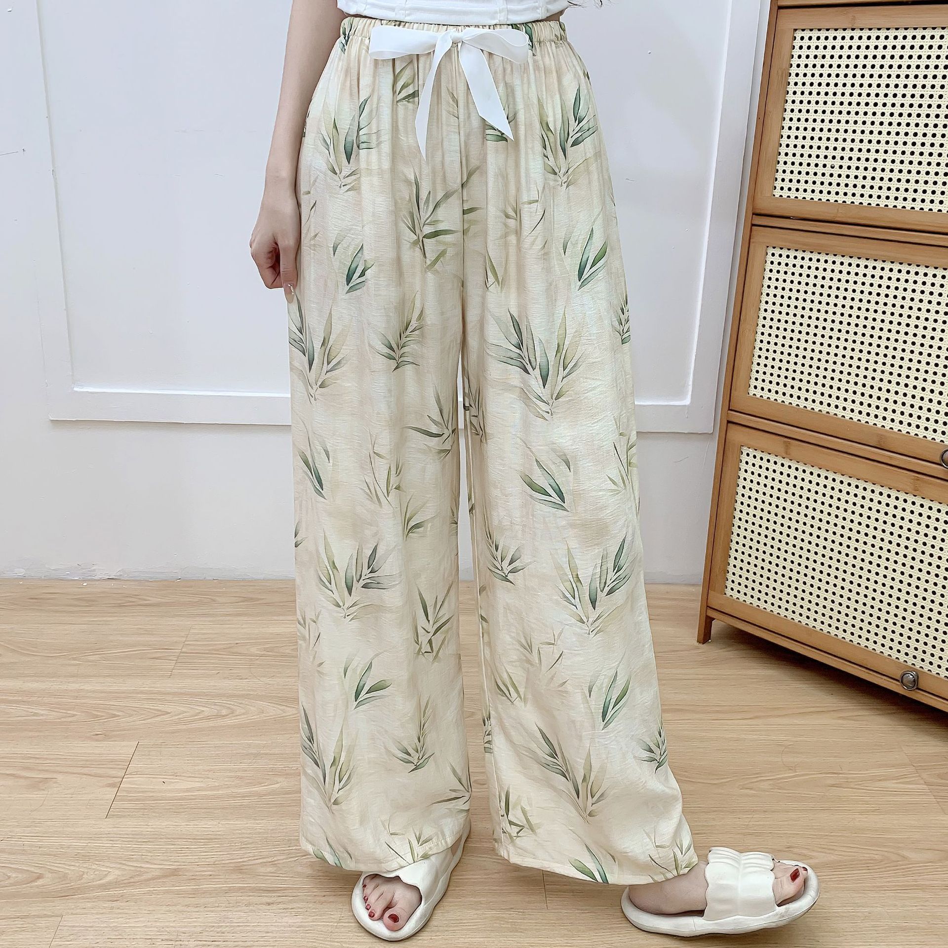 코튼 리넨 파자마 바지 여성의 여름 새로운 도착 넓은 다리 바지 플러스 사이즈 느슨한 외부 착용 방지 모기 캐주얼 바지 얇은 가정용 바지