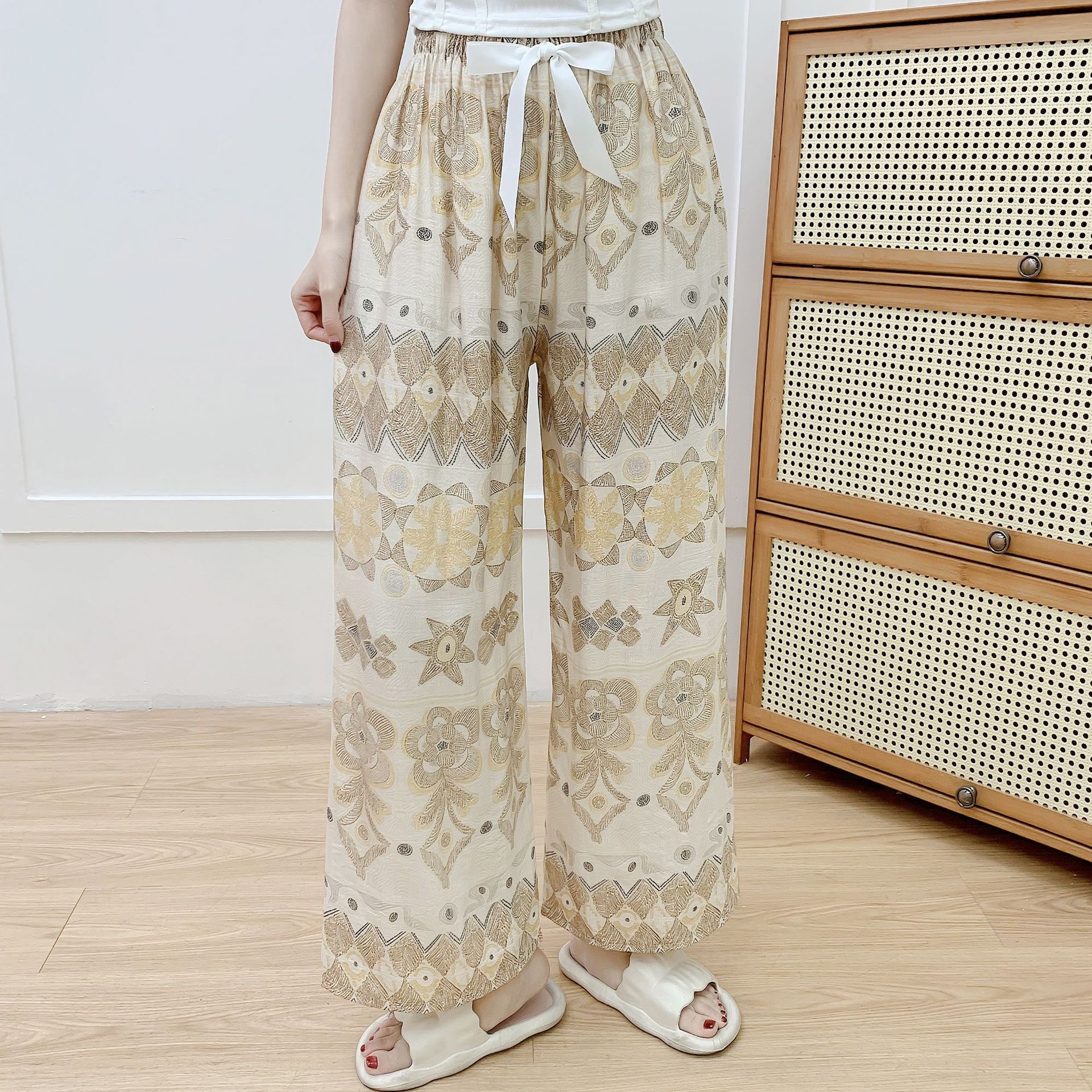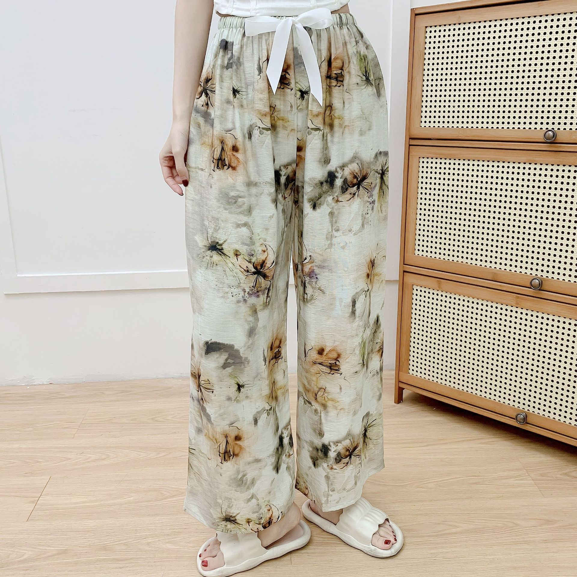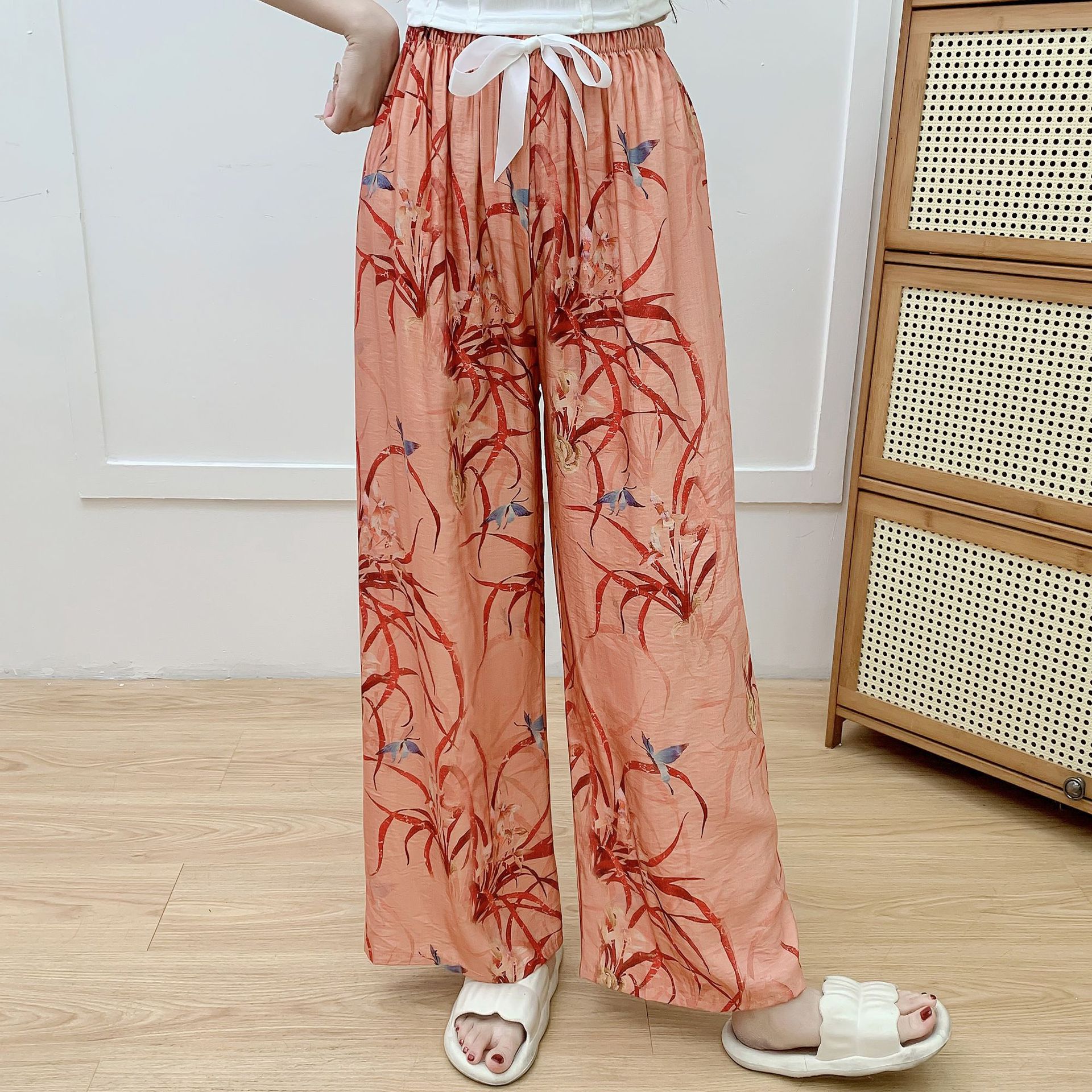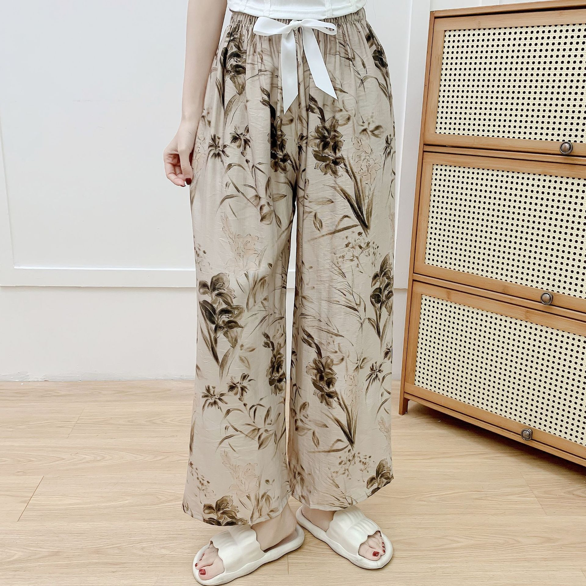 코튼 리넨 파자마 바지 여성의 여름 새로운 도착 넓은 다리 바지 플러스 사이즈 느슨한 외부 착용 방지 모기 캐주얼 바지 얇은 가정용 바지
