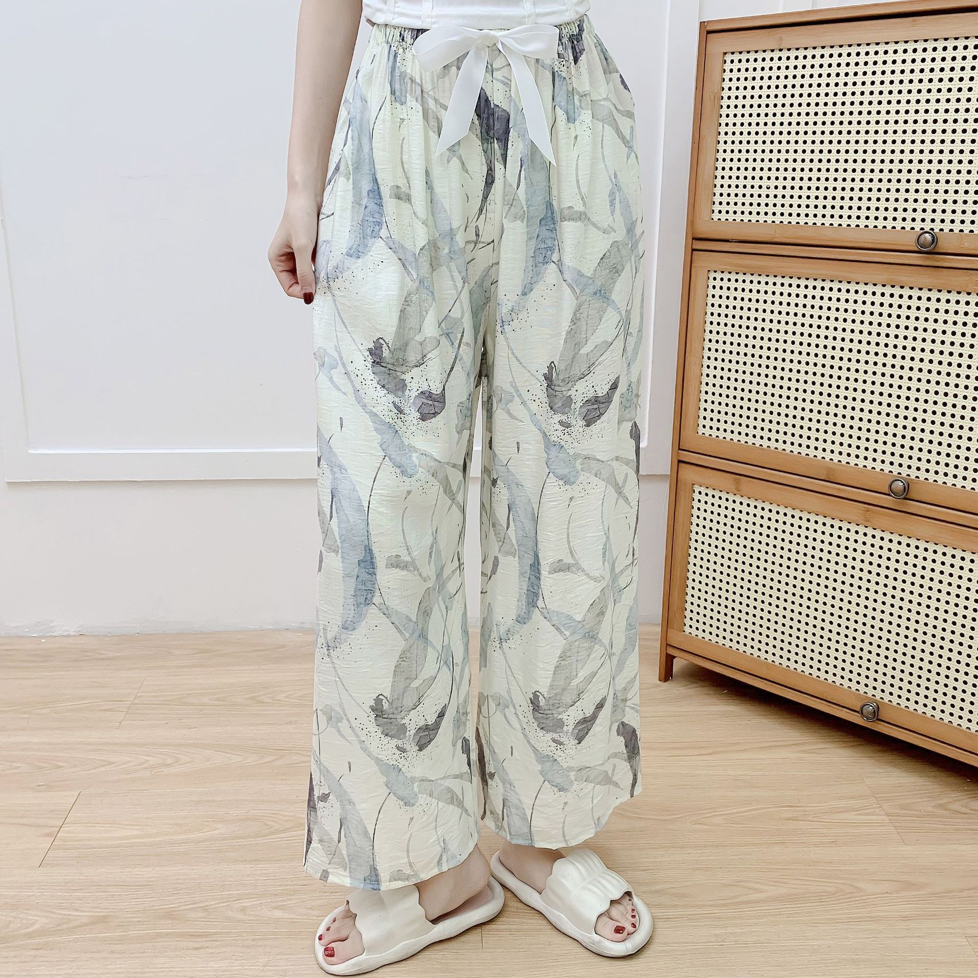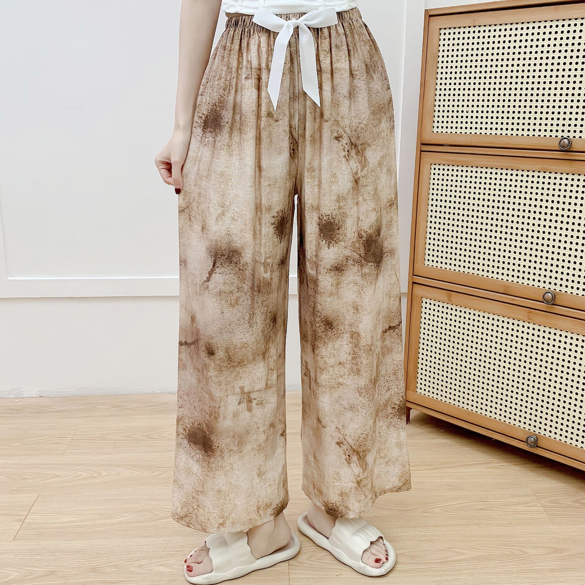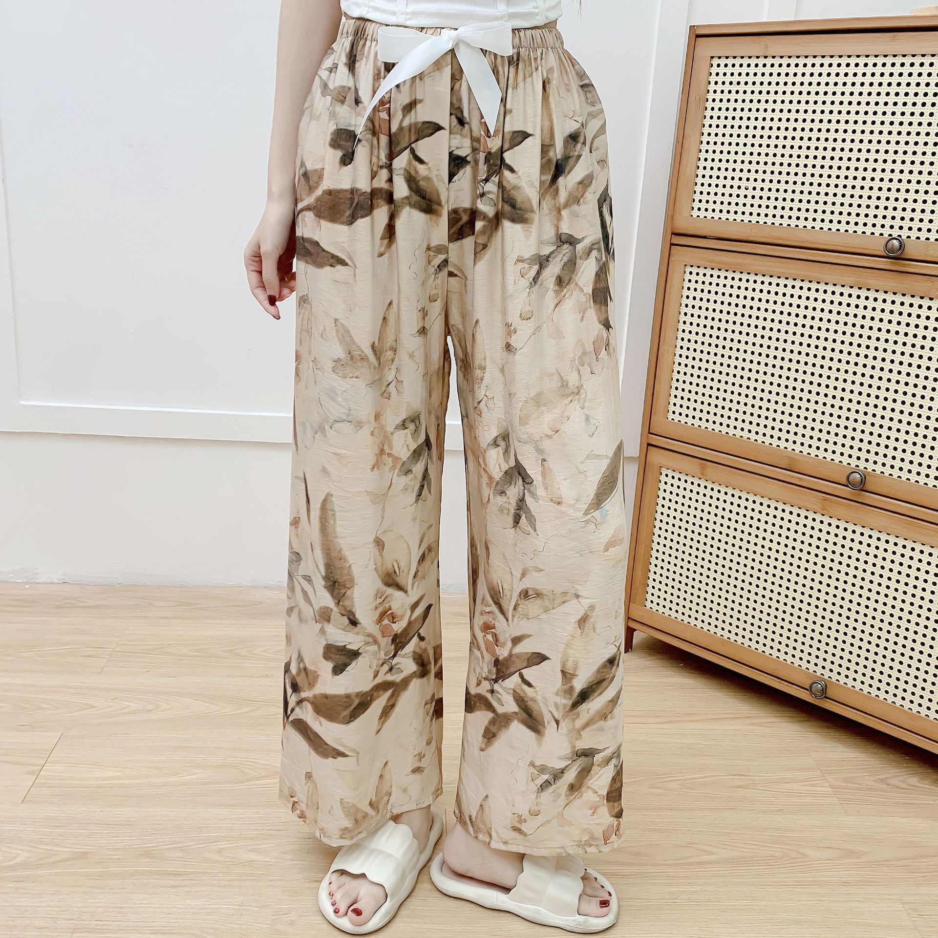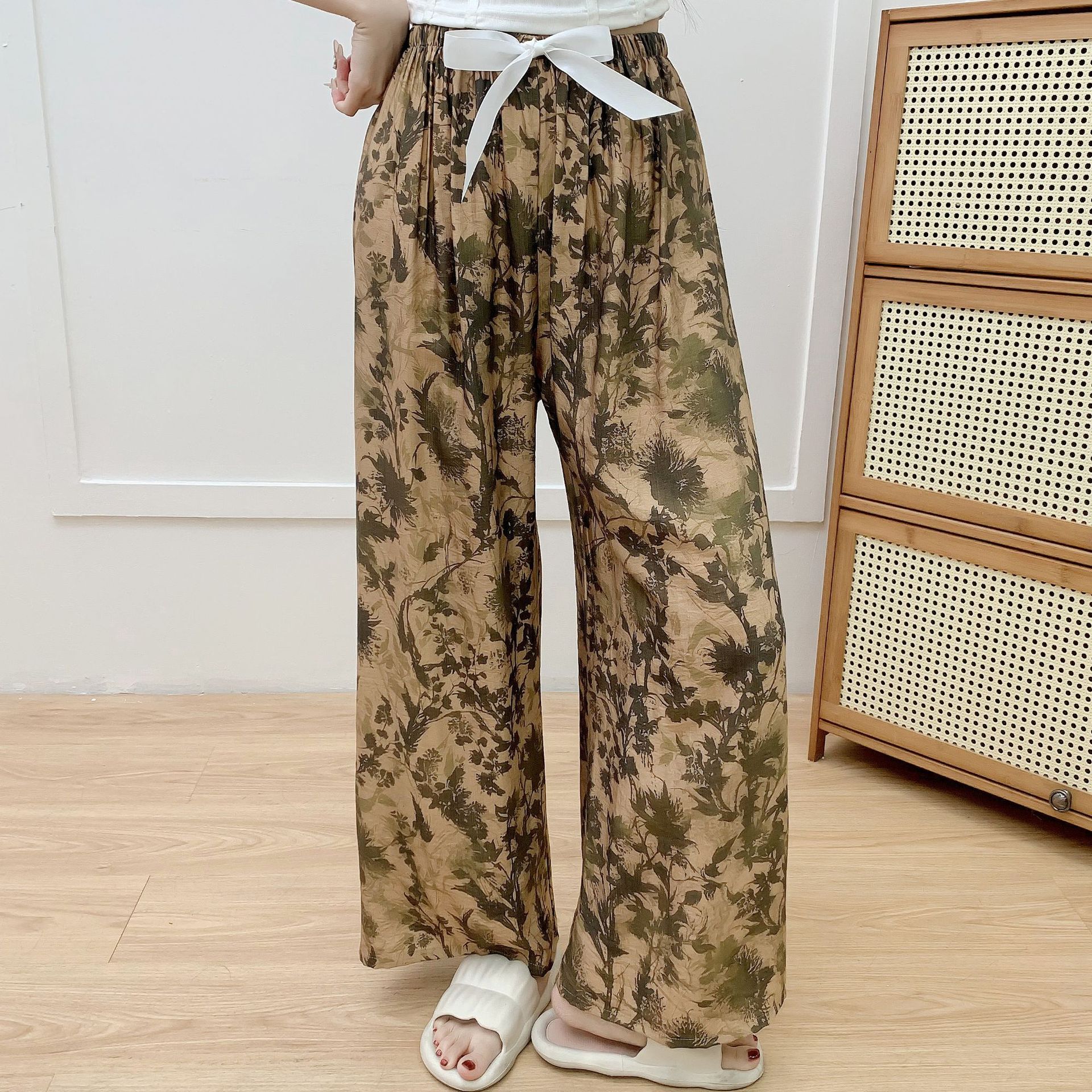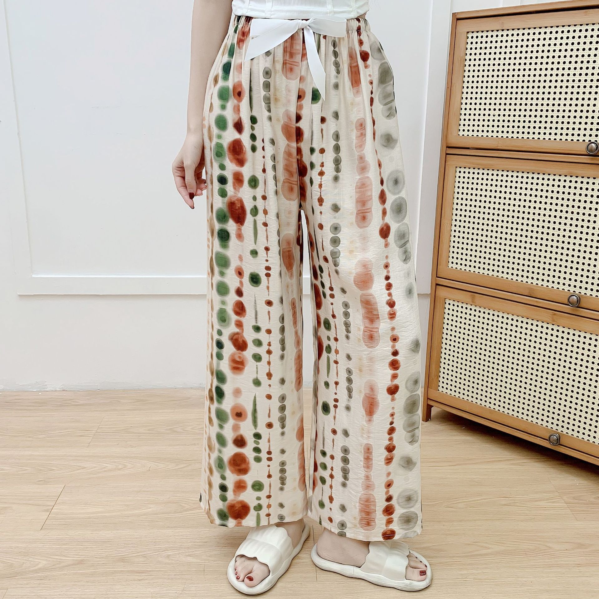 코튼 리넨 파자마 바지 여성의 여름 새로운 도착 넓은 다리 바지 플러스 사이즈 느슨한 외부 착용 방지 모기 캐주얼 바지 얇은 가정용 바지