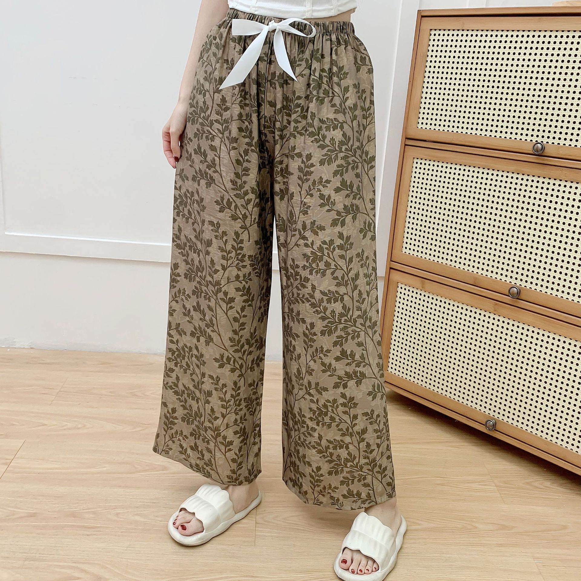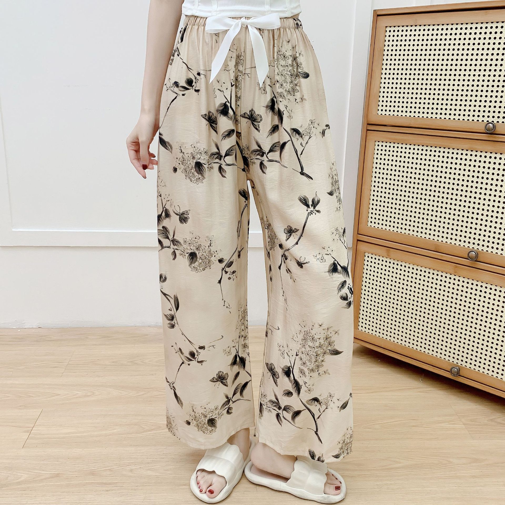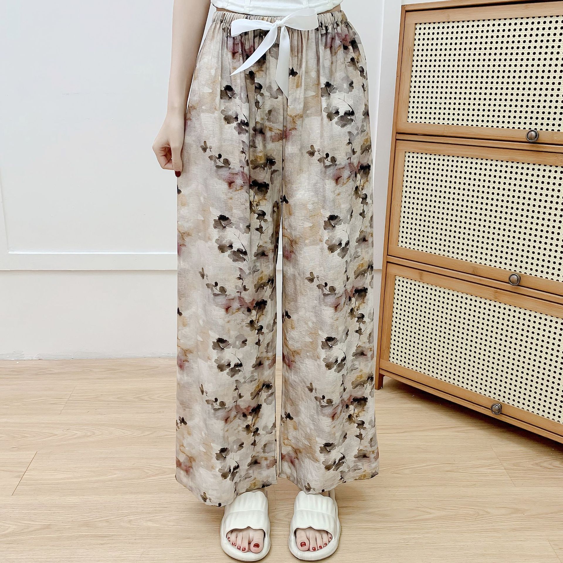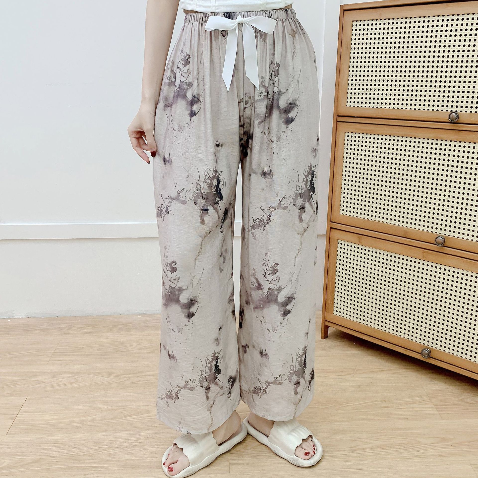 코튼 리넨 파자마 바지 여성의 여름 새로운 도착 넓은 다리 바지 플러스 사이즈 느슨한 외부 착용 방지 모기 캐주얼 바지 얇은 가정용 바지