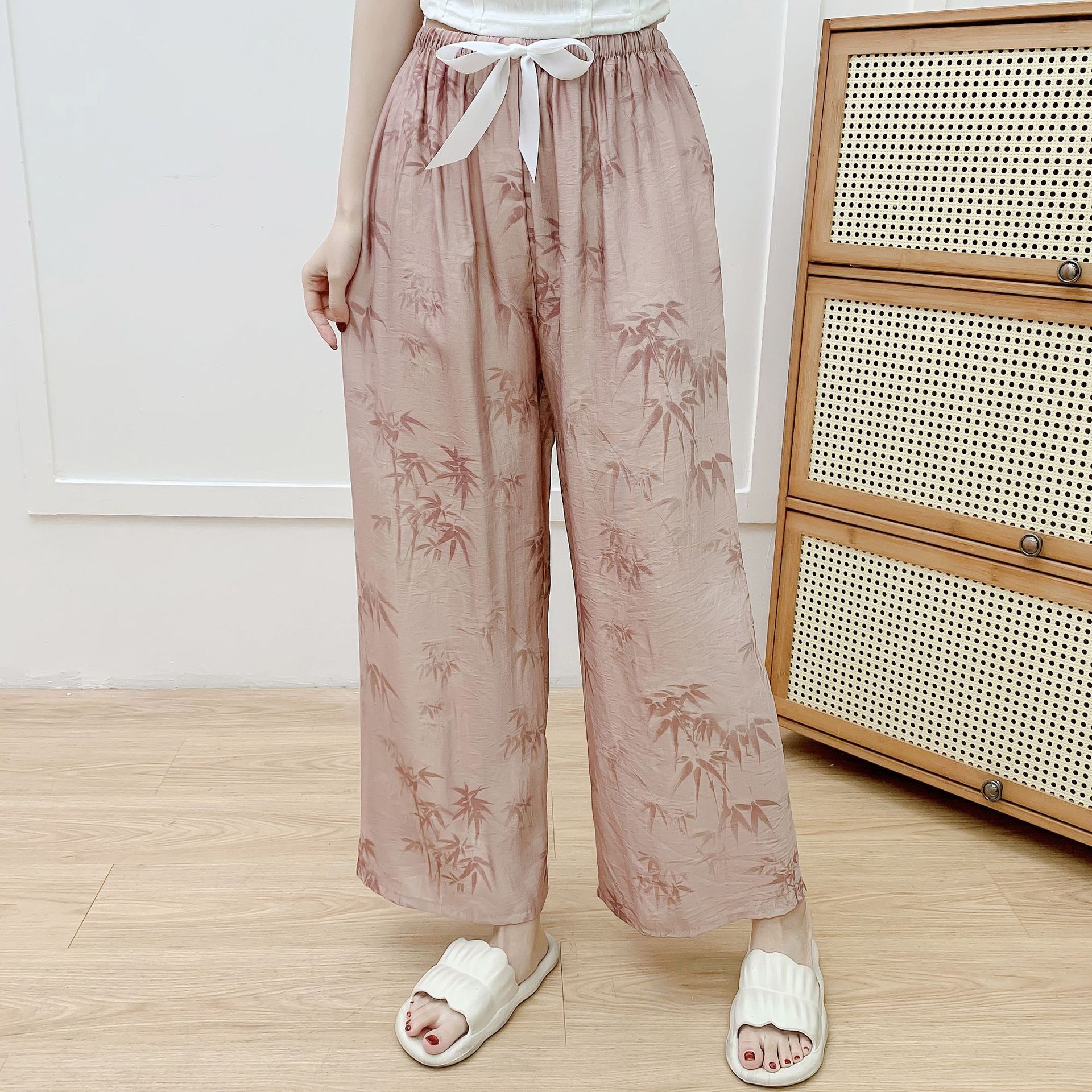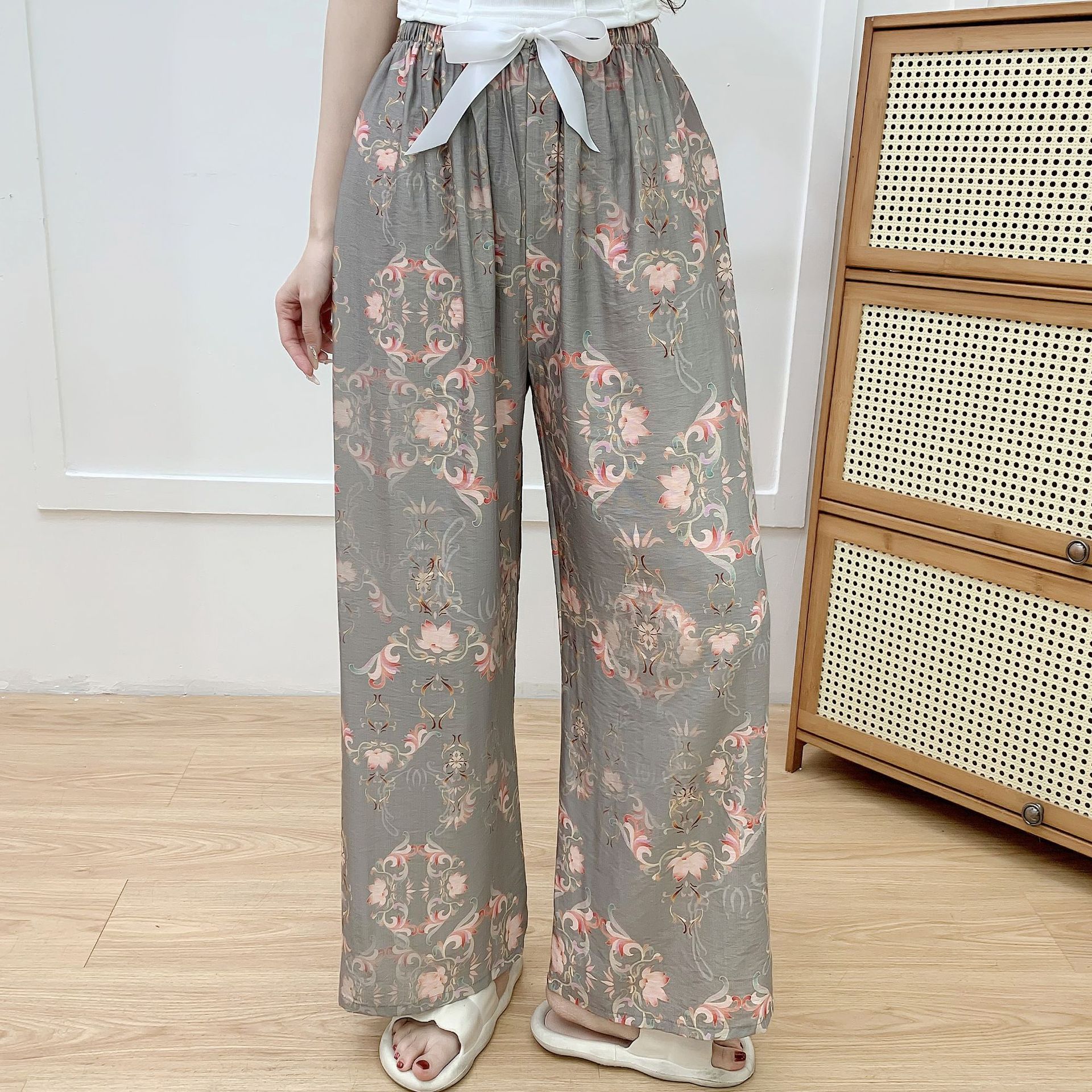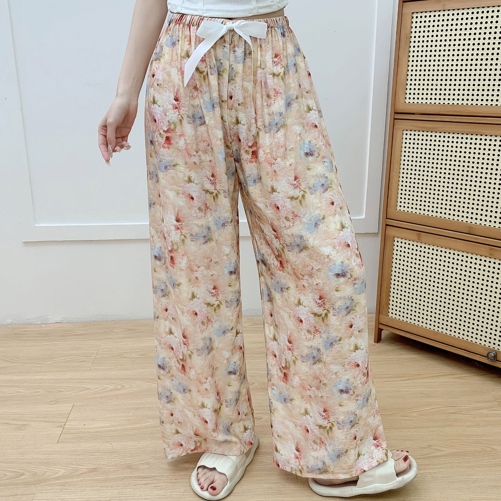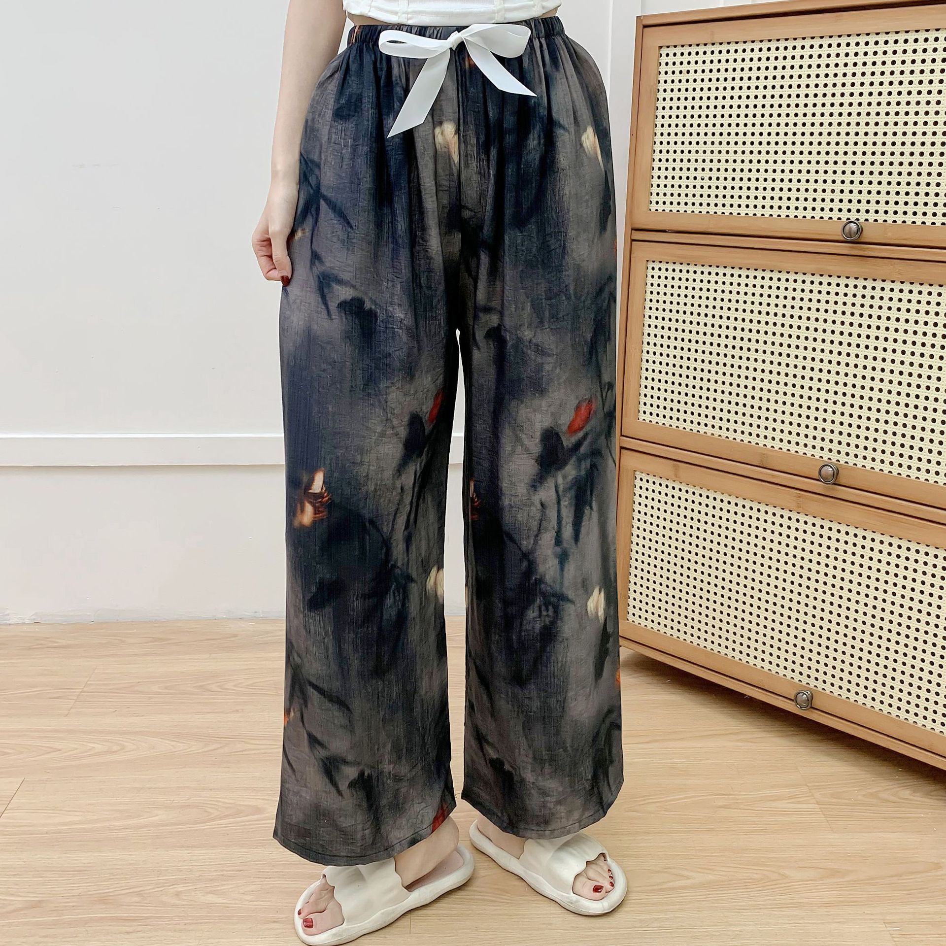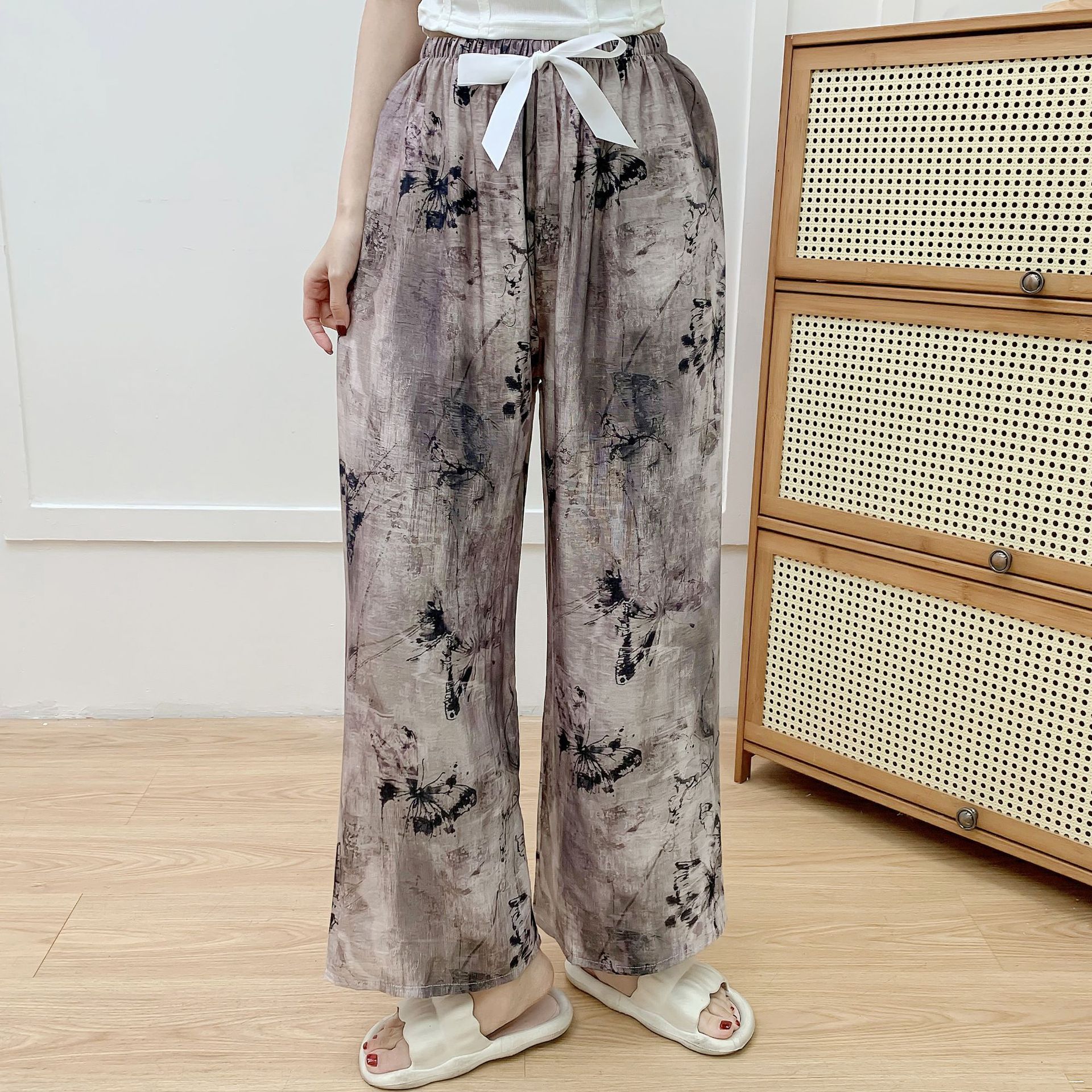 코튼 리넨 파자마 바지 여성의 여름 새로운 도착 넓은 다리 바지 플러스 사이즈 느슨한 외부 착용 방지 모기 캐주얼 바지 얇은 가정용 바지