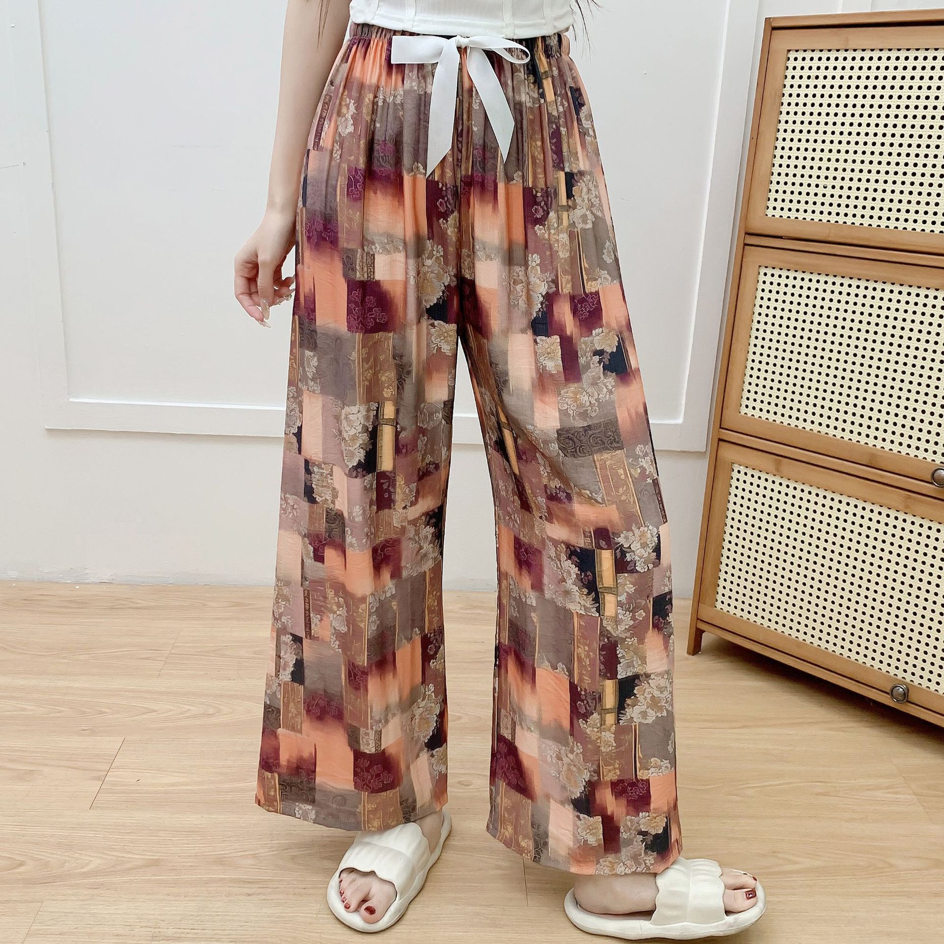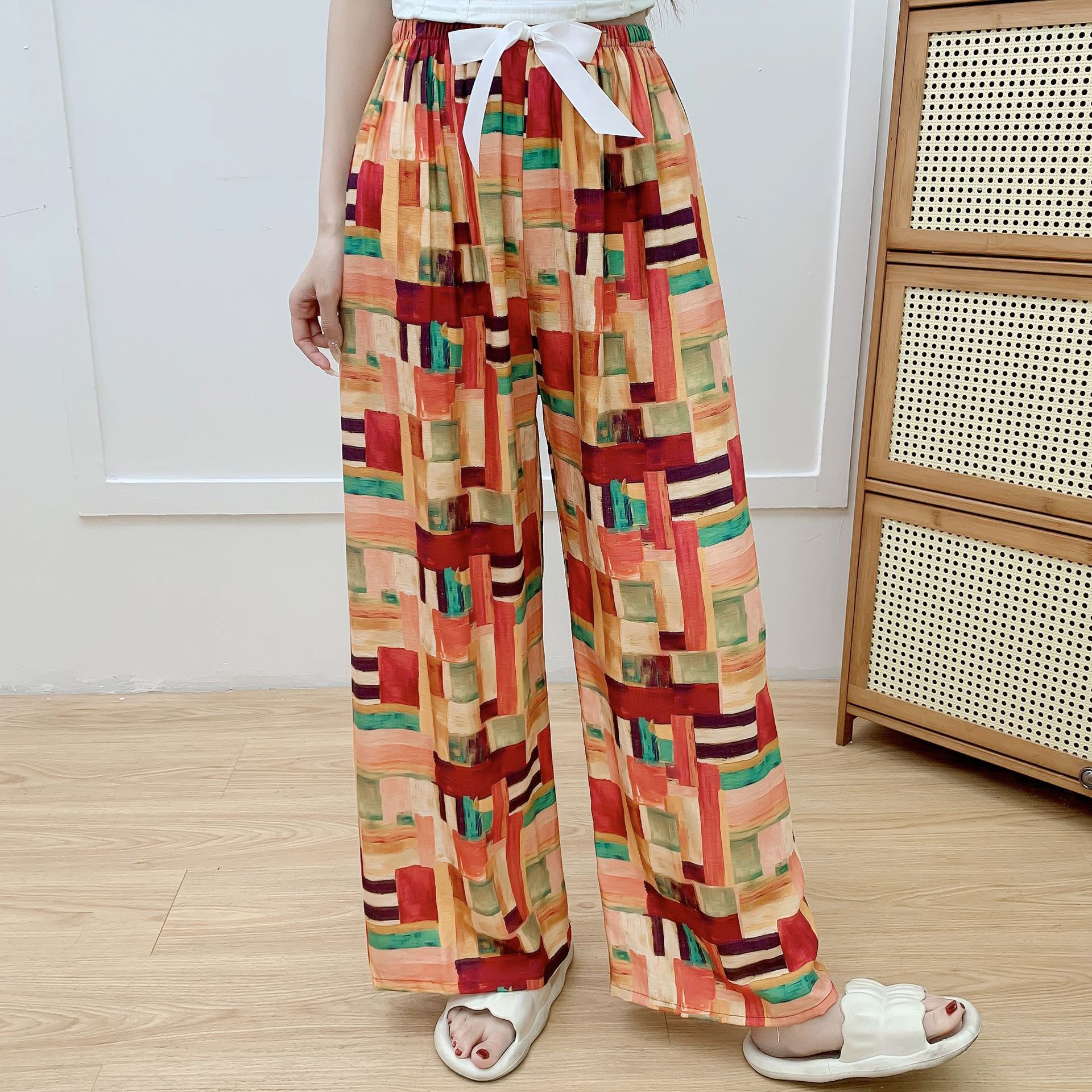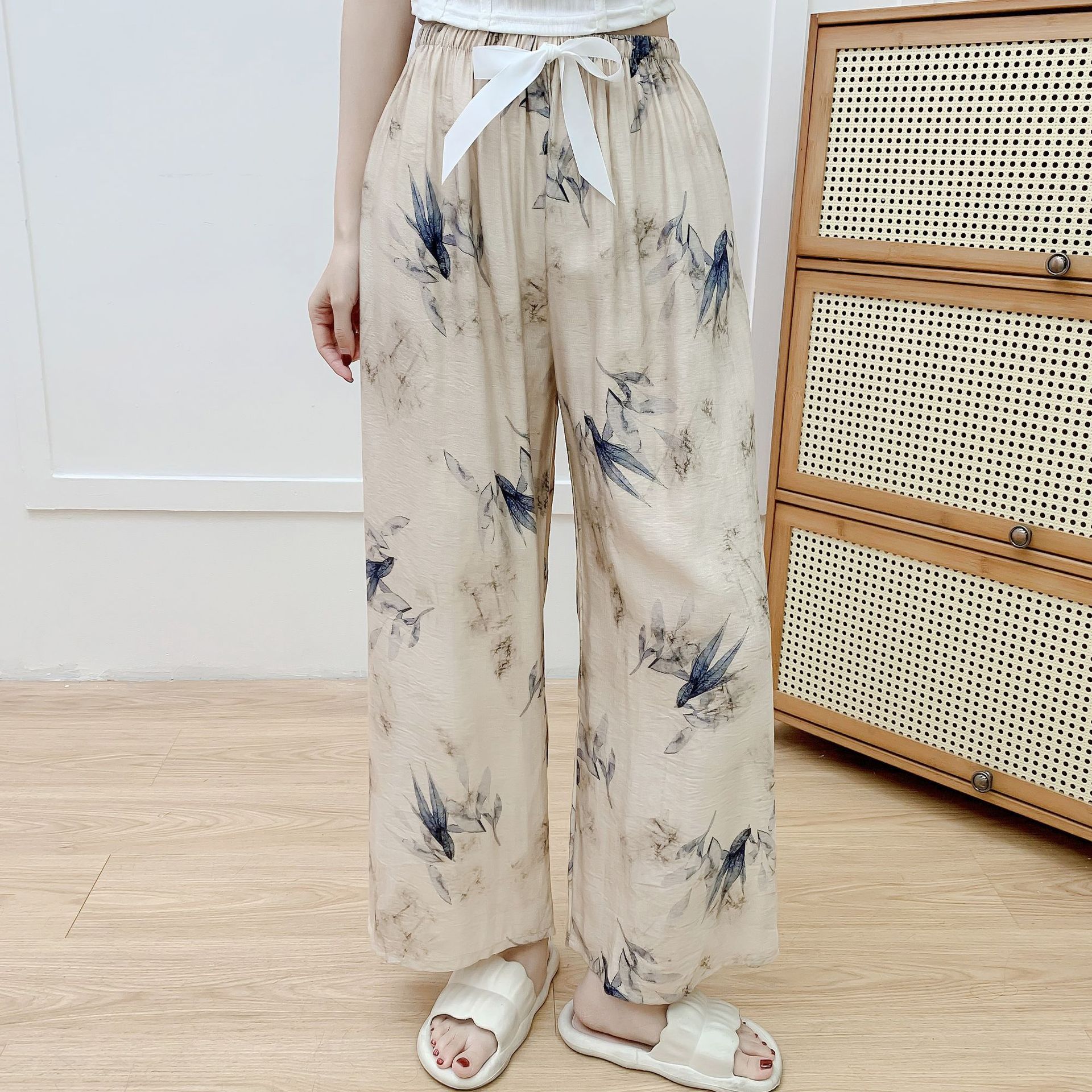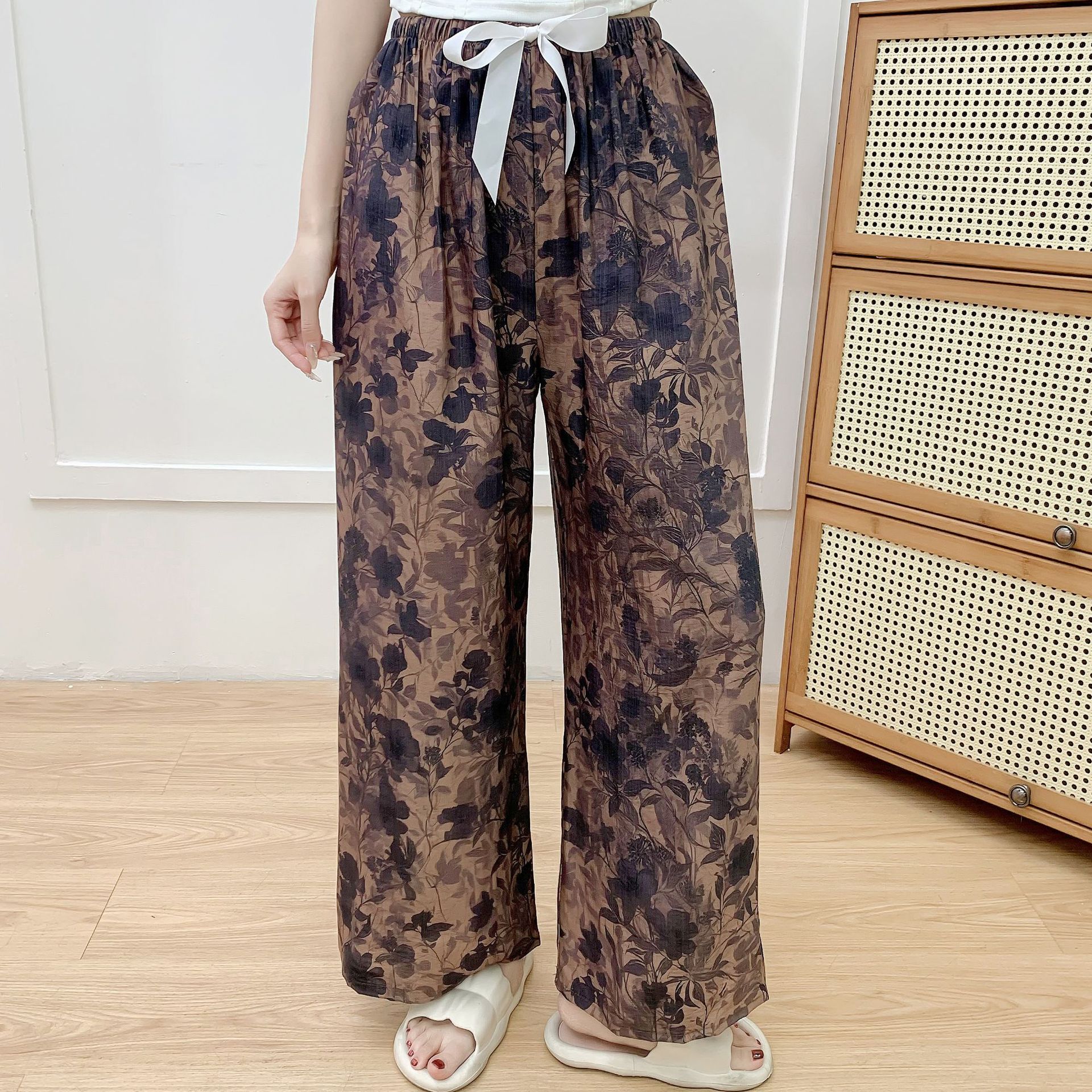코튼 리넨 파자마 바지 여성의 여름 새로운 도착 넓은 다리 바지 플러스 사이즈 느슨한 외부 착용 방지 모기 캐주얼 바지 얇은 가정용 바지