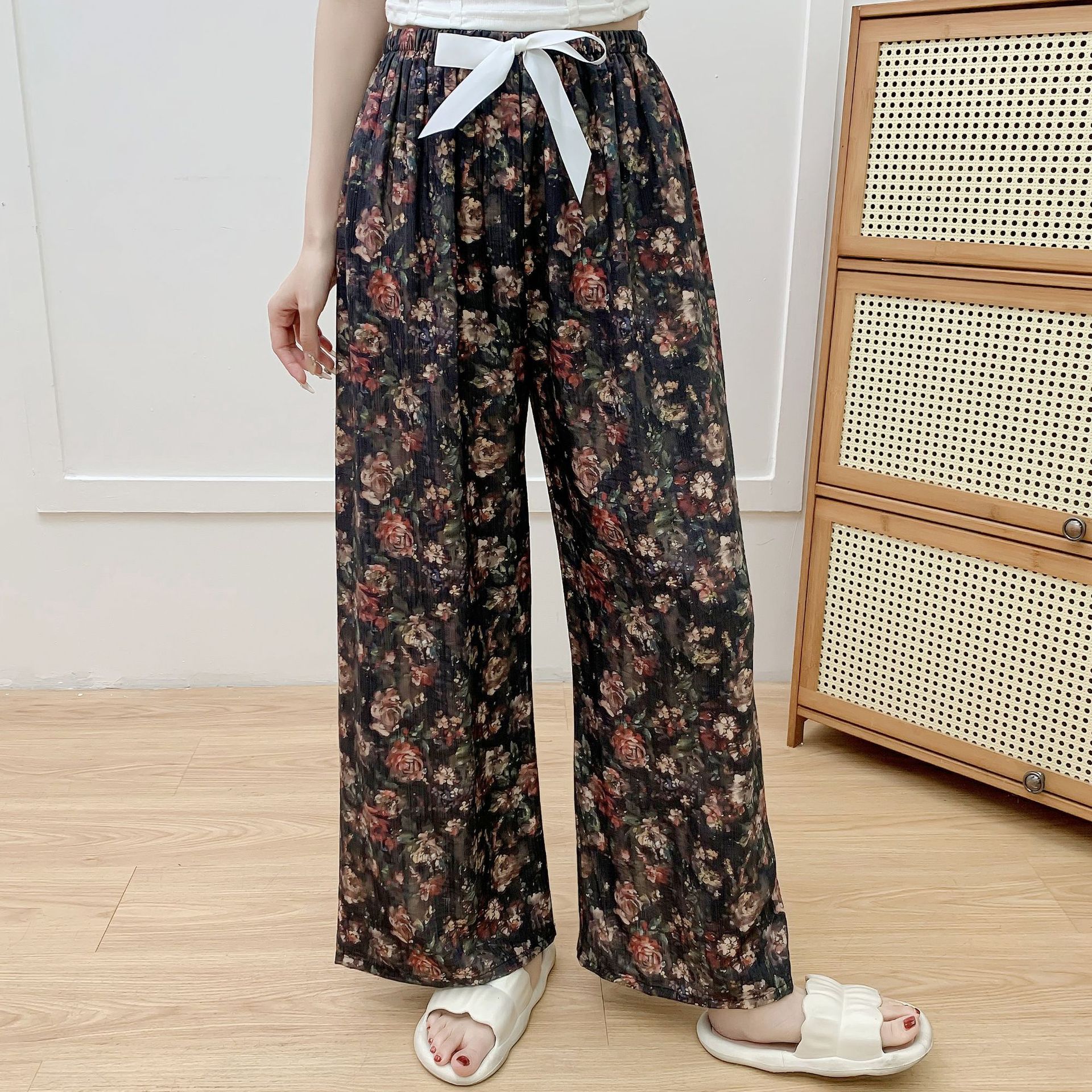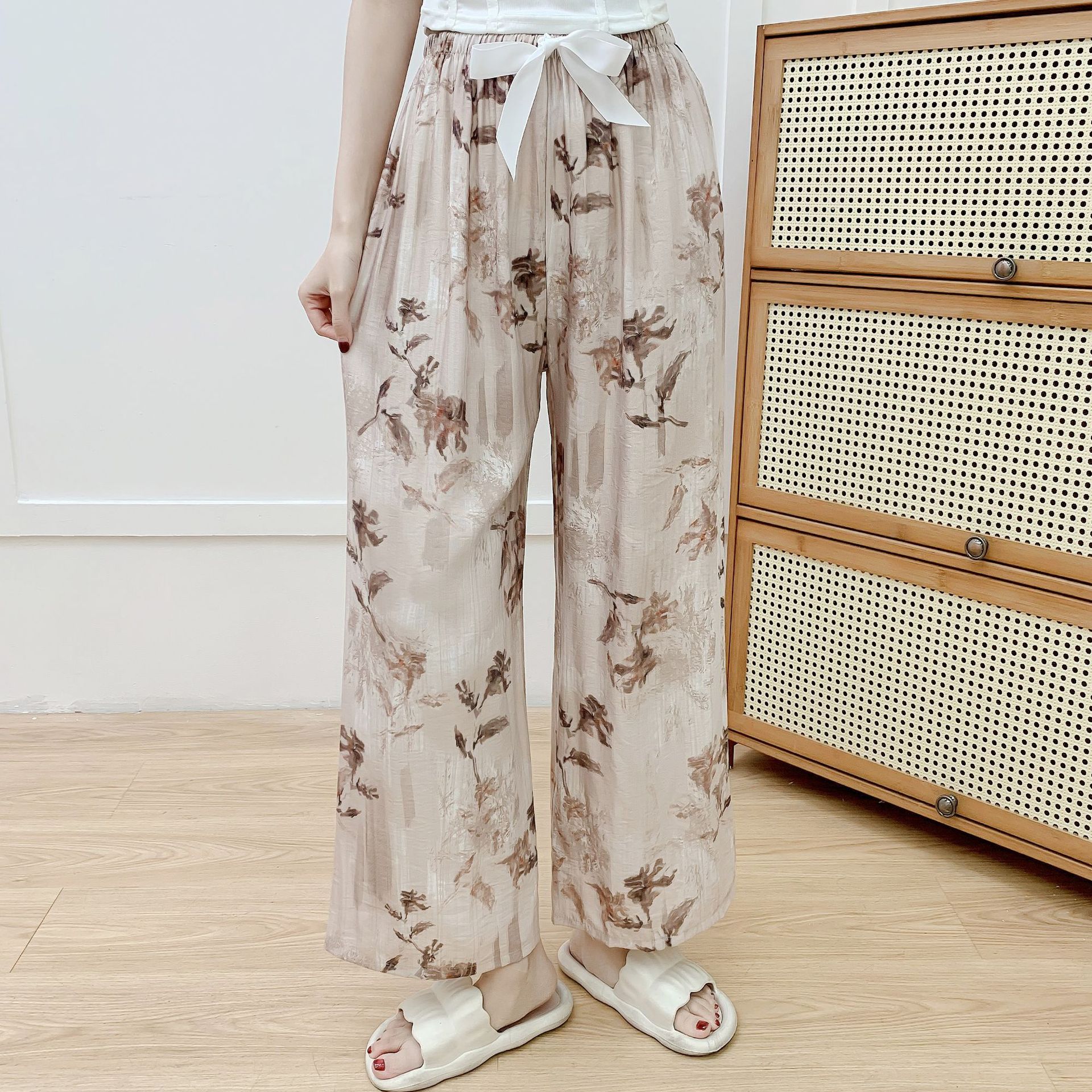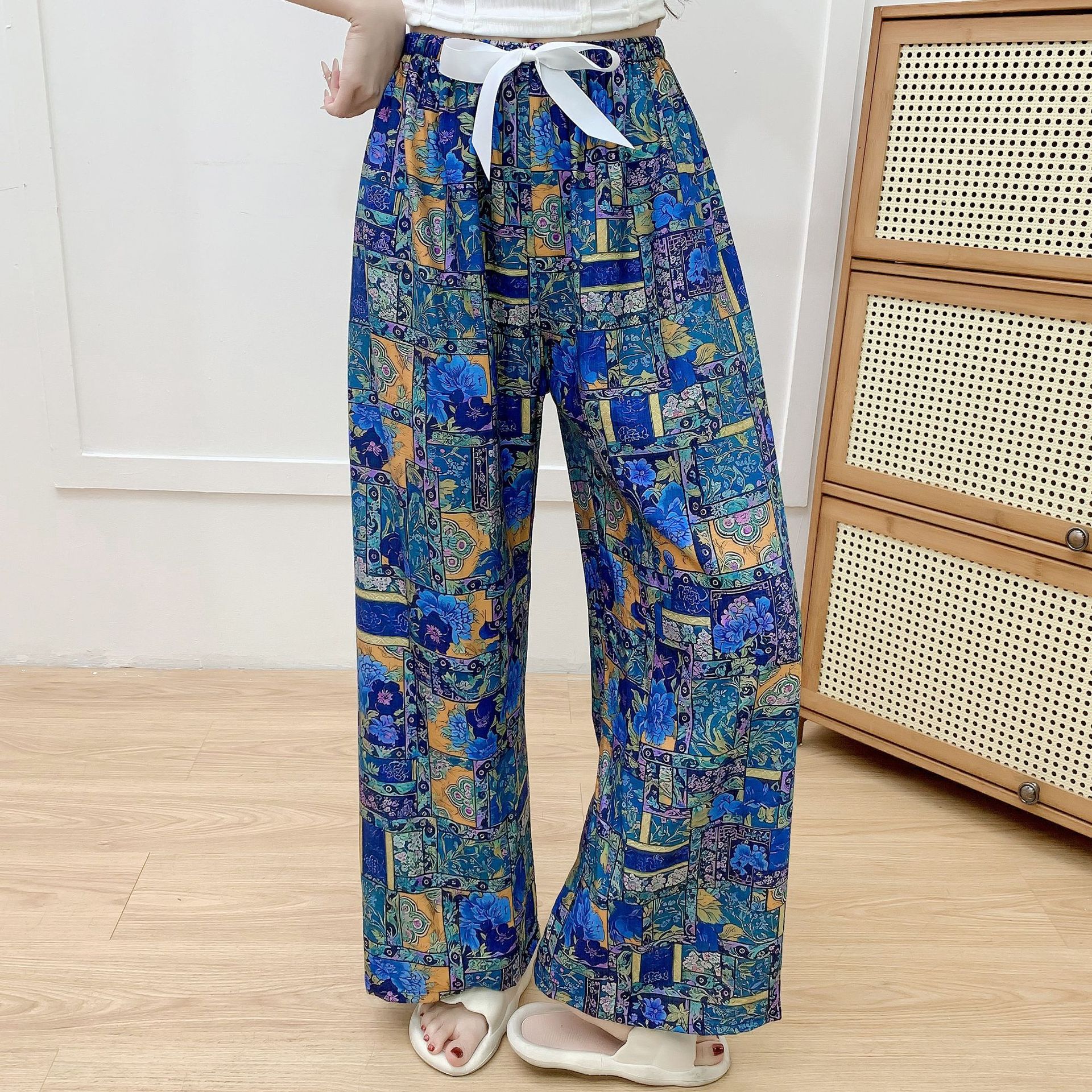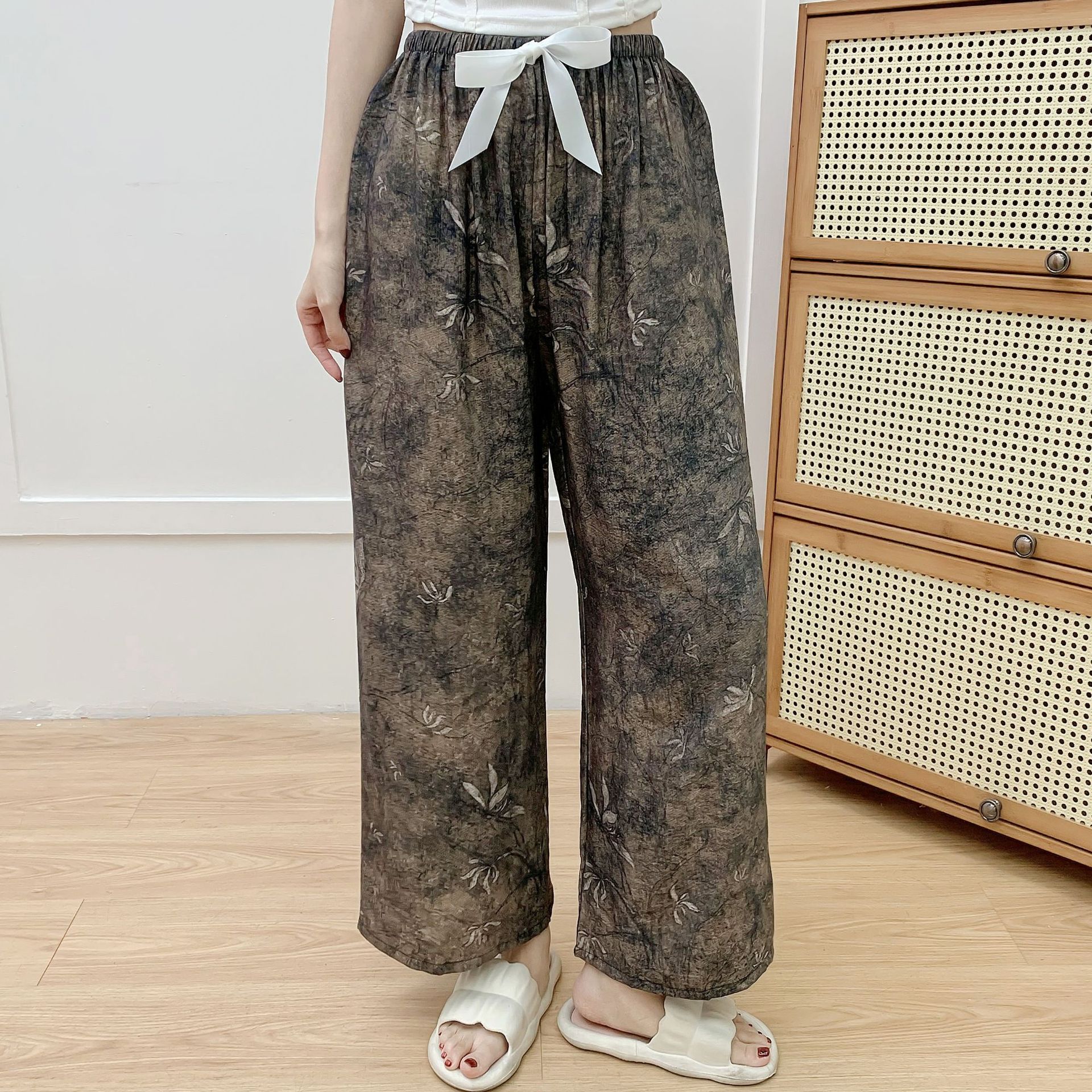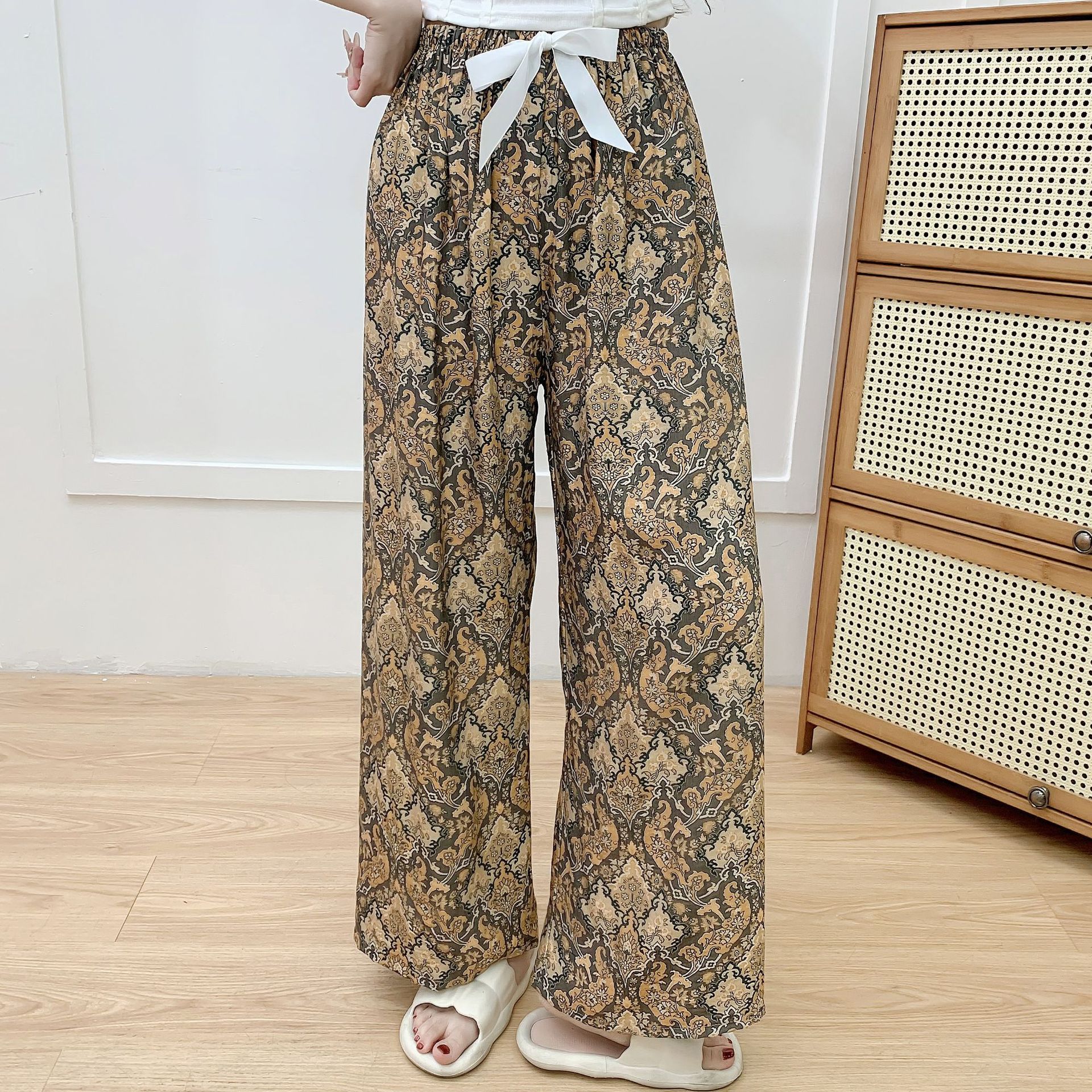 코튼 리넨 파자마 바지 여성의 여름 새로운 도착 넓은 다리 바지 플러스 사이즈 느슨한 외부 착용 방지 모기 캐주얼 바지 얇은 가정용 바지