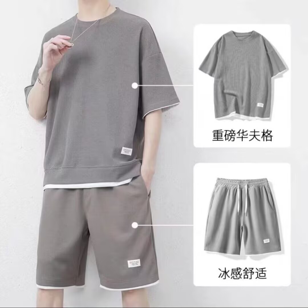 와플 반바지 세트 남성 여름 아이스 실크 짧은 소매 남성복 세트 잘 생긴 패션 브랜드 레저 스포츠웨어 세트