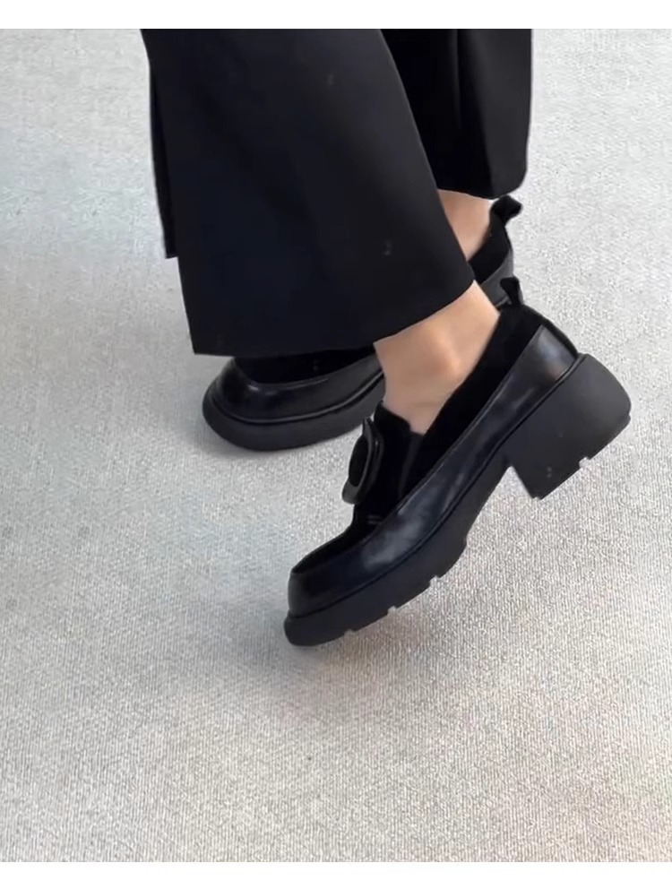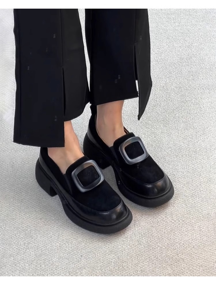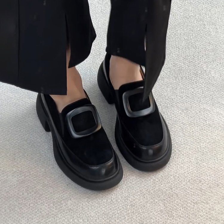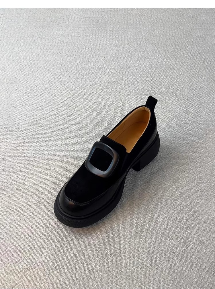 부드러운 가죽 버전! 여자 두꺼운 밑창 로퍼 레트로 스웨이드 라운드 토 스퀘어 버클 슬립 온 올 매치 블랙 가죽 신발