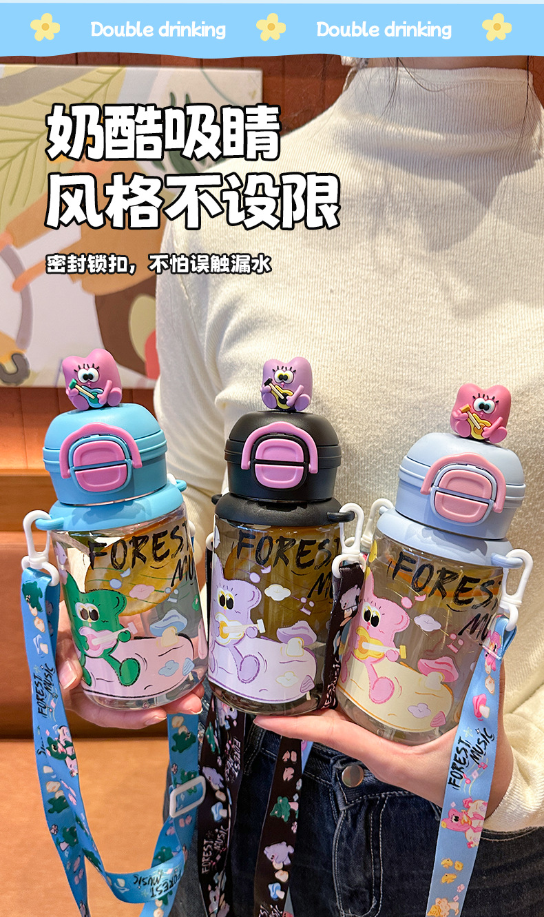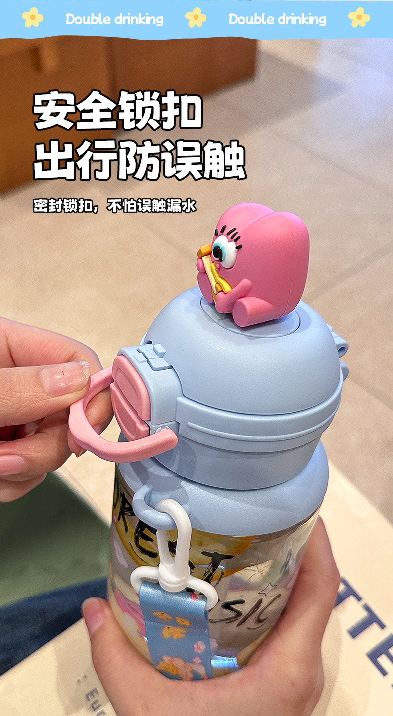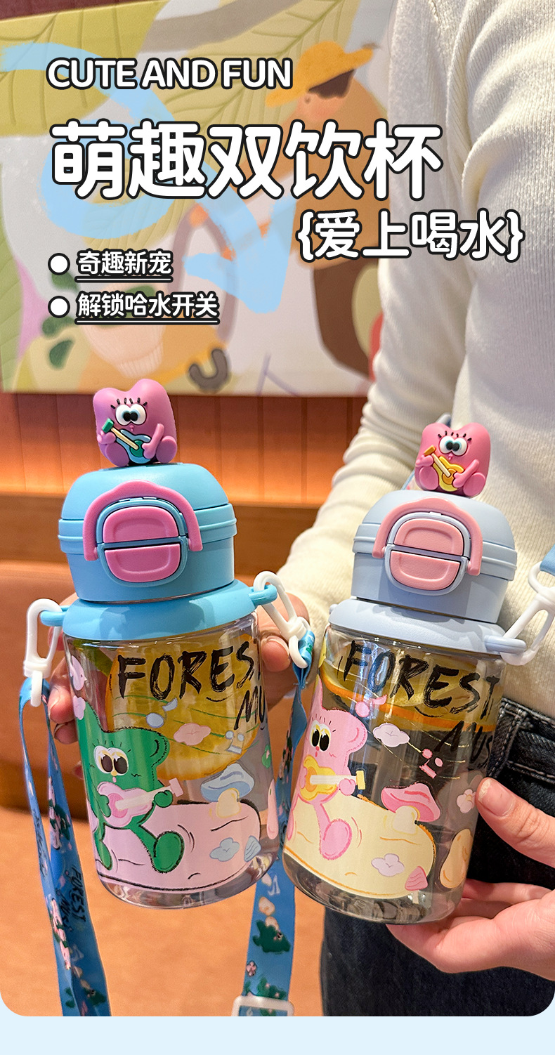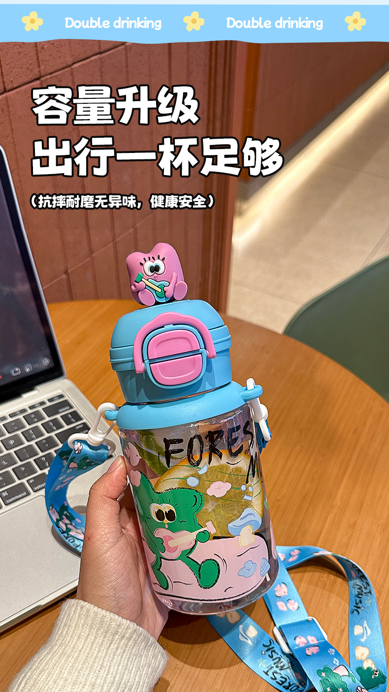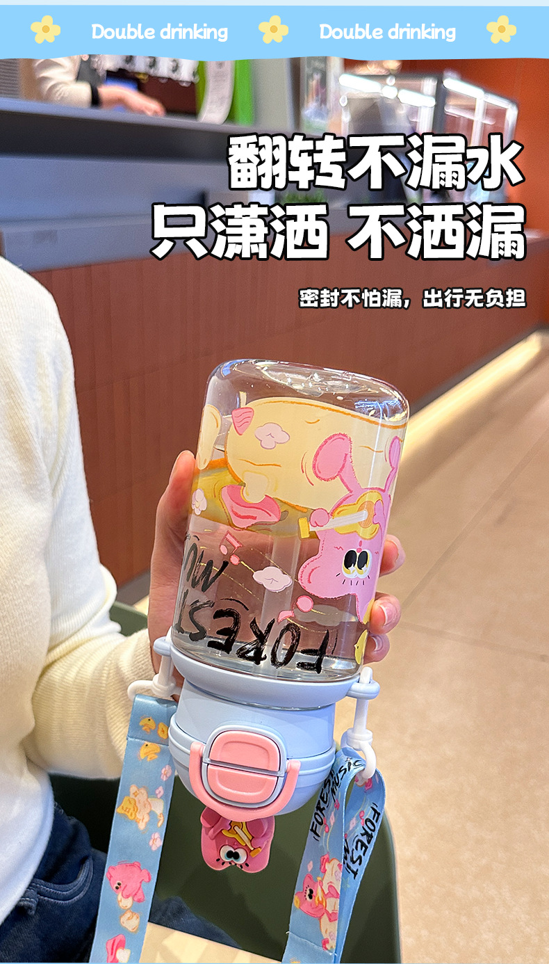 높은 가치의 플라스틱 컵 고온 만화 어린이 더블 마시는 밀짚 컵 휴대용 스트랩 소녀 유치원 주전자스토어 가기