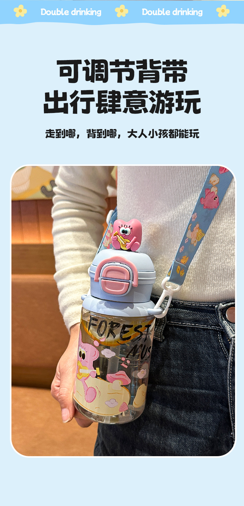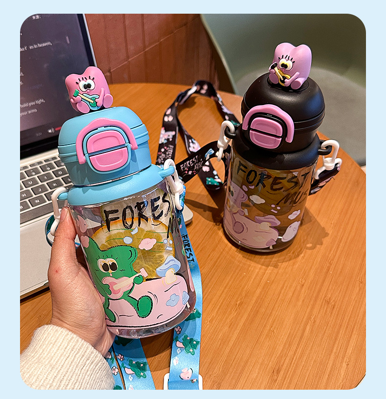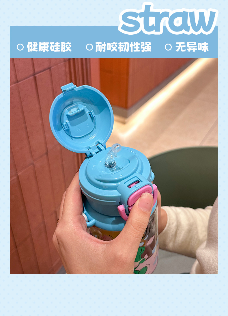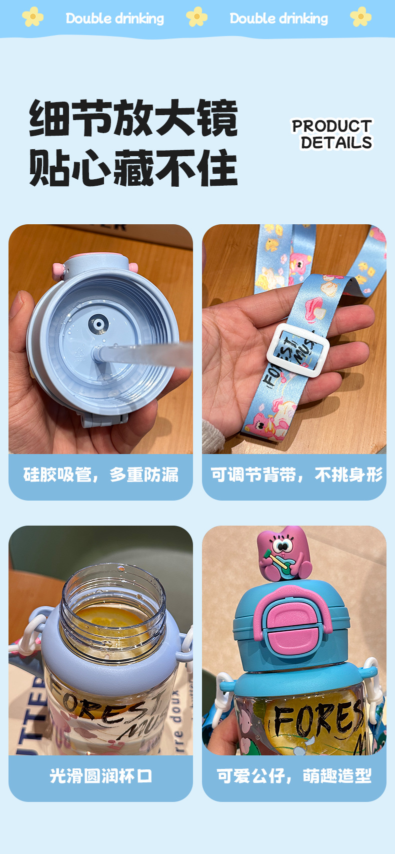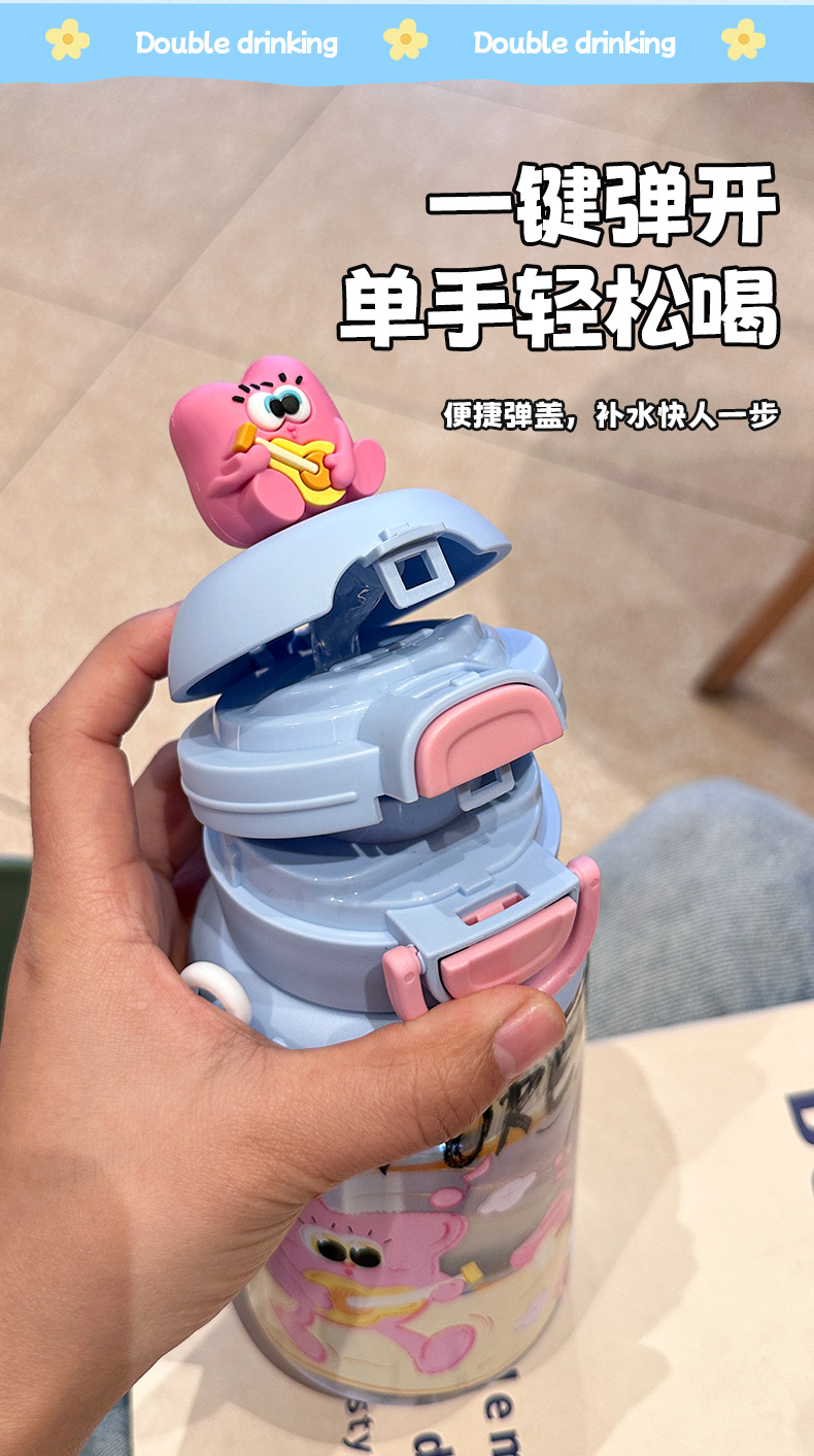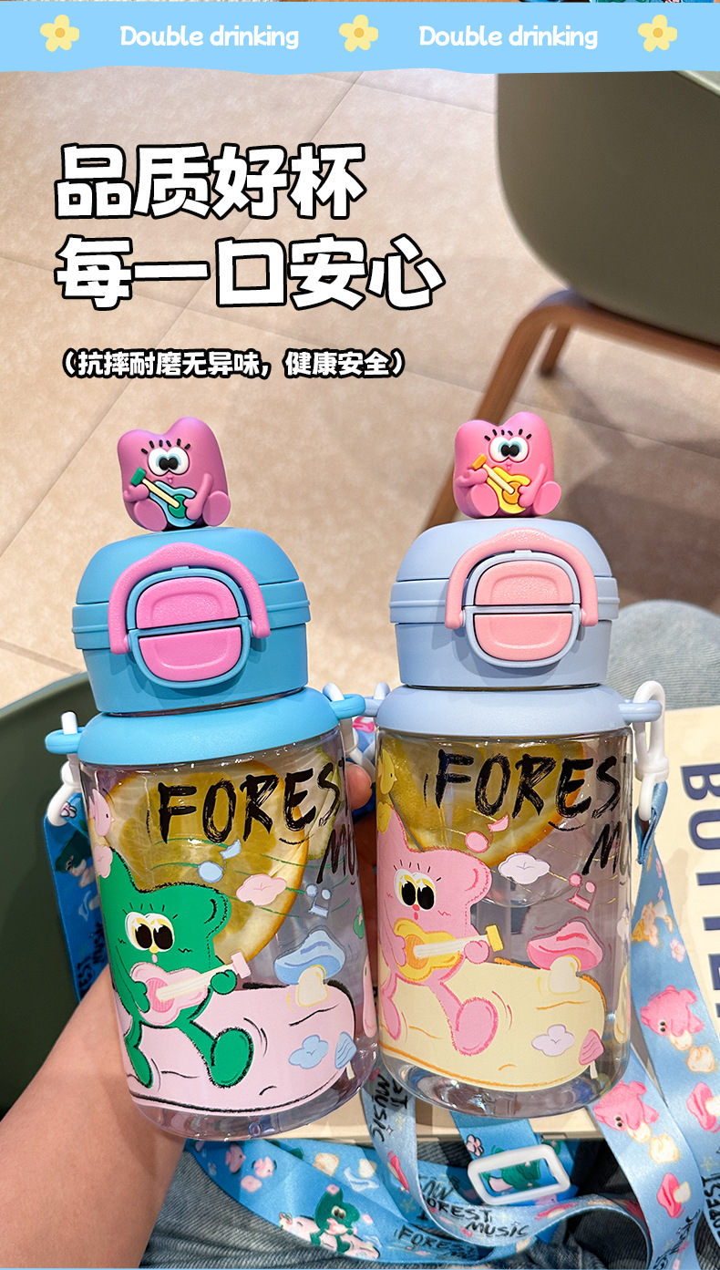 높은 가치의 플라스틱 컵 고온 만화 어린이 더블 마시는 밀짚 컵 휴대용 스트랩 소녀 유치원 주전자스토어 가기