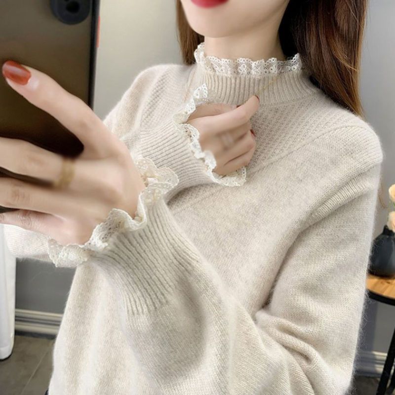 여성용 아우터웨어 스웨터 가을과 겨울 새로운 하프 터틀넥 레이스 바느질 니트베이스 셔츠 여성용 내부 패션스토어 가기