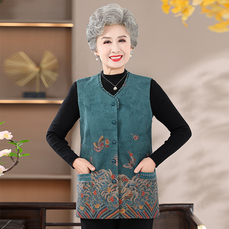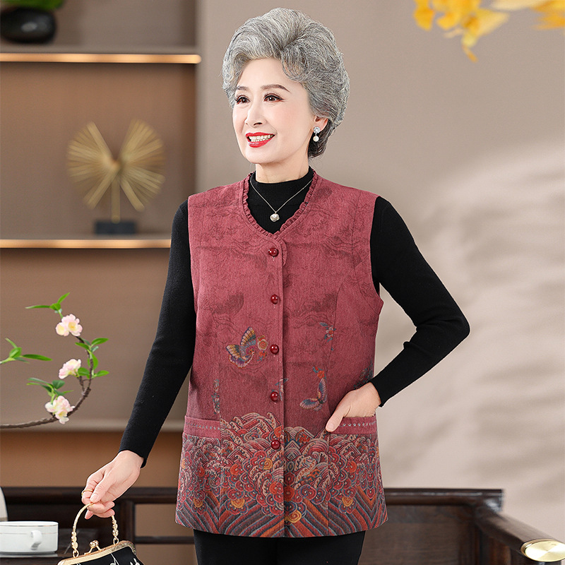 중년 및 노인 여성의 봄 양복 조끼 할머니의 새로운 중국식 조끼 노인 얇은 양복 조끼 어머니의 겉옷 바지