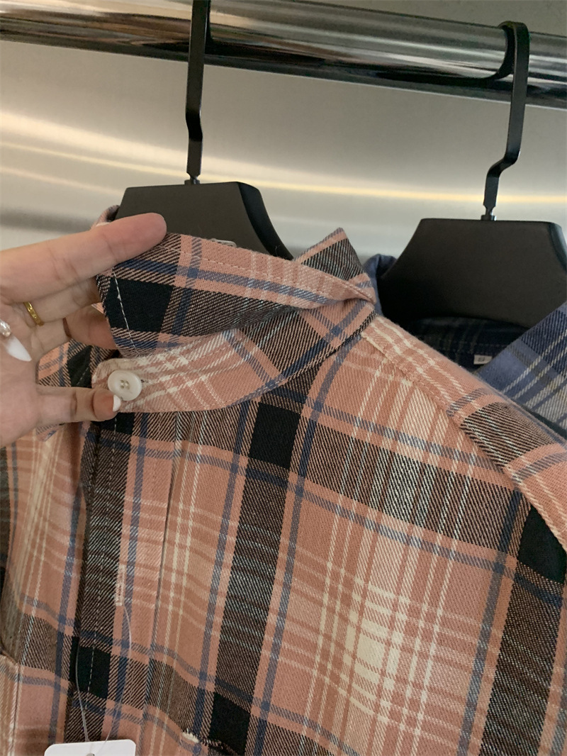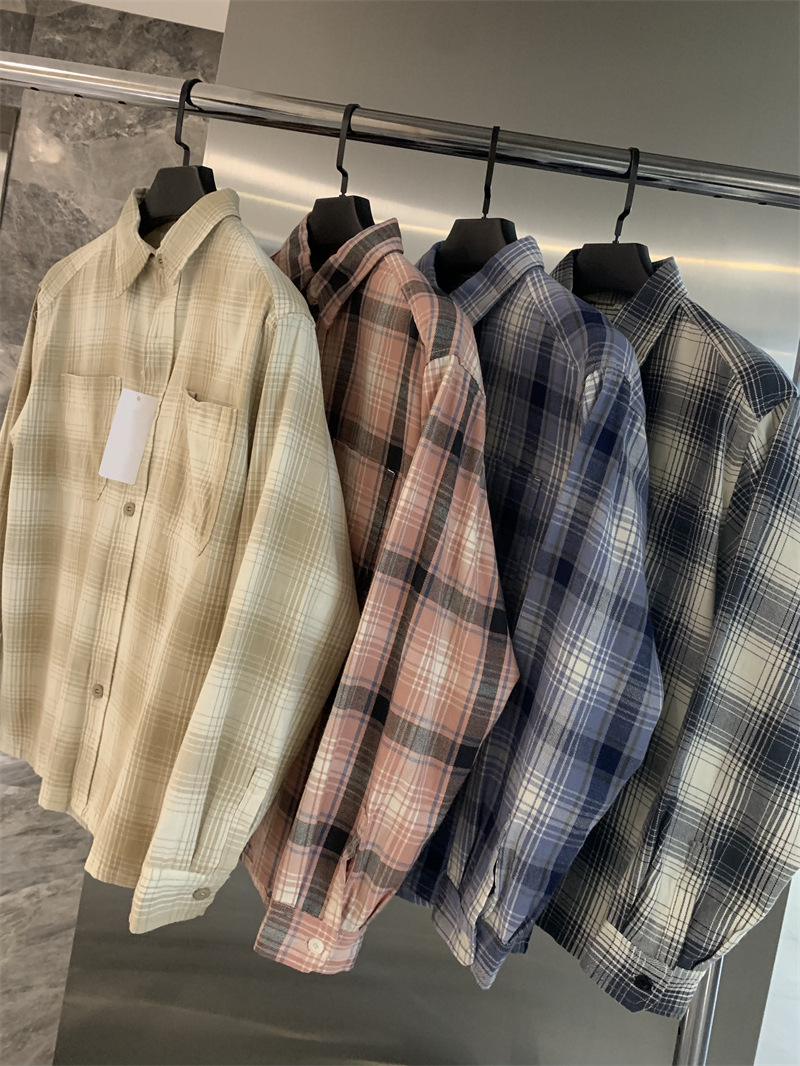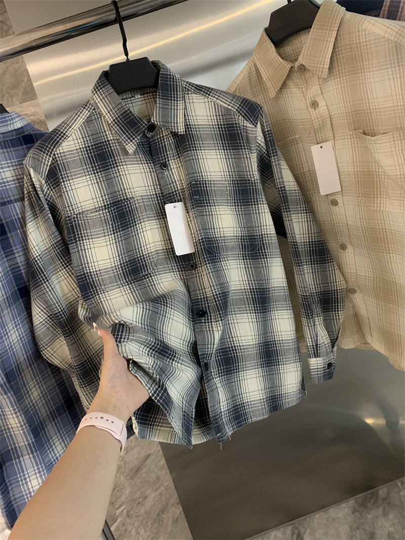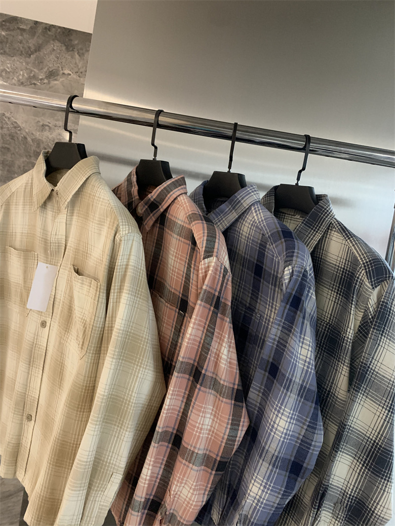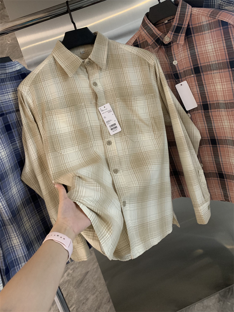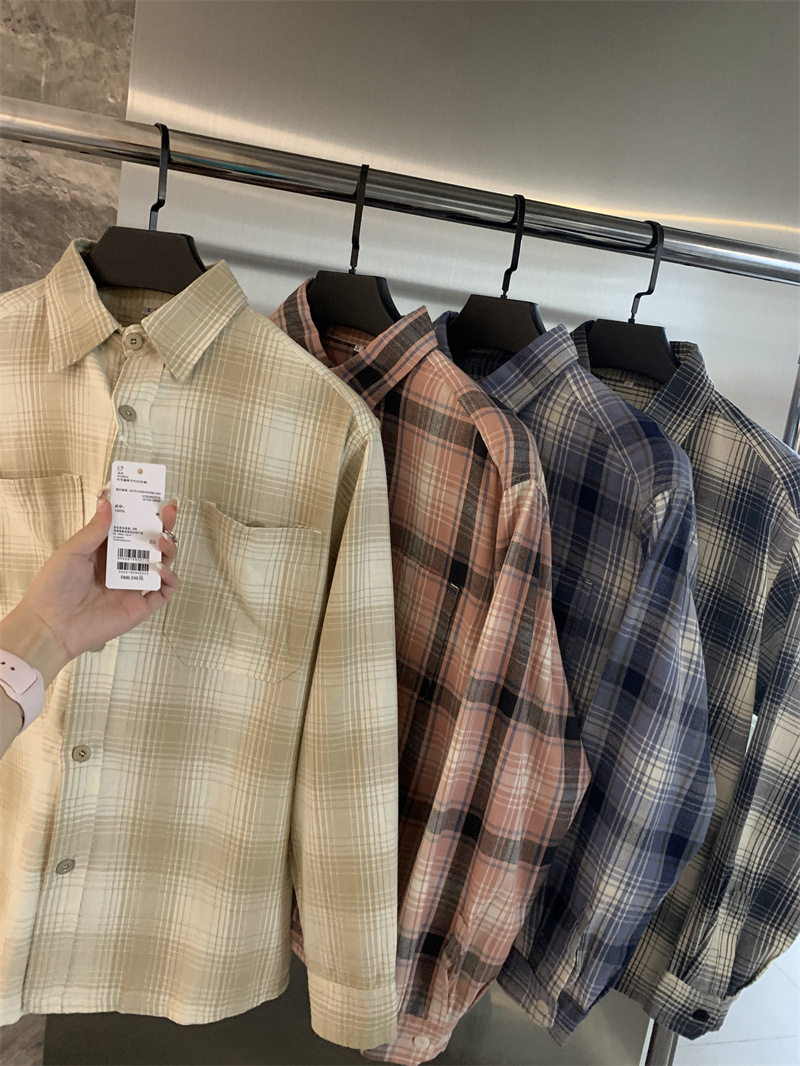 피팅 룸 인기! 씻은 면 부드러운 더블 포켓! 남성 옷깃 체크 무늬 긴 소매 셔츠 패션스토어 가기