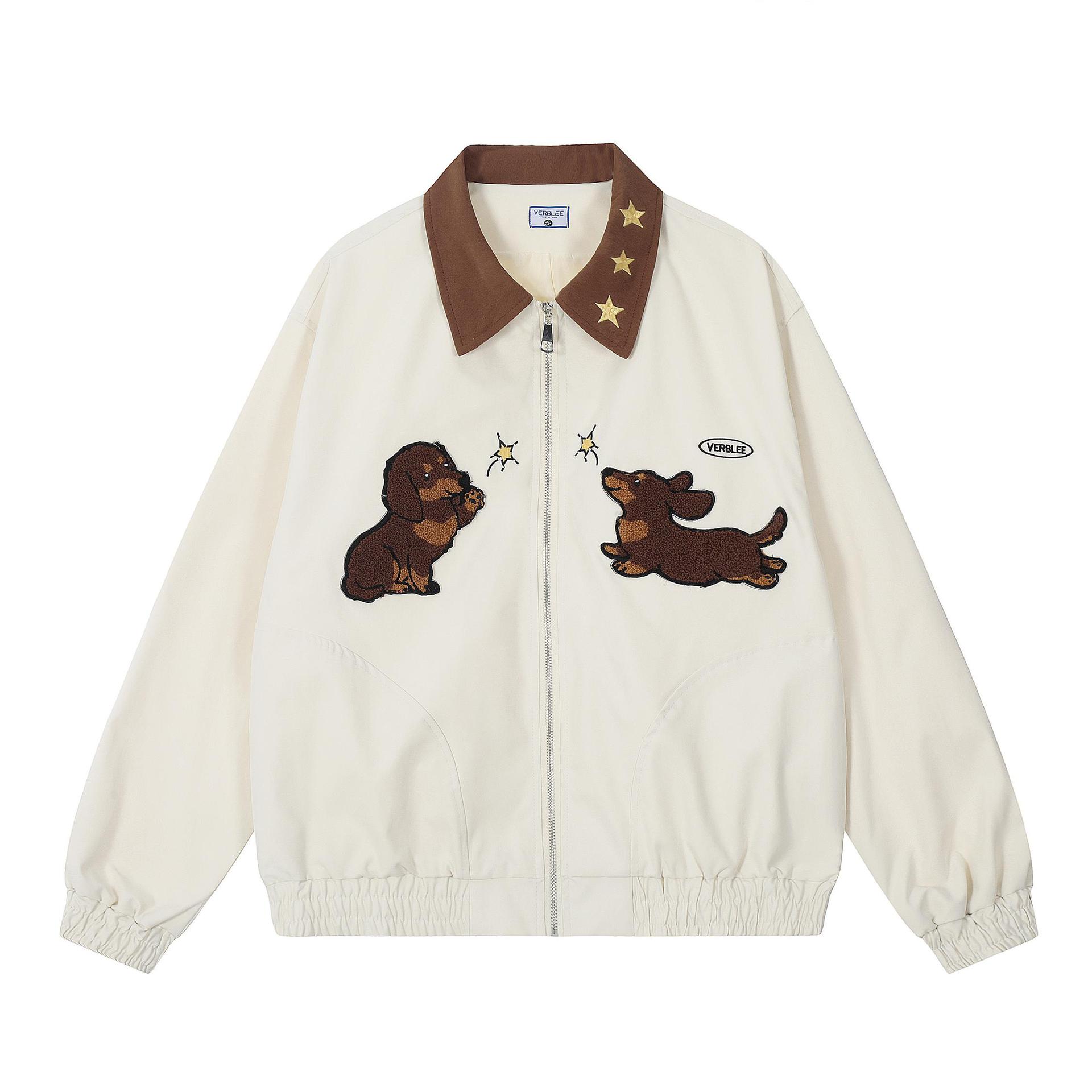유럽과 미국의 레트로 Wachshund Puppy Towel 자수 랩 재킷 남성 및 여성 Ins 루즈 트렌디 브랜드 디자인 센스 커플 재킷