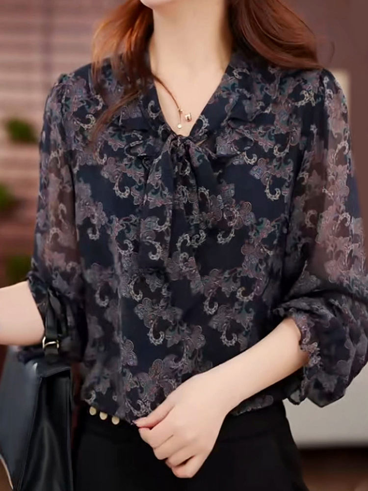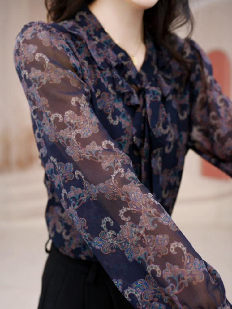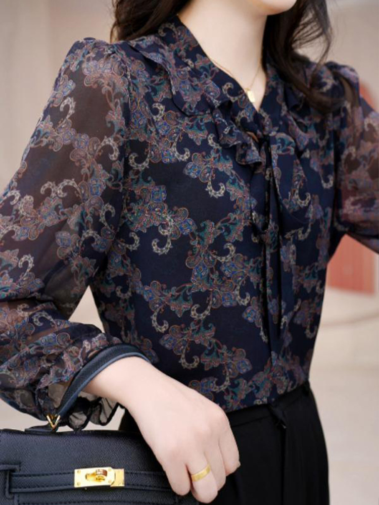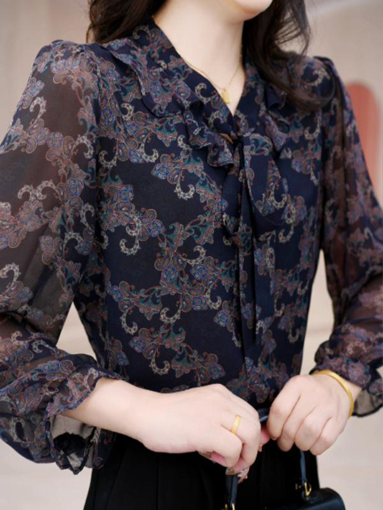 2025 봄 새로운 도착 타이 업 풀오버 시폰 셔츠 얇은 우아한 캐주얼 달콤한 인쇄 긴 소매 최고 여성용 작은 셔츠