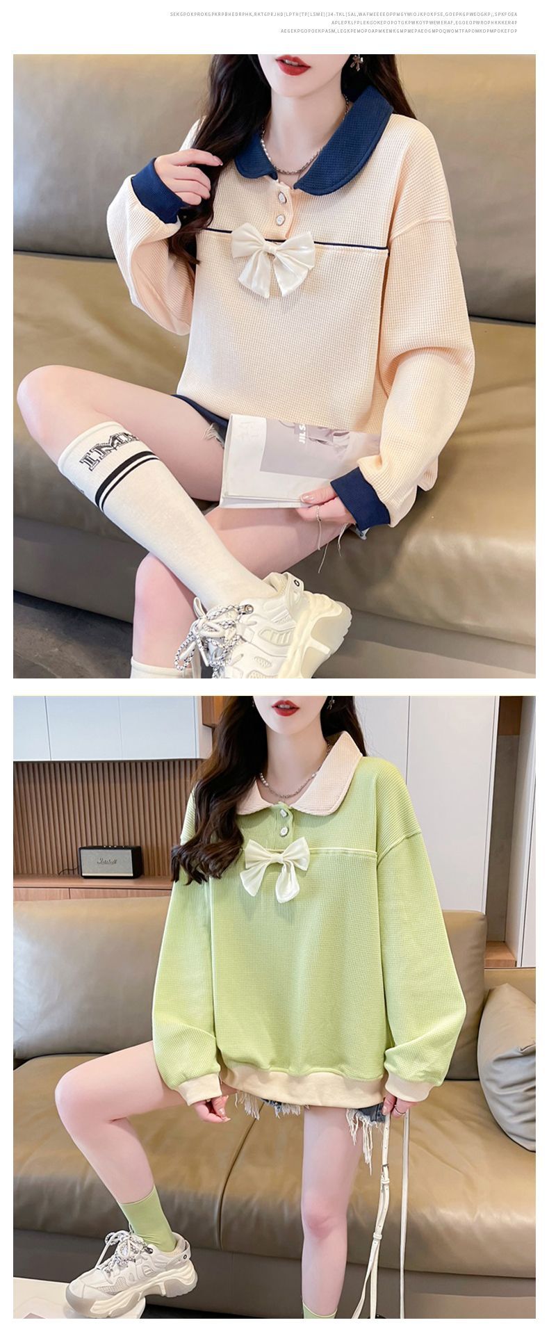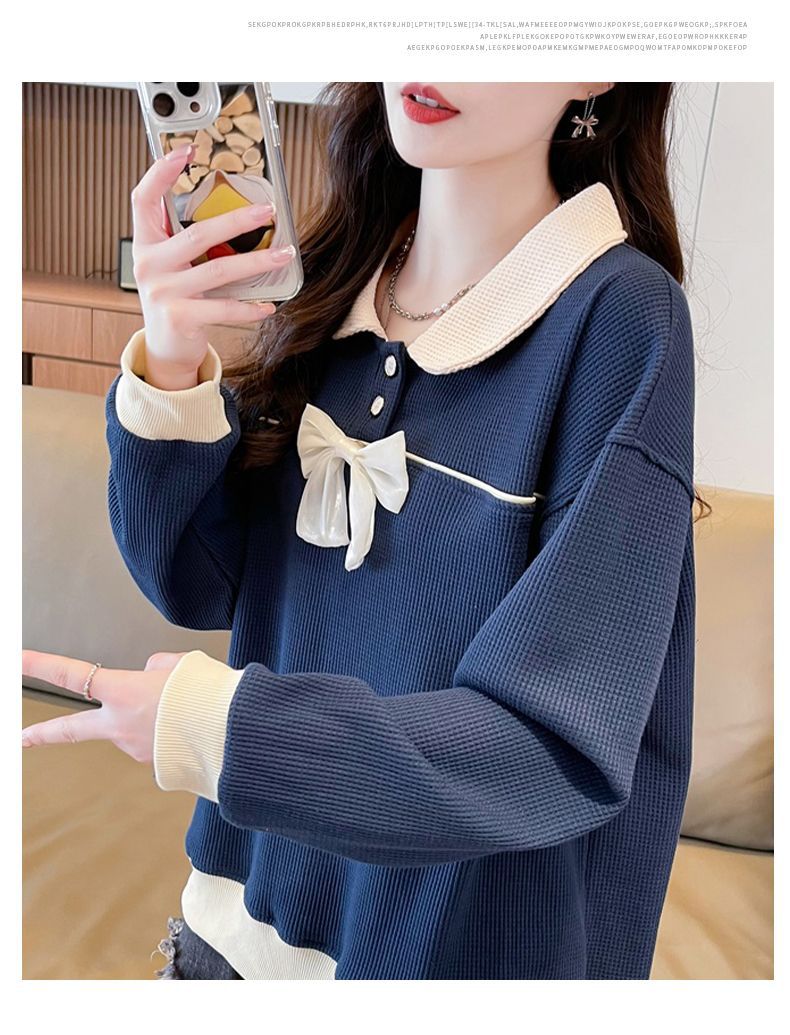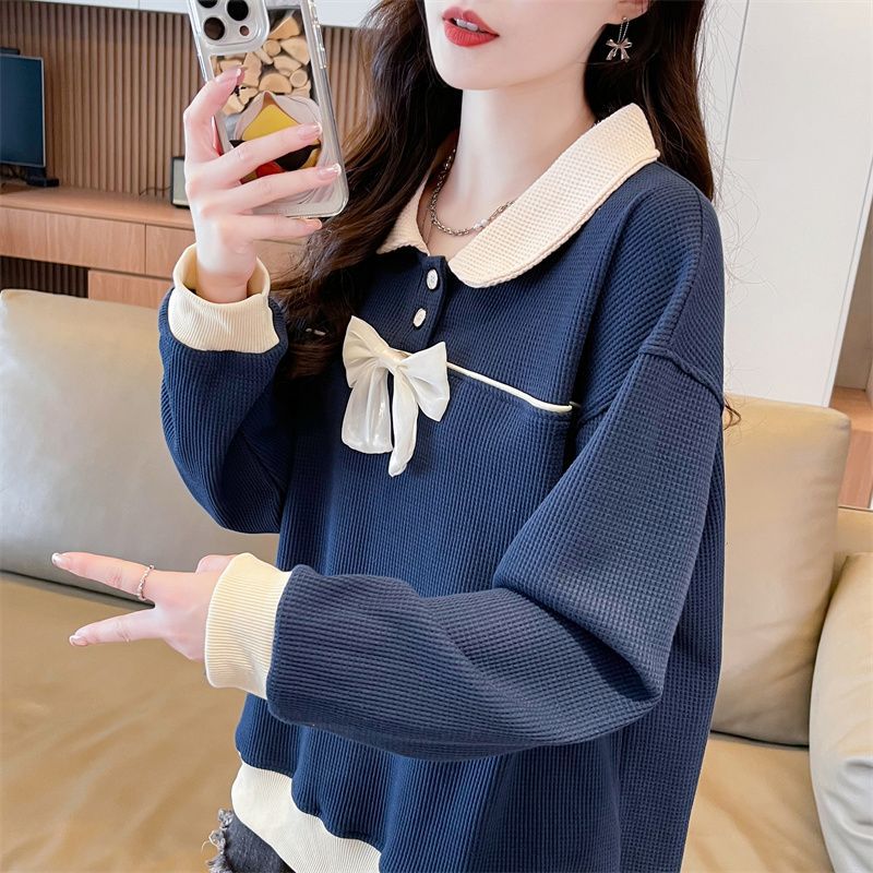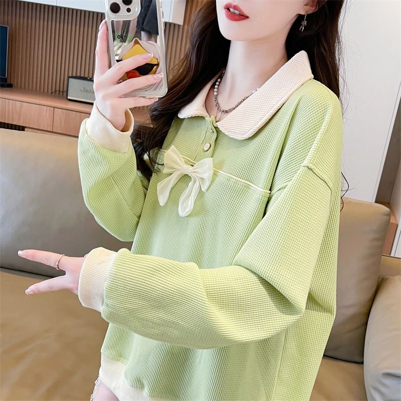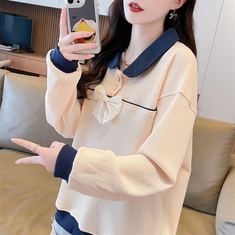 와플 땀 여성의 새로운 2025 폭발적인 패션 세련된 폴로 칼라 3 차원 활 장식 색상 매칭 탑스토어 가기