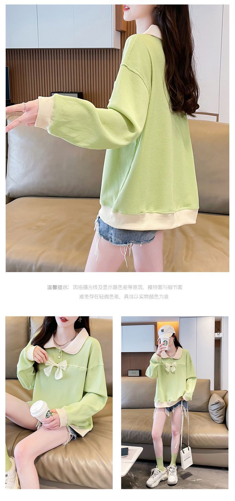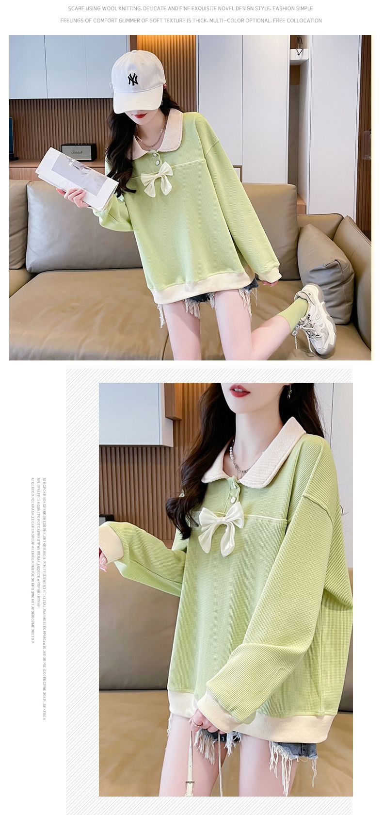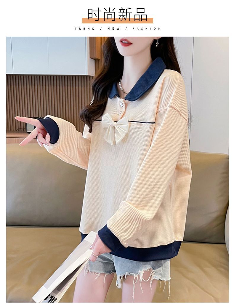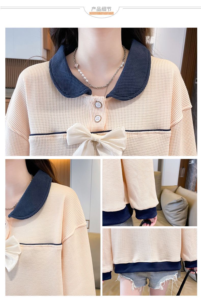 와플 땀 여성의 새로운 2025 폭발적인 패션 세련된 폴로 칼라 3 차원 활 장식 색상 매칭 탑스토어 가기