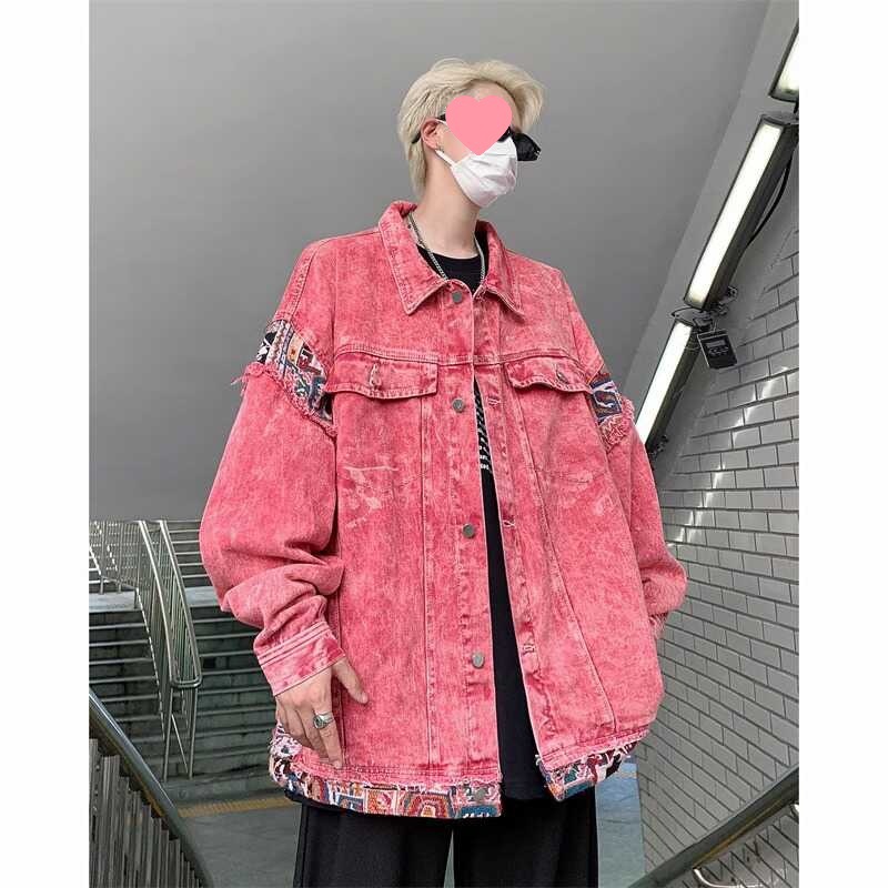 2025 미국 패션 브랜드 세탁 핑크 데님 재킷 남자 봄과 가을 느슨한 올매치 오래 된 캐주얼 스티칭 재킷