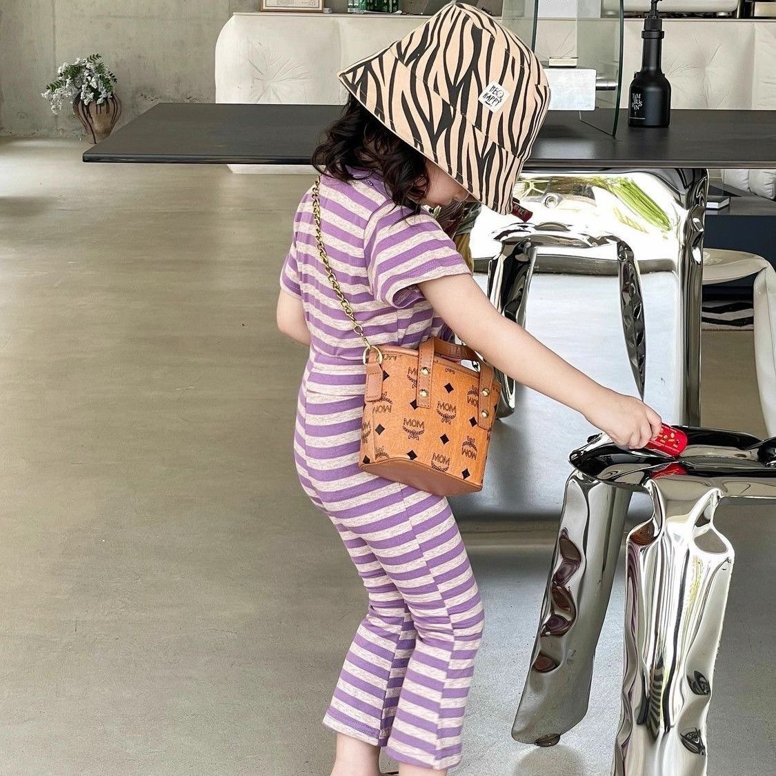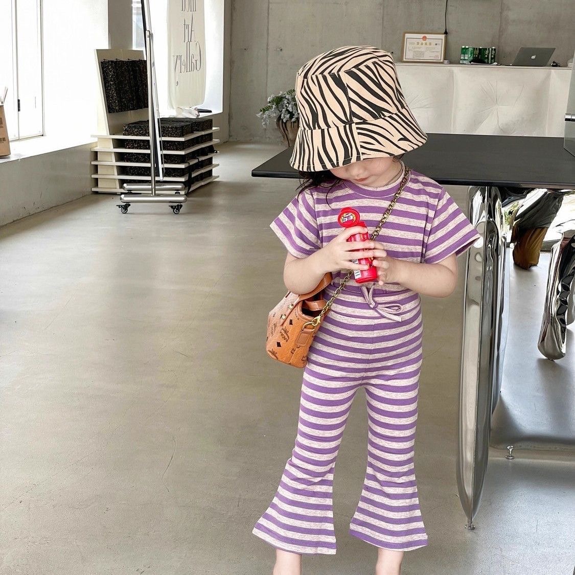 여자 반팔 세트 2025 년 여름 신형 한국식 어린이 스트라이프 탑 플레어 바지 투피스 세트