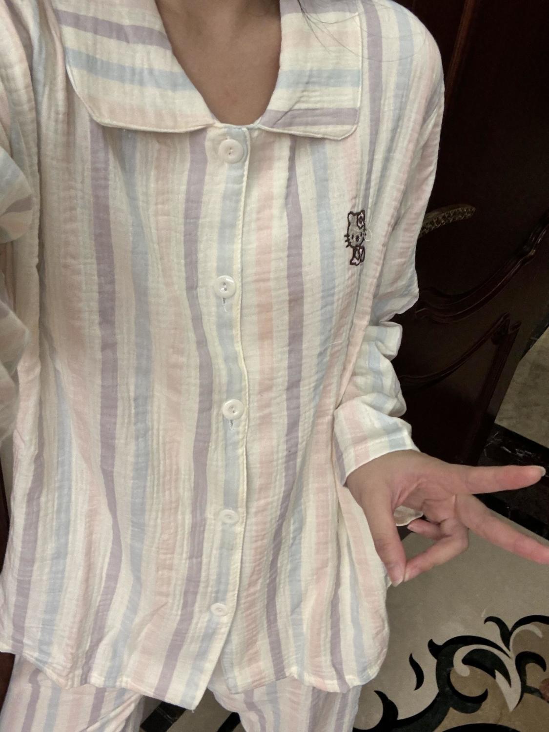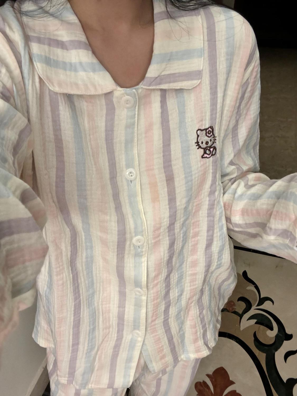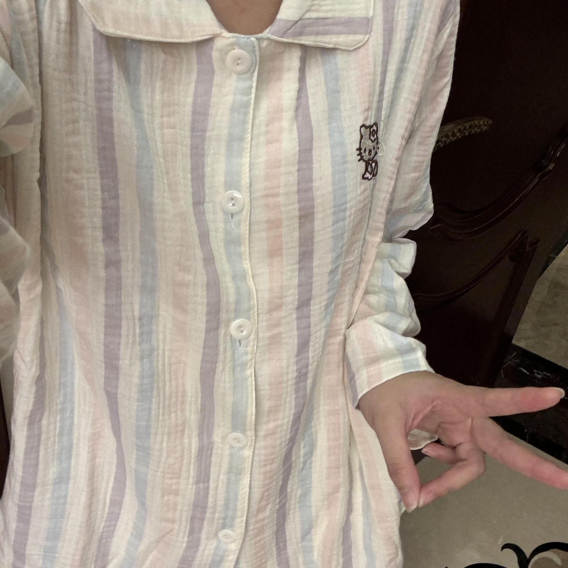 화려한 줄무늬 헬로 키티 고양이 잠옷 여성의 봄과 가을 새로운 긴 소매 일본 스타일 귀여운 학생 홈 옷스토어 가기