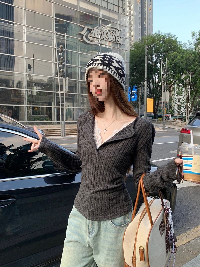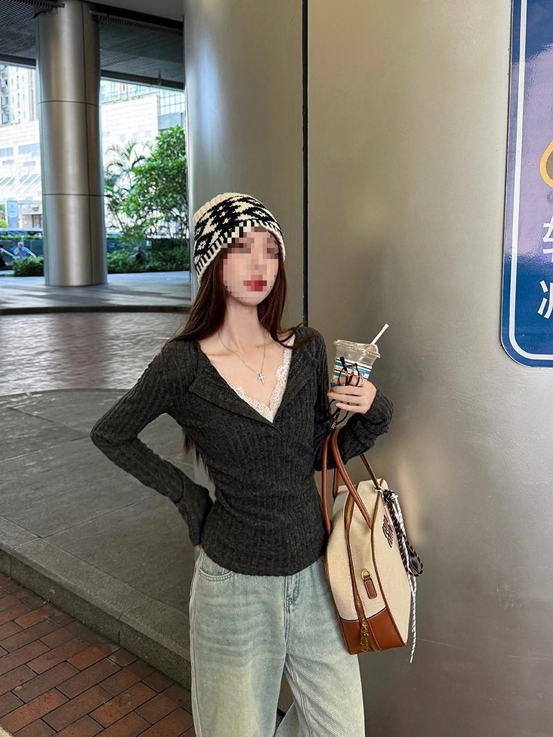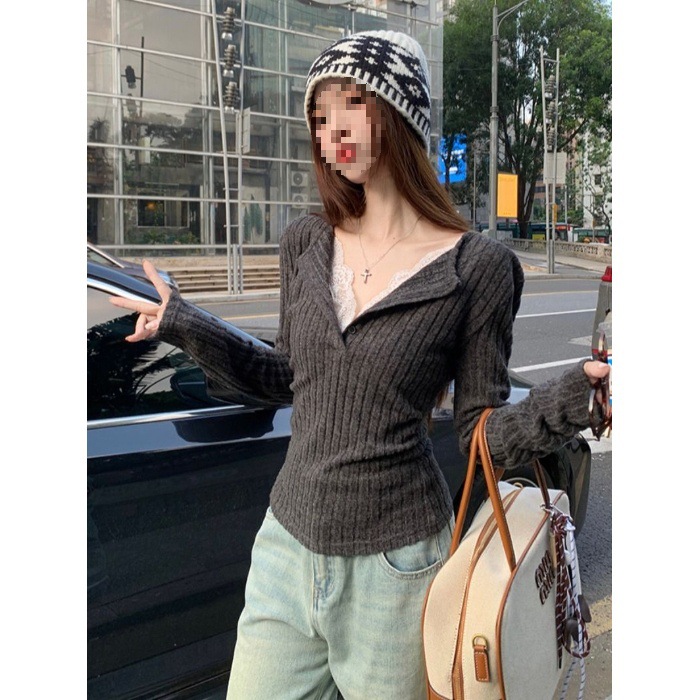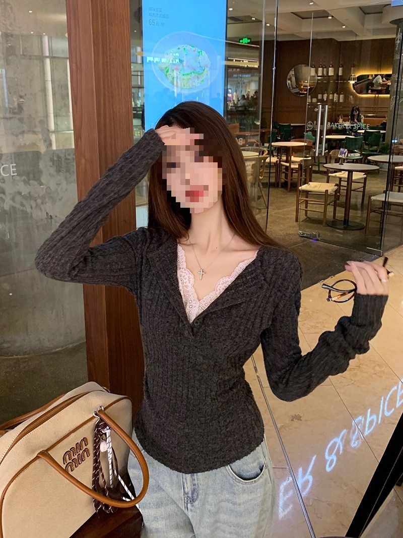 헤어 봄과 가을 샌딩 레이스 스티칭 옷깃 기질 긴 소매 티셔츠 여성의 슬림 슬림베이스 셔츠스토어 가기
