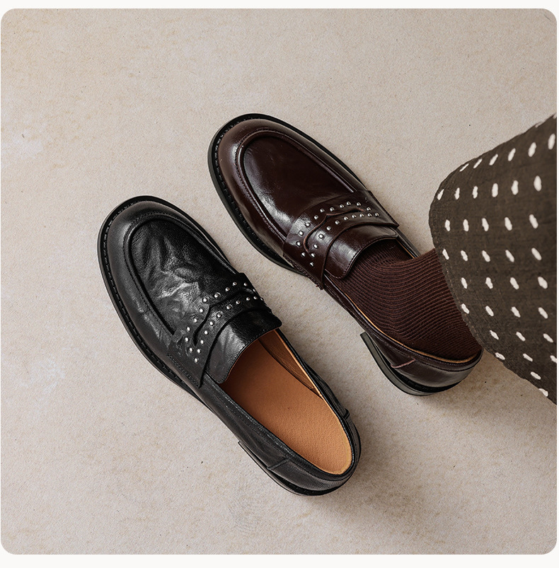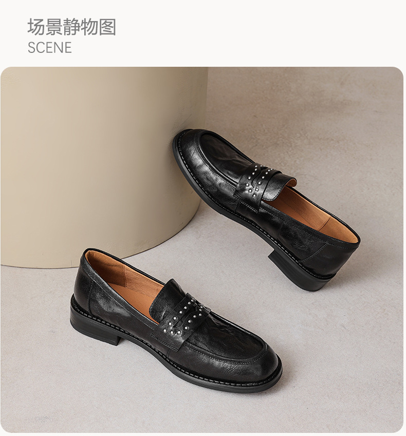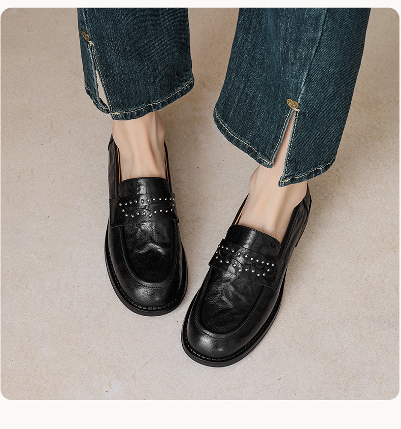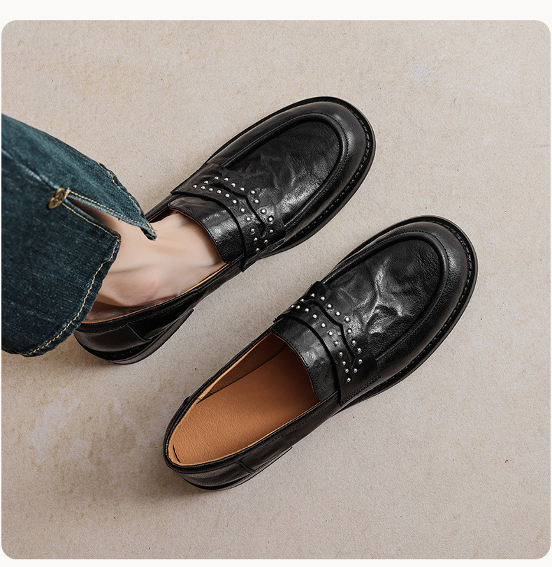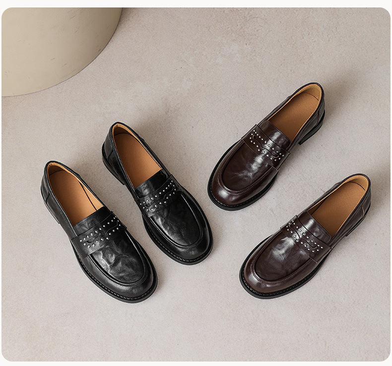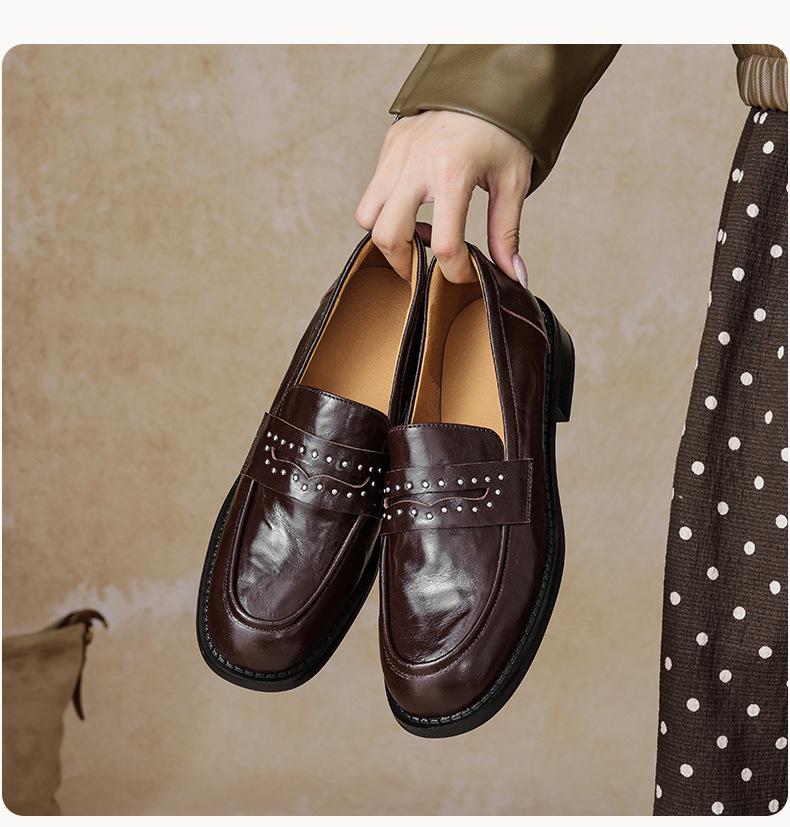 봄과 가을 Cowhide Rivet Round Head Loafers 여성용 영국 스타일 미드 힐 두꺼운 힐 딥 입 싱글 레이어 신발 여성용 소프트 솔 편안한 올 매치