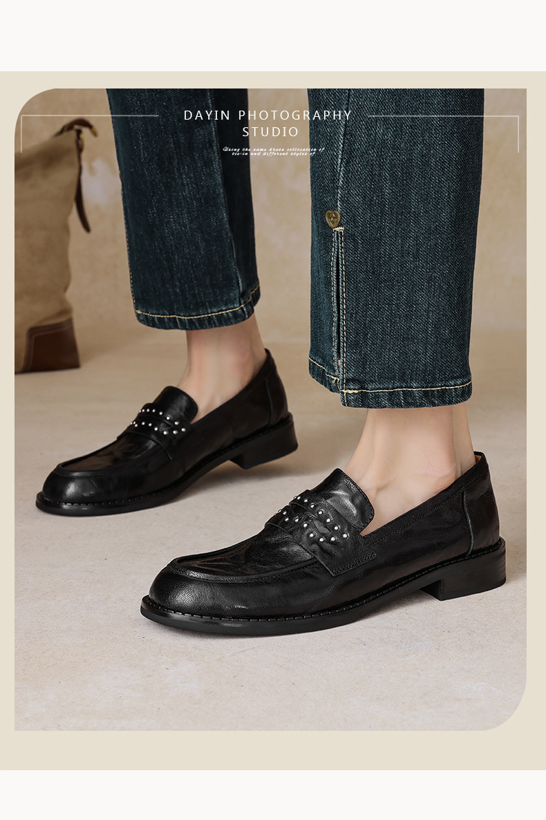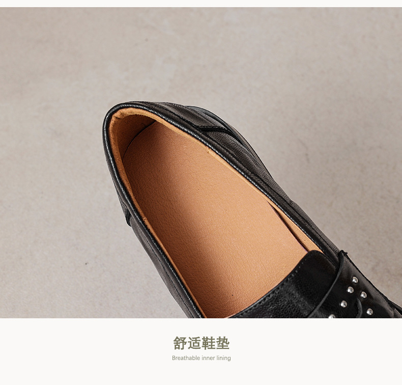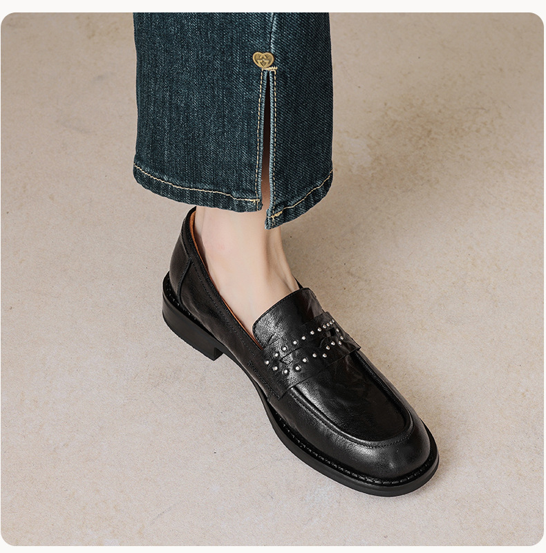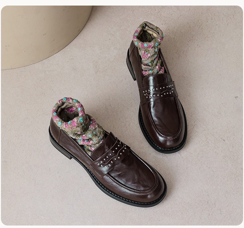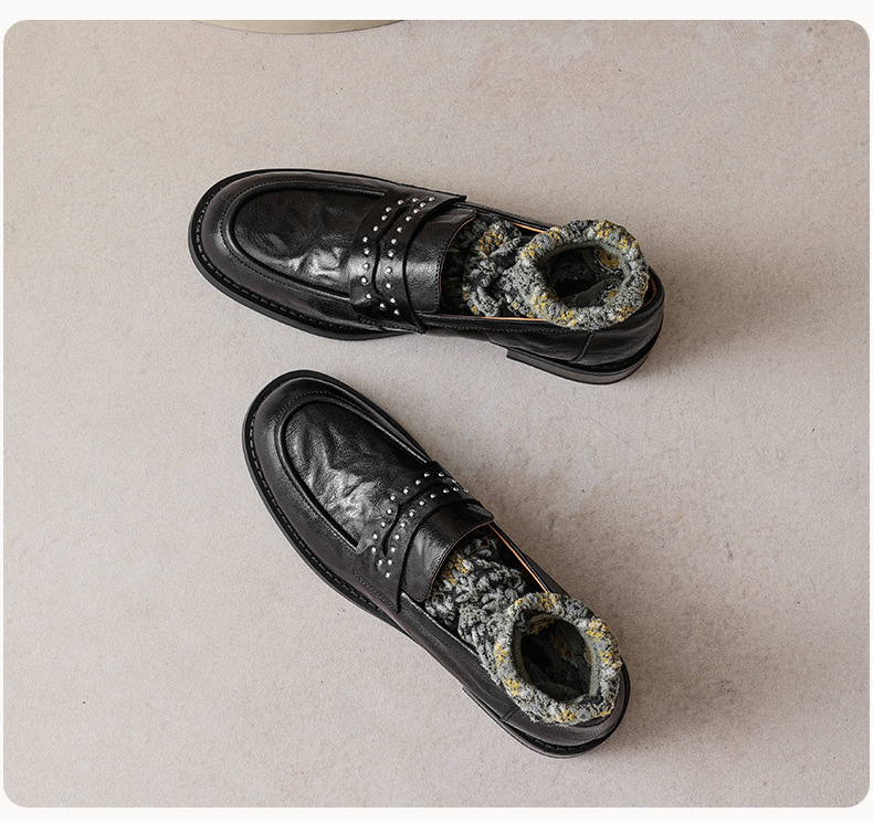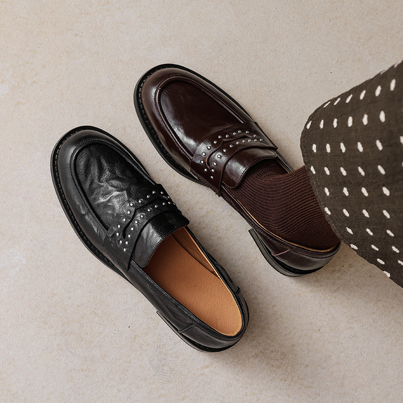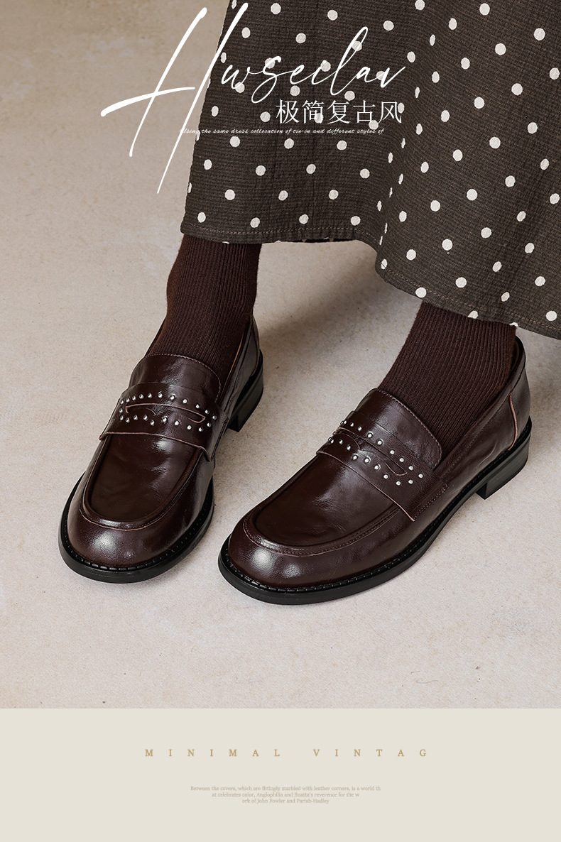 봄과 가을 Cowhide Rivet Round Head Loafers 여성용 영국 스타일 미드 힐 두꺼운 힐 딥 입 싱글 레이어 신발 여성용 소프트 솔 편안한 올 매치