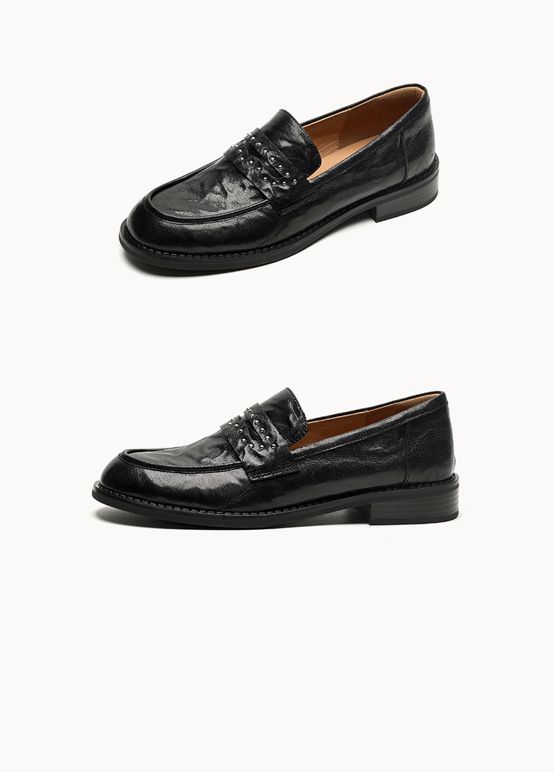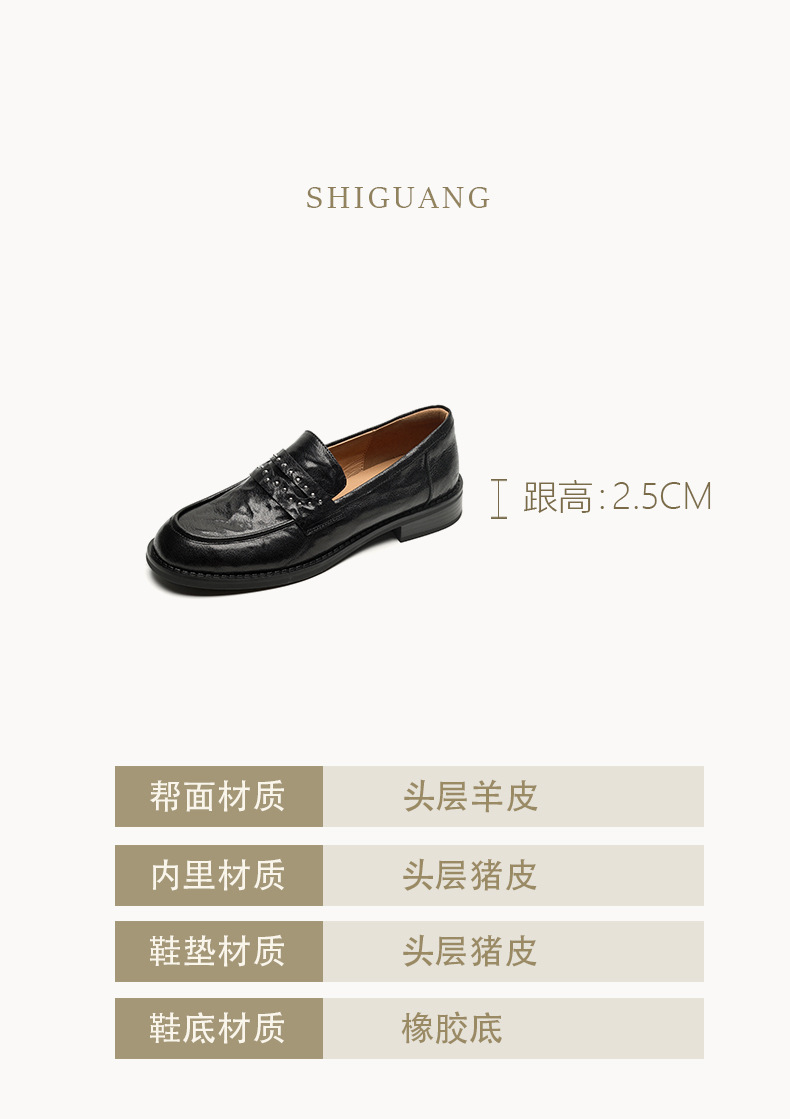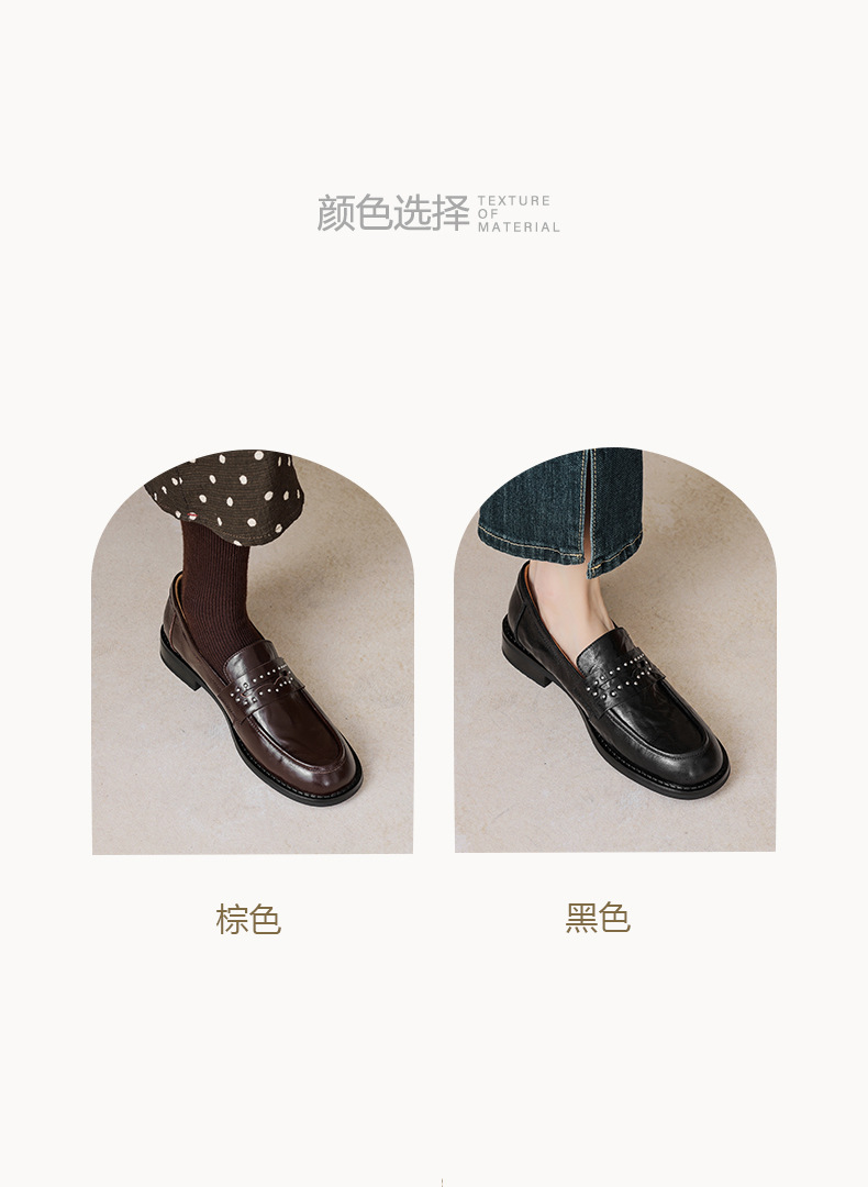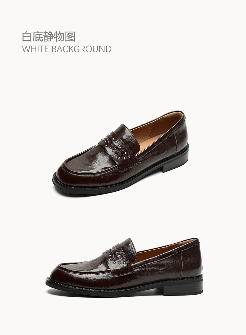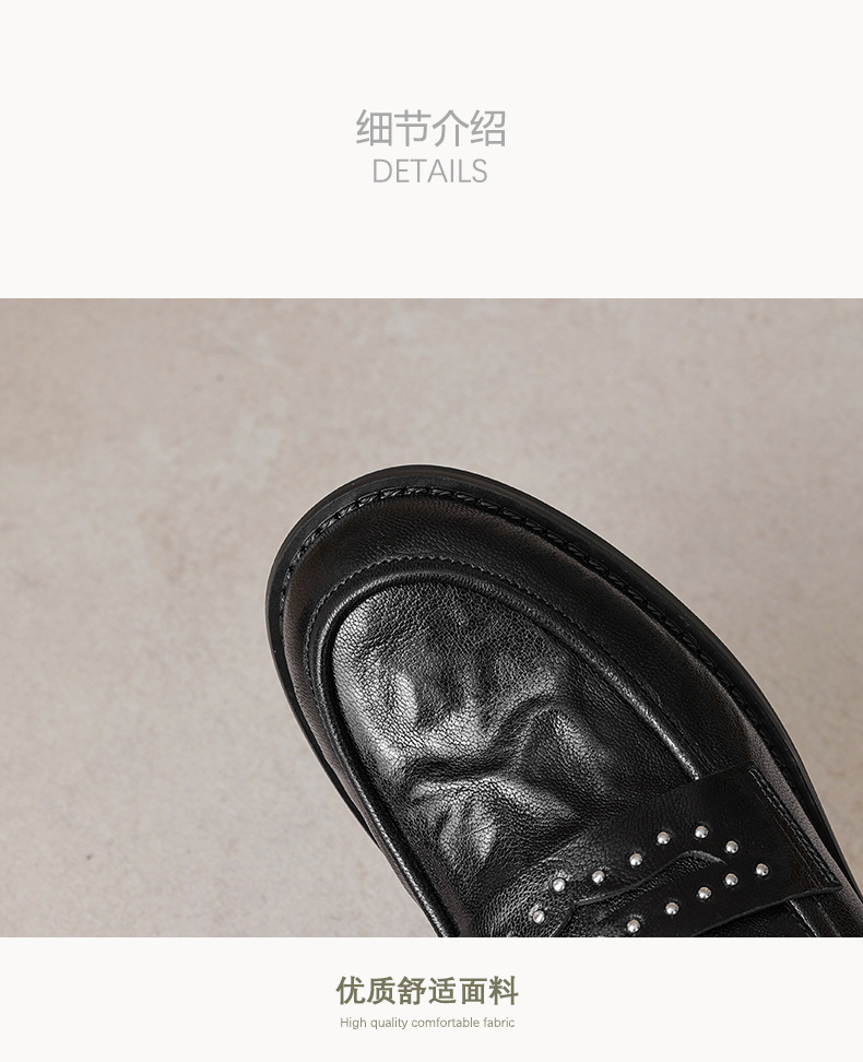 봄과 가을 Cowhide Rivet Round Head Loafers 여성용 영국 스타일 미드 힐 두꺼운 힐 딥 입 싱글 레이어 신발 여성용 소프트 솔 편안한 올 매치