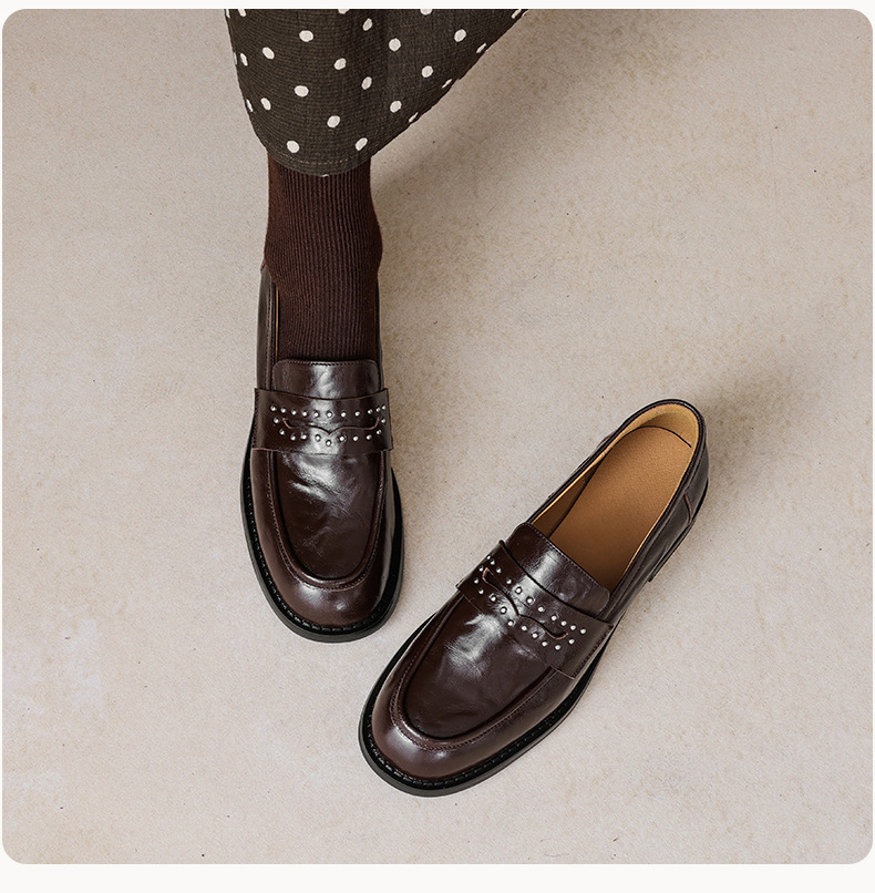 봄과 가을 Cowhide Rivet Round Head Loafers 여성용 영국 스타일 미드 힐 두꺼운 힐 딥 입 싱글 레이어 신발 여성용 소프트 솔 편안한 올 매치스토어 가기