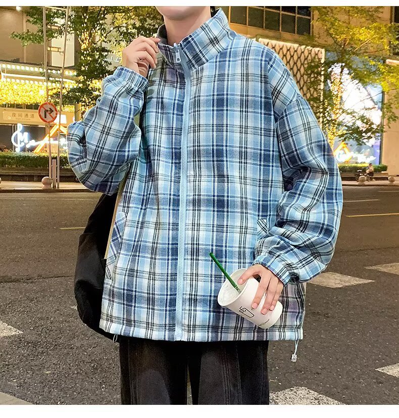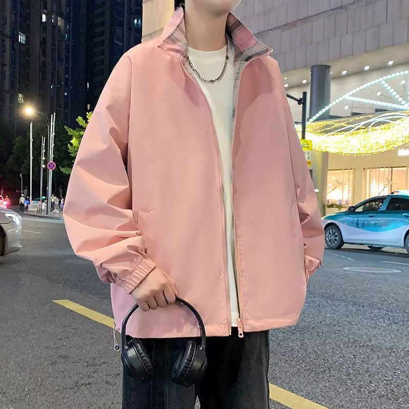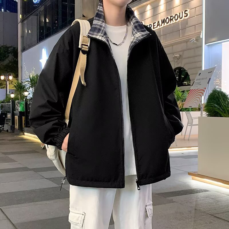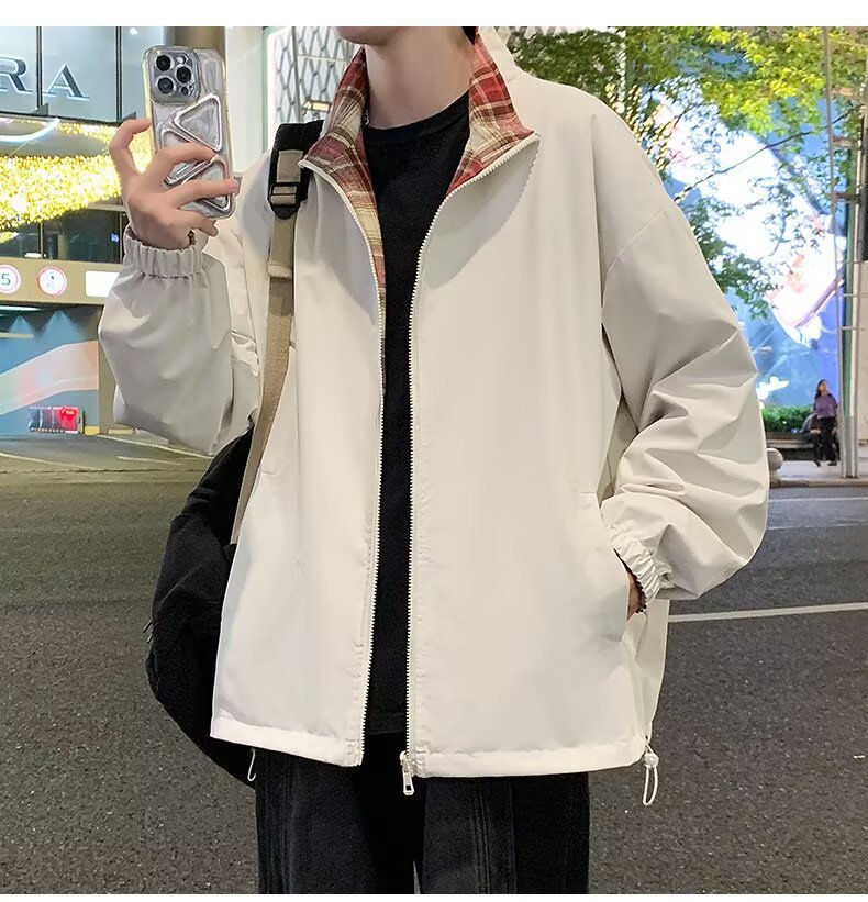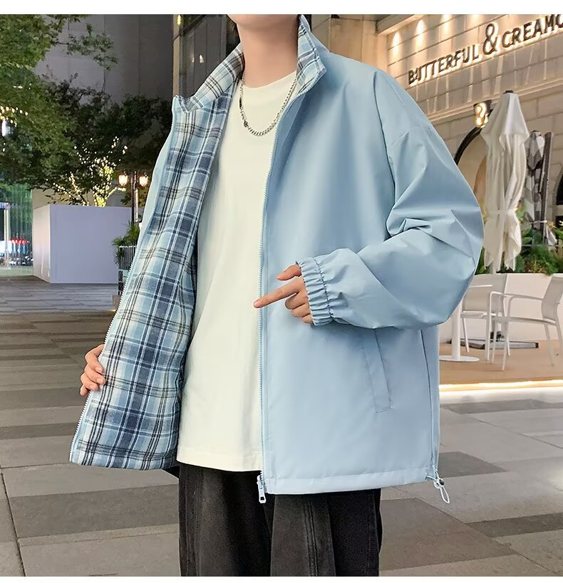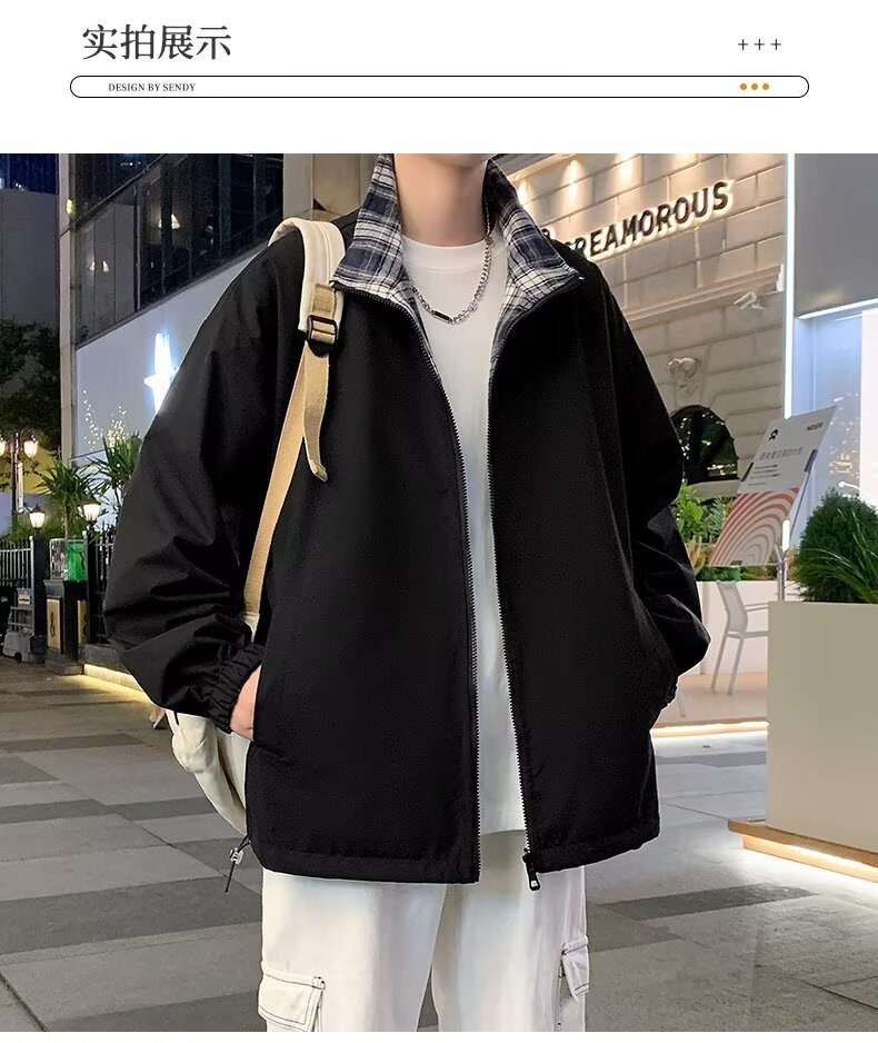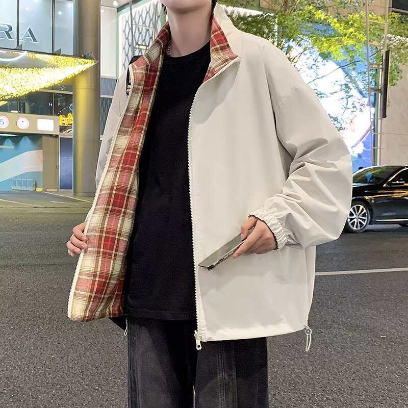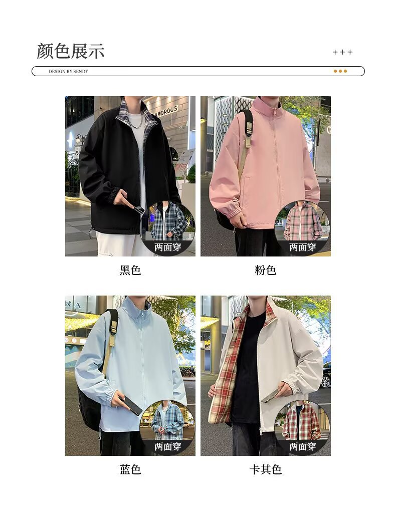 플레이드 양면 착용 봄과 가을 더피 잘생긴 재킷 남자 수직 칼라 라이트 플레이트 양면 재킷 캐주얼 트렌디 커플 재킷