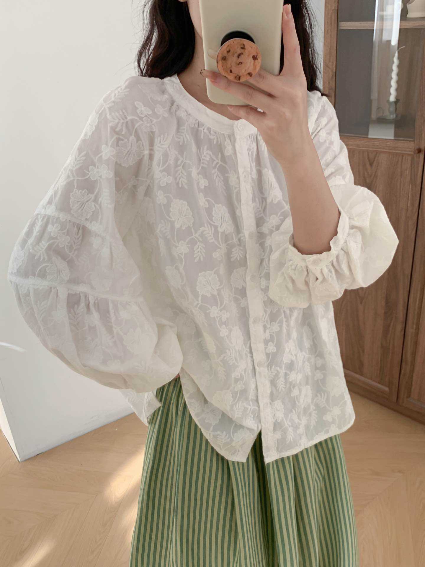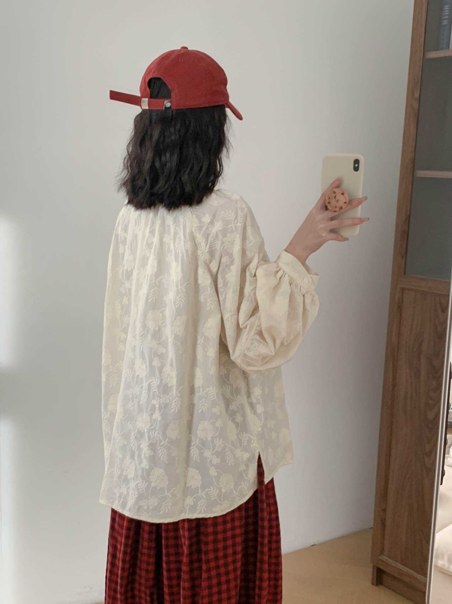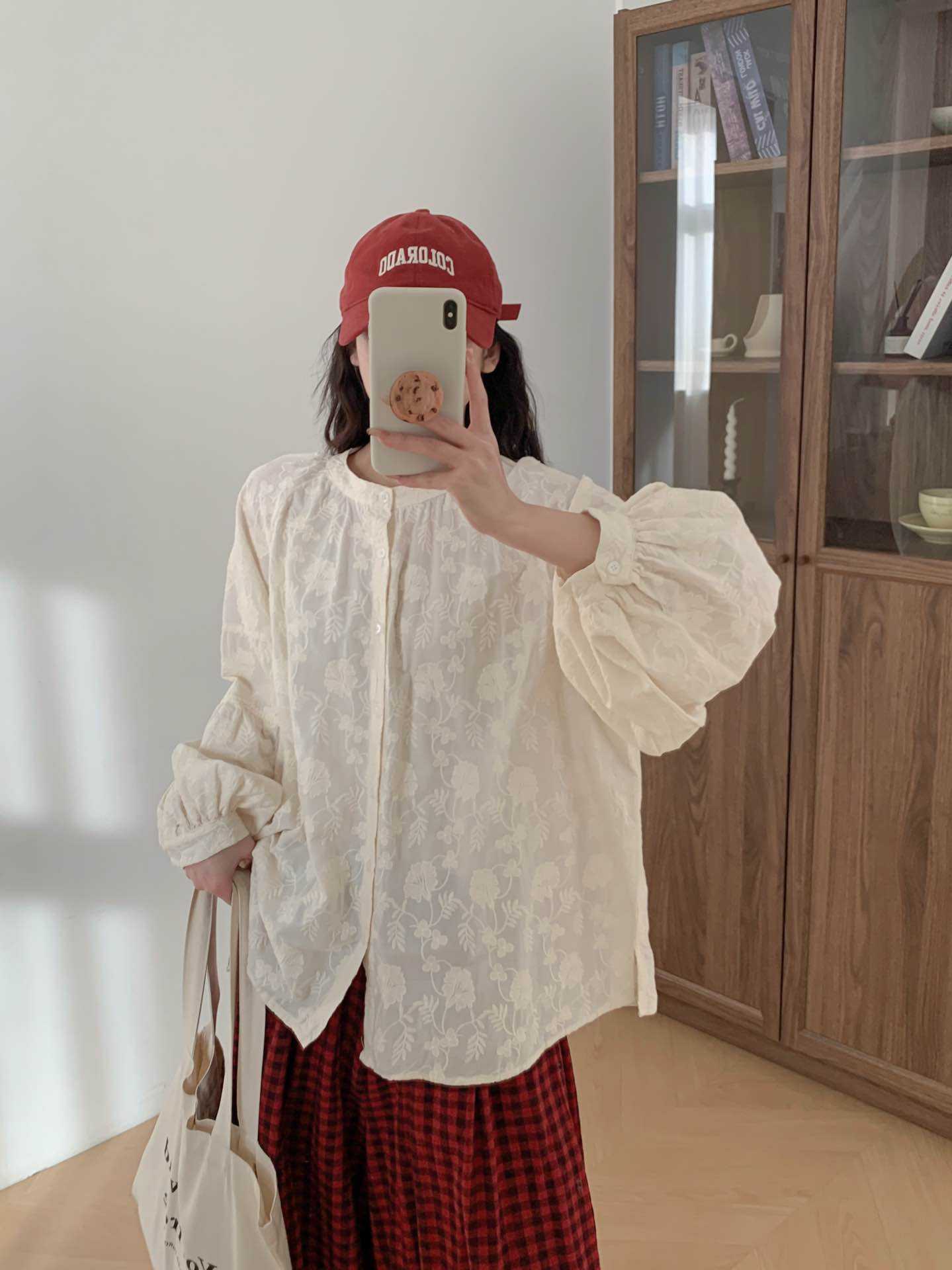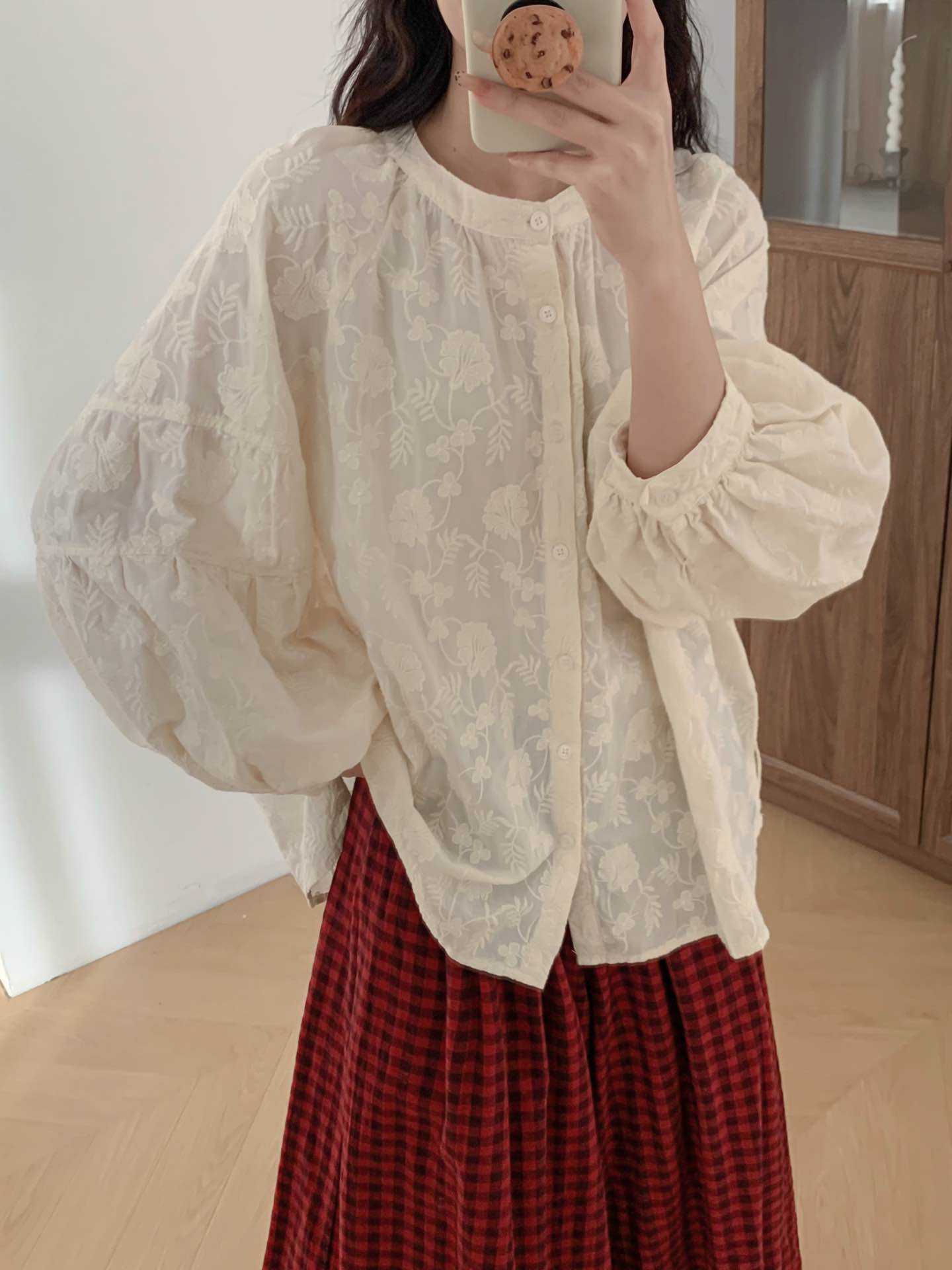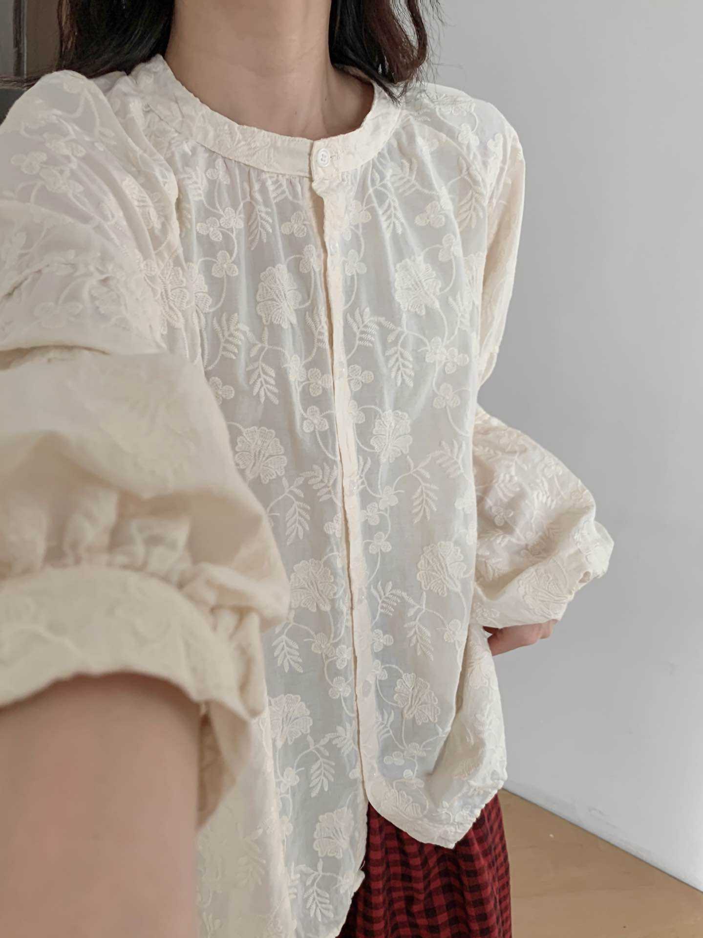 2025 년 봄 새로운 도착 자수 셔츠 예술적 레트로 느슨한 슬리밍 라운드 넥 싱글 브레스트 탑스토어 가기