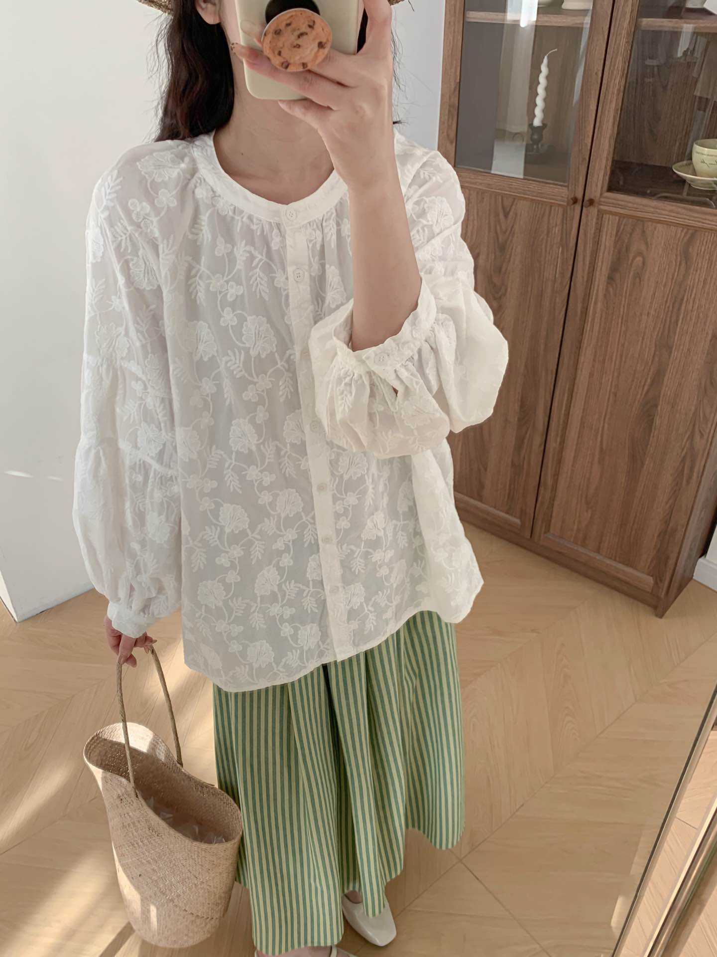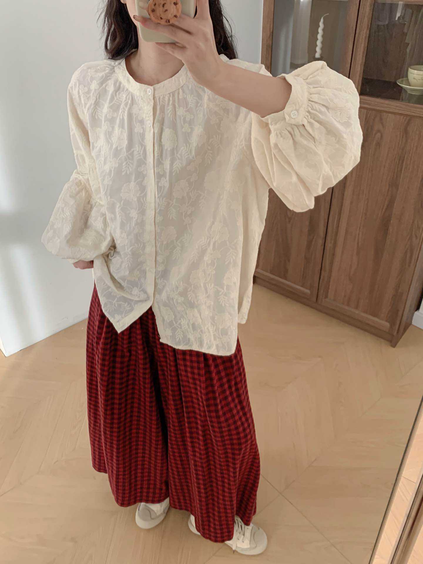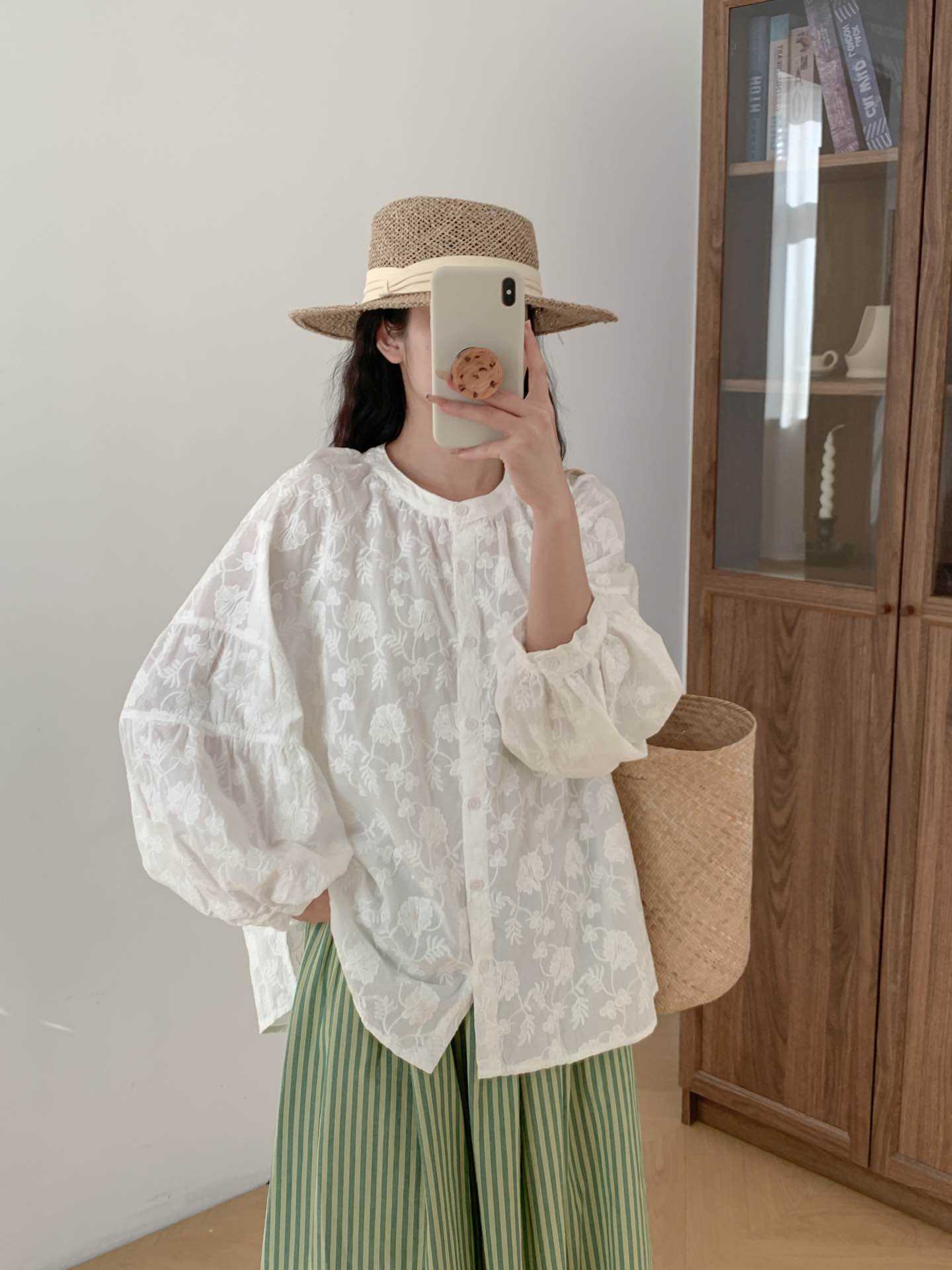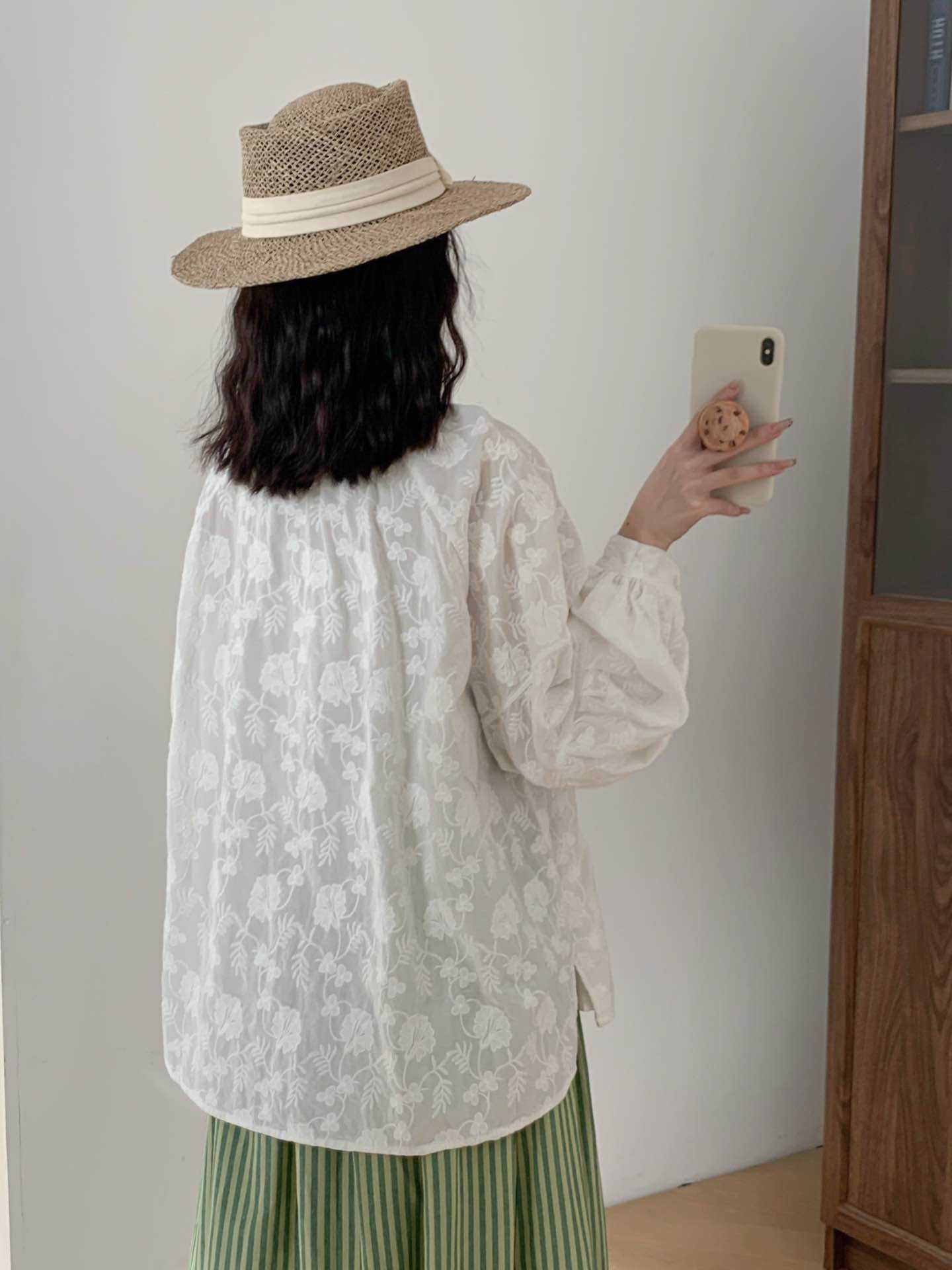 2025 년 봄 새로운 도착 자수 셔츠 예술적 레트로 느슨한 슬리밍 라운드 넥 싱글 브레스트 탑스토어 가기