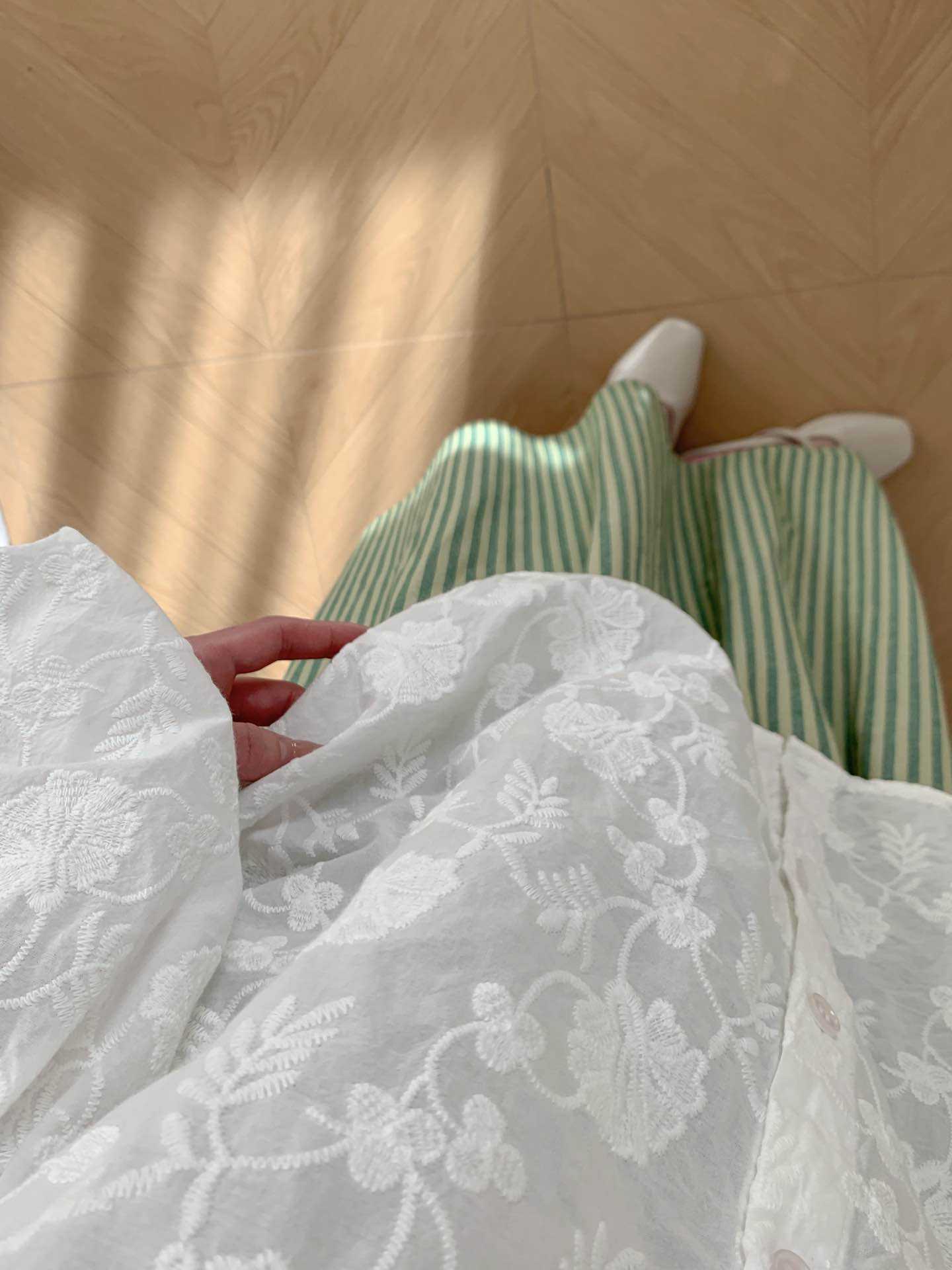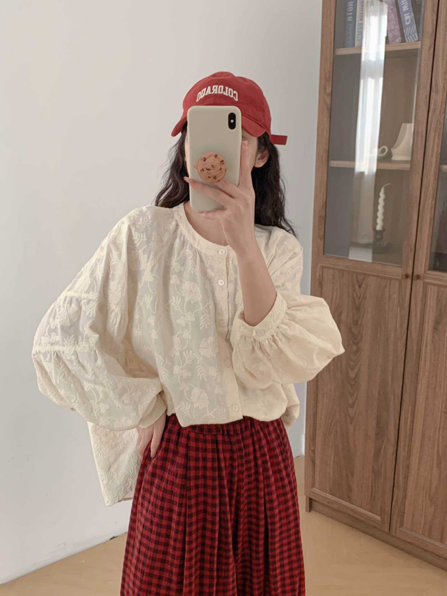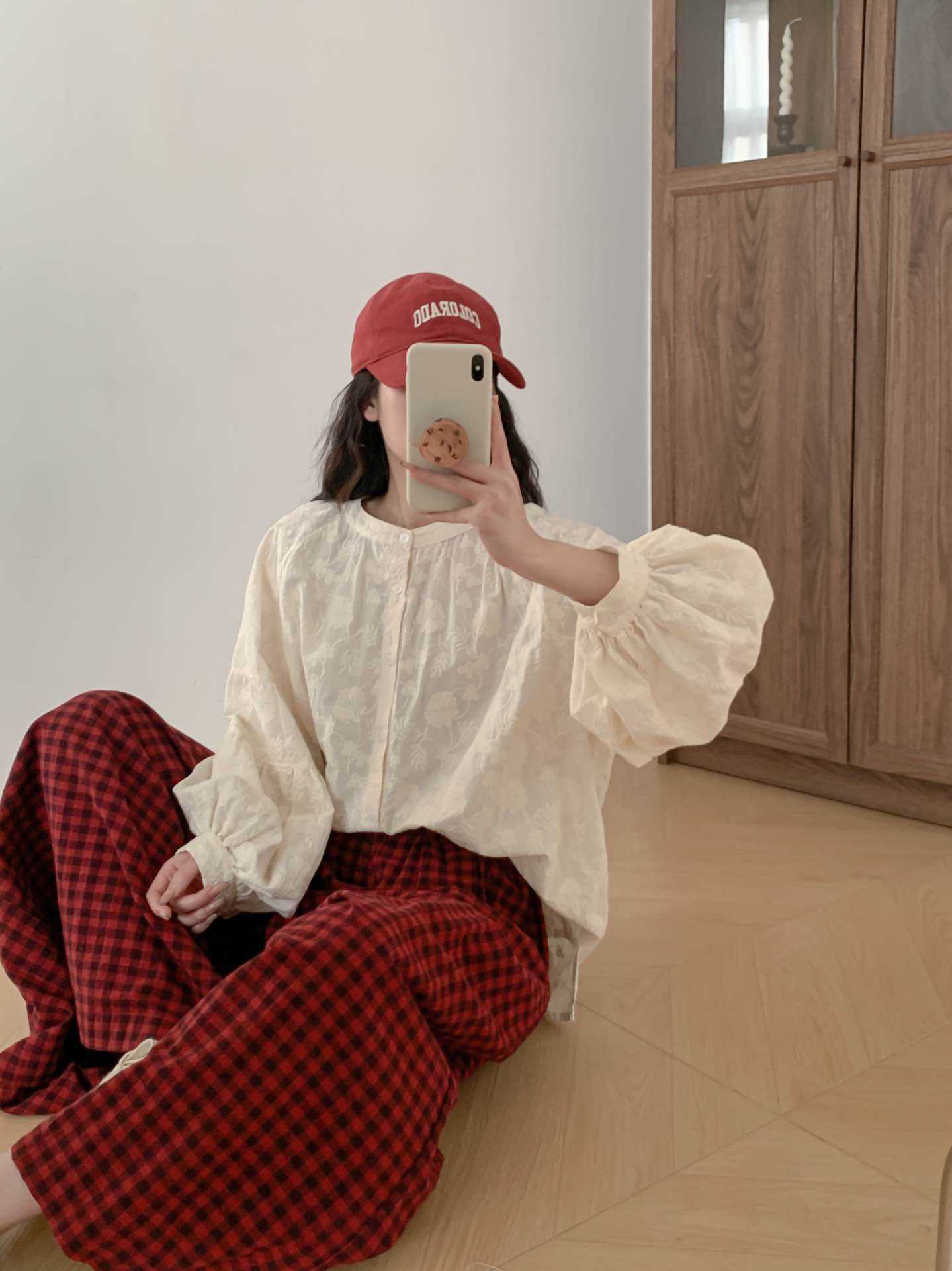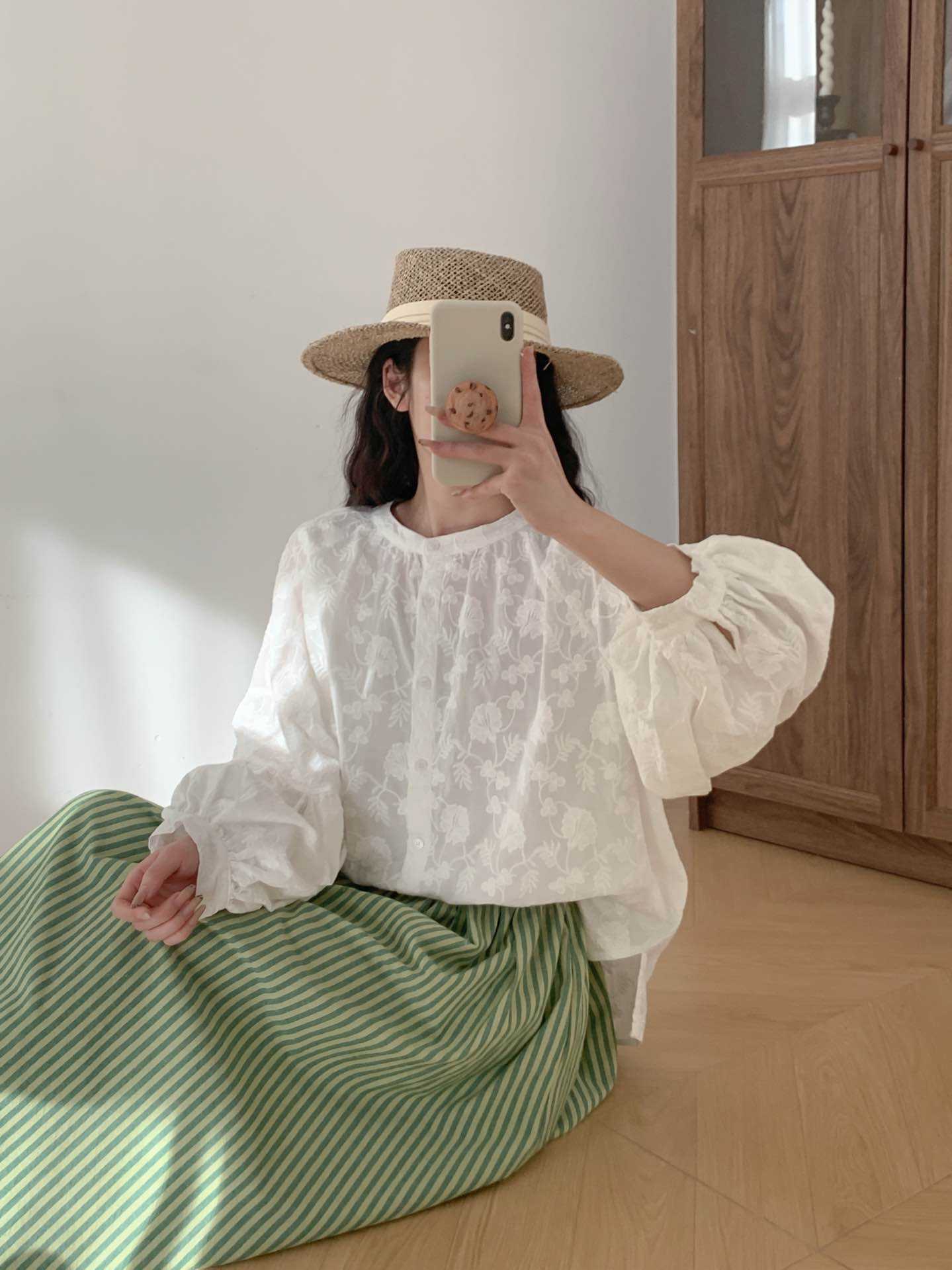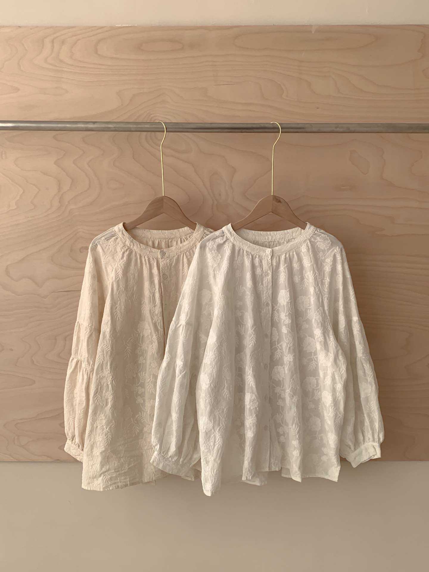 2025 년 봄 새로운 도착 자수 셔츠 예술적 레트로 느슨한 슬리밍 라운드 넥 싱글 브레스트 탑스토어 가기