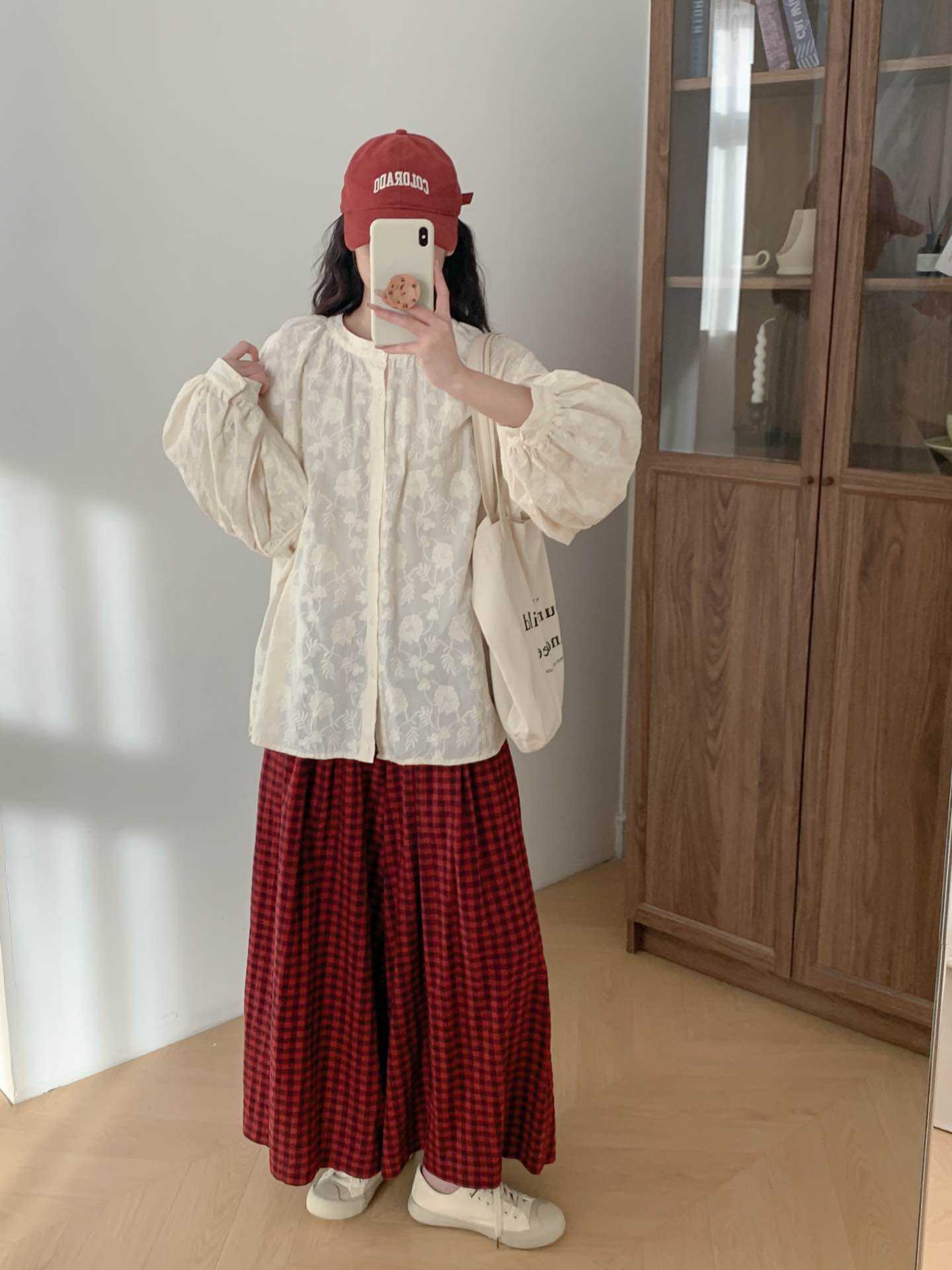 2025 년 봄 새로운 도착 자수 셔츠 예술적 레트로 느슨한 슬리밍 라운드 넥 싱글 브레스트 탑