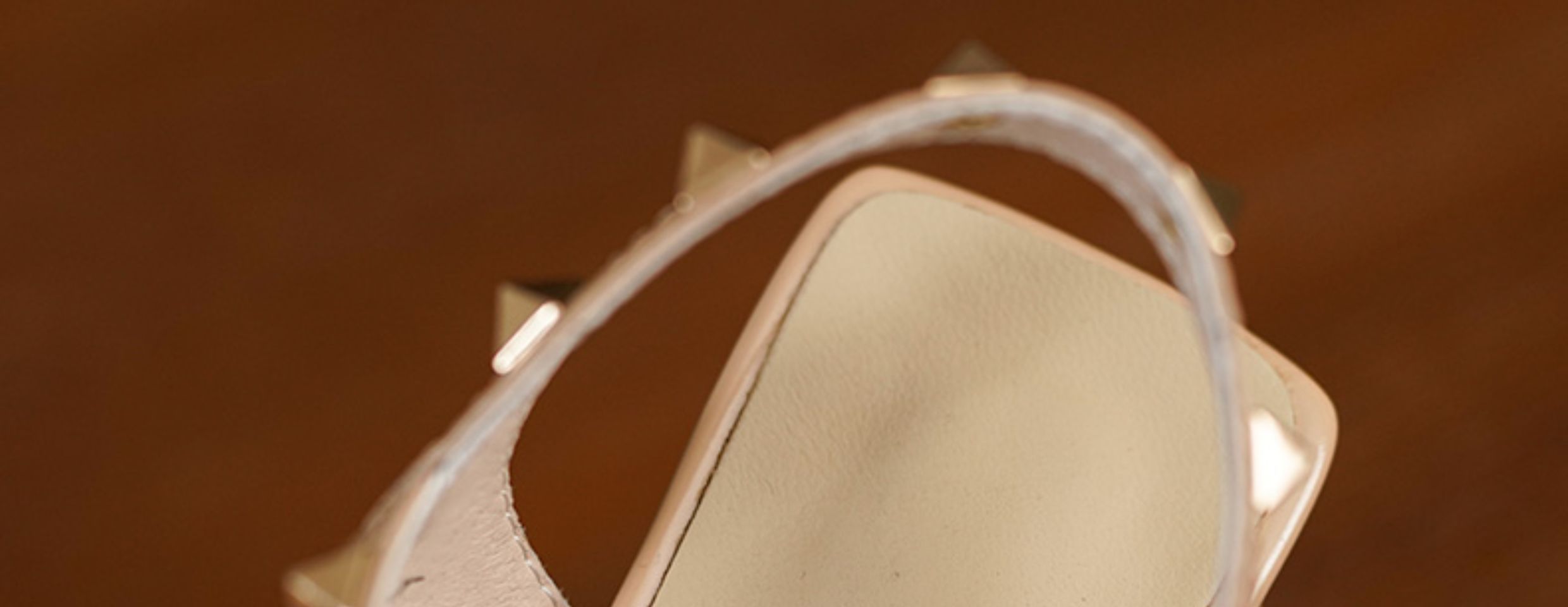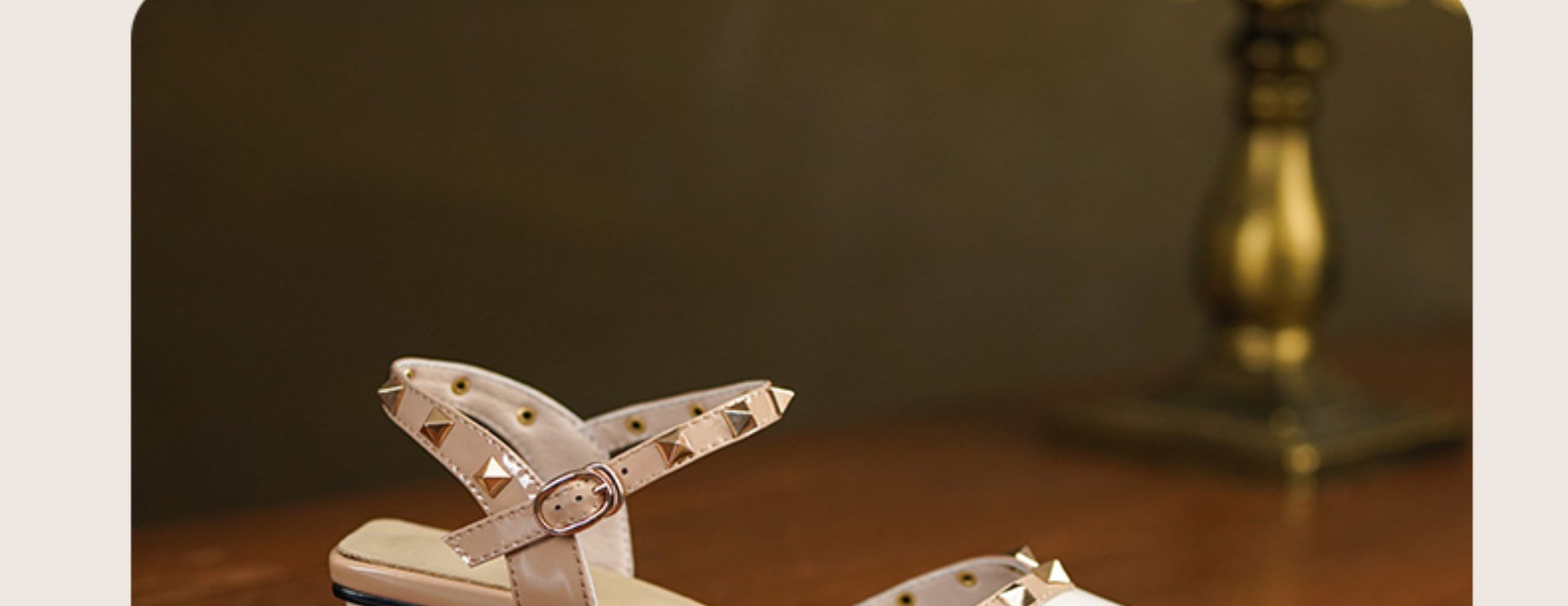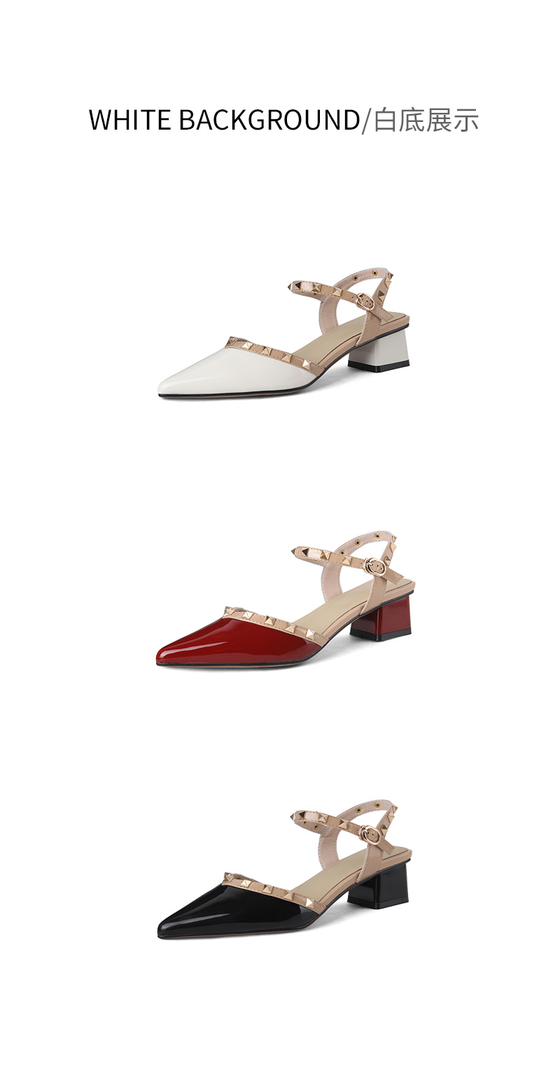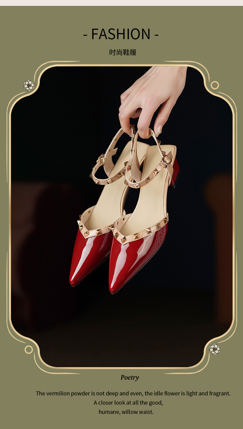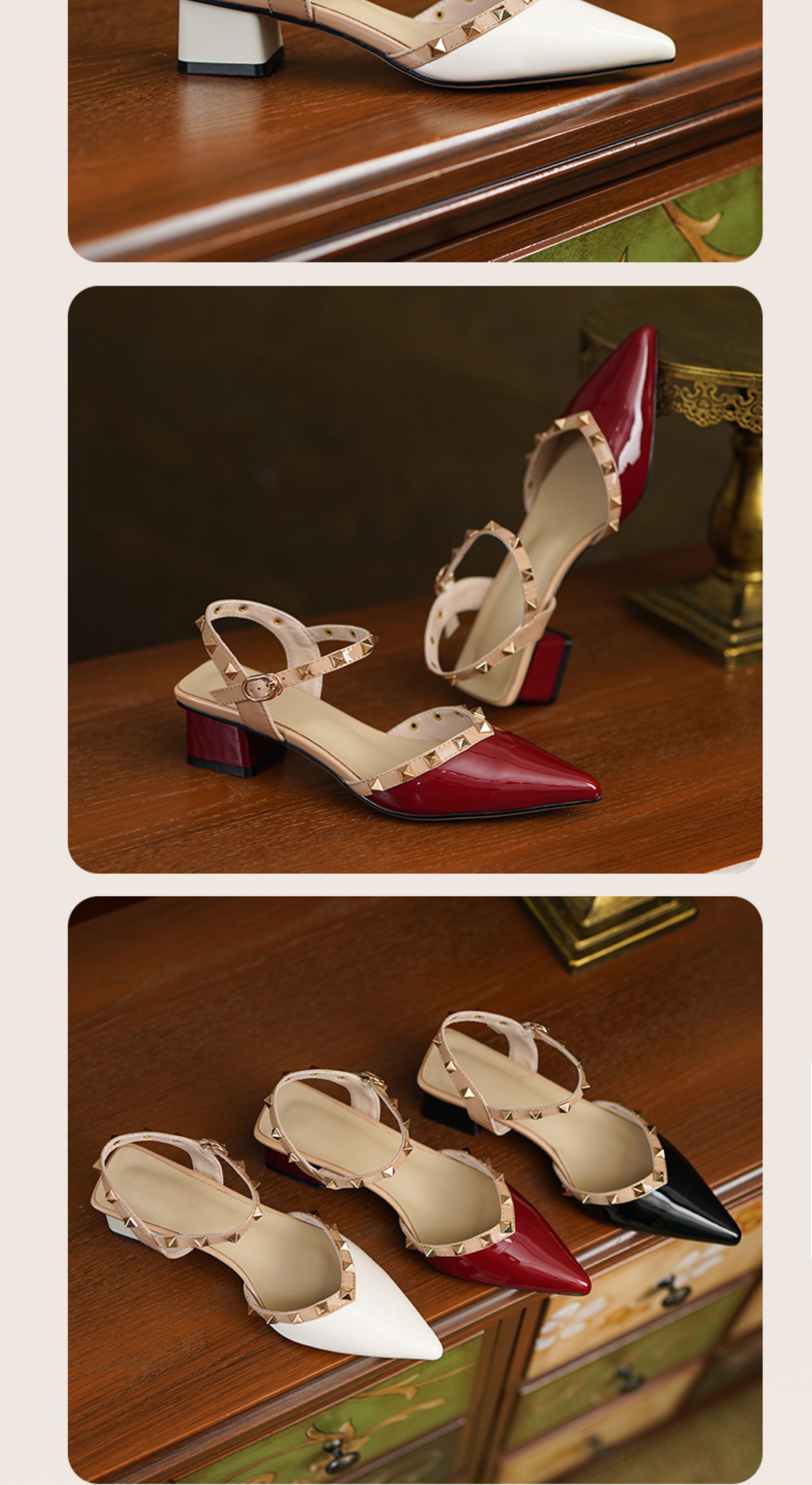 유럽 역 2025 봄과 여름 새로운 프랑스 Chunky Heel Baotou 샌들 여성용 뾰족한 발가락 리벳 얕은 특허 가죽 신발스토어 가기