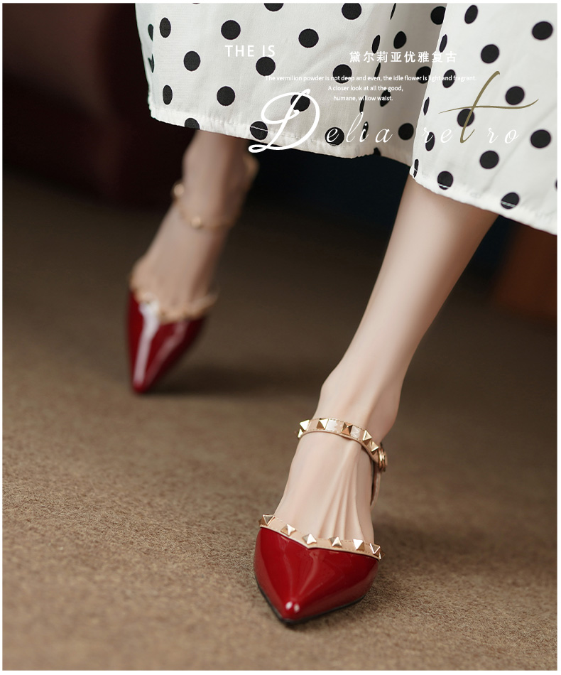 유럽 역 2025 봄과 여름 새로운 프랑스 Chunky Heel Baotou 샌들 여성용 뾰족한 발가락 리벳 얕은 특허 가죽 신발