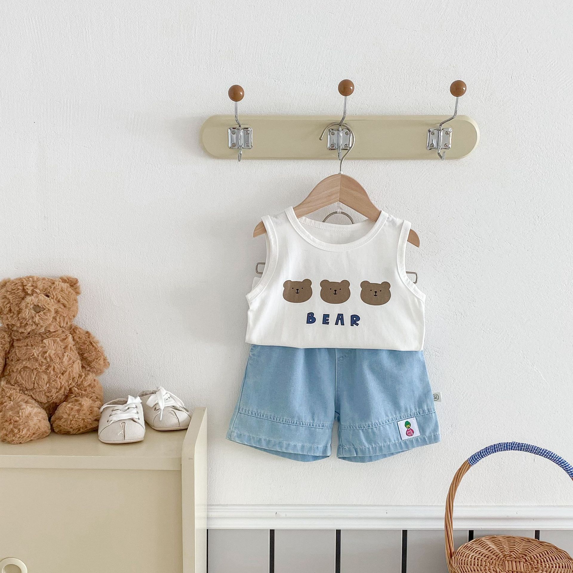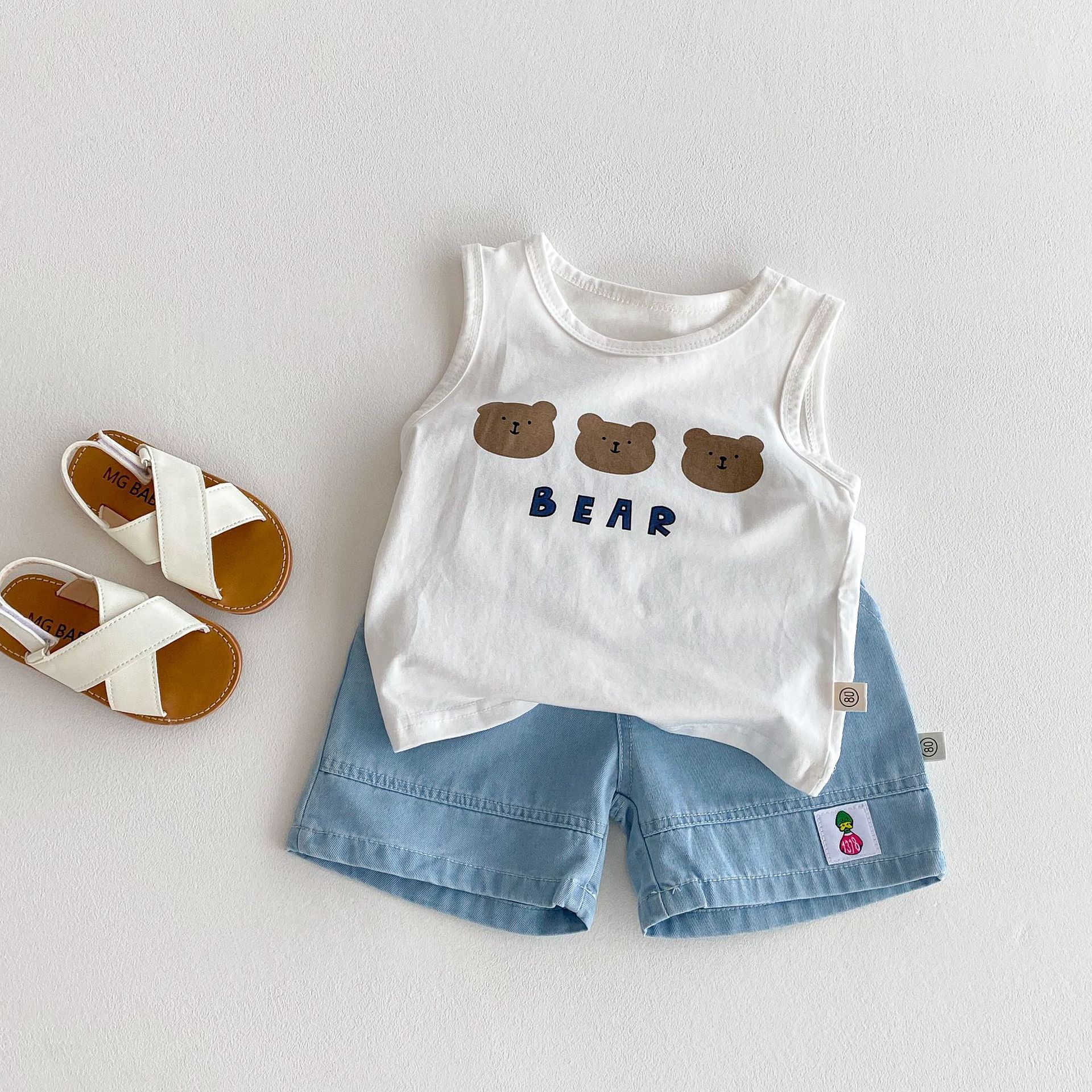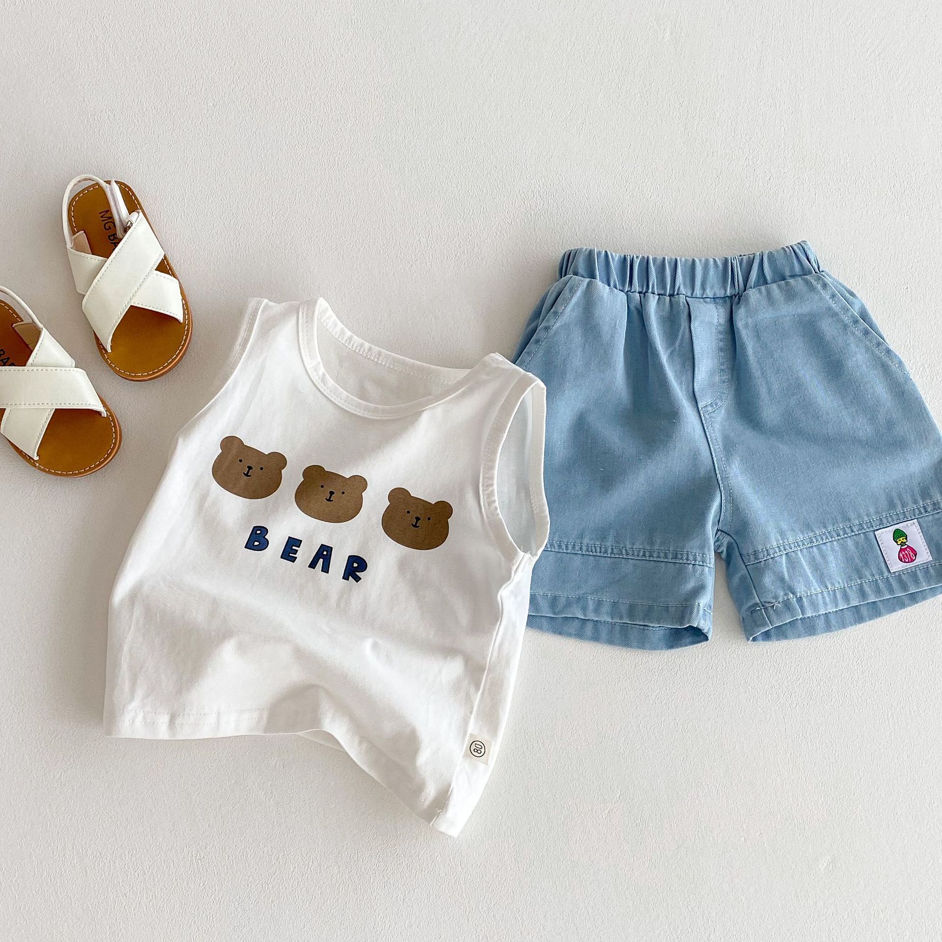 새로운 어린이 여름 조끼 최고 데님 반바지 세트 소년 아기 만화 민소매 외부는 투피스 얇은 세트스토어 가기